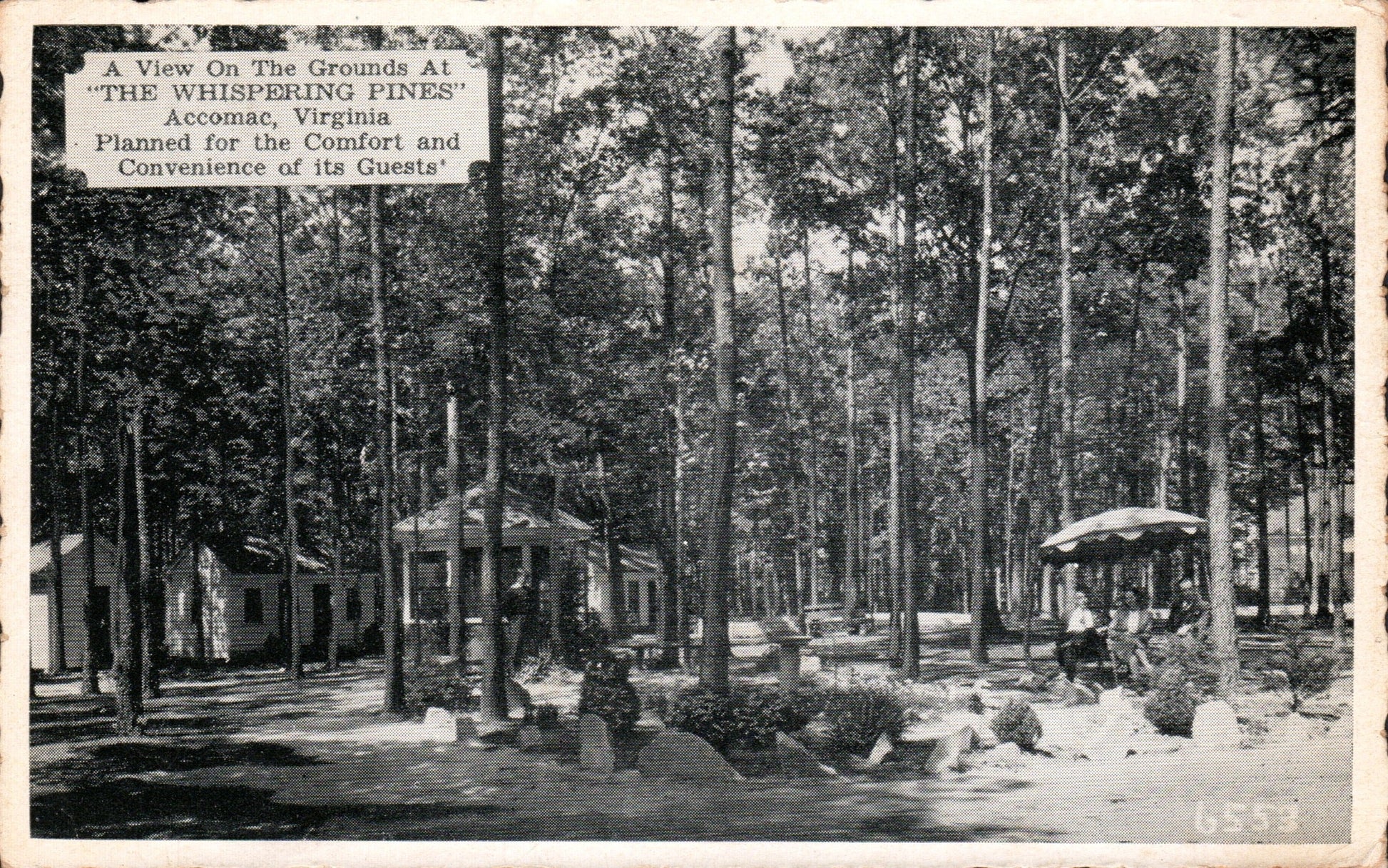 Tasley 1939 4-bar on post card, view of “The Whispering Pines, Accomac, Virginia” camping grounds]