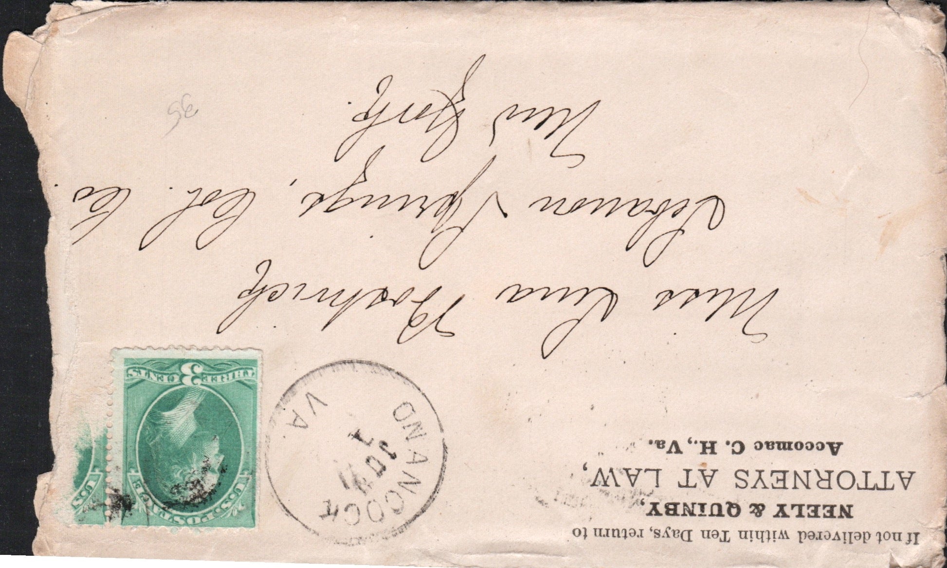 Onancock 1882 cds on cover, printed corner “Neely & Quinby, Attorneys at Law, Accomac C.H.” with original letter; 1973 machine cancel on cover
