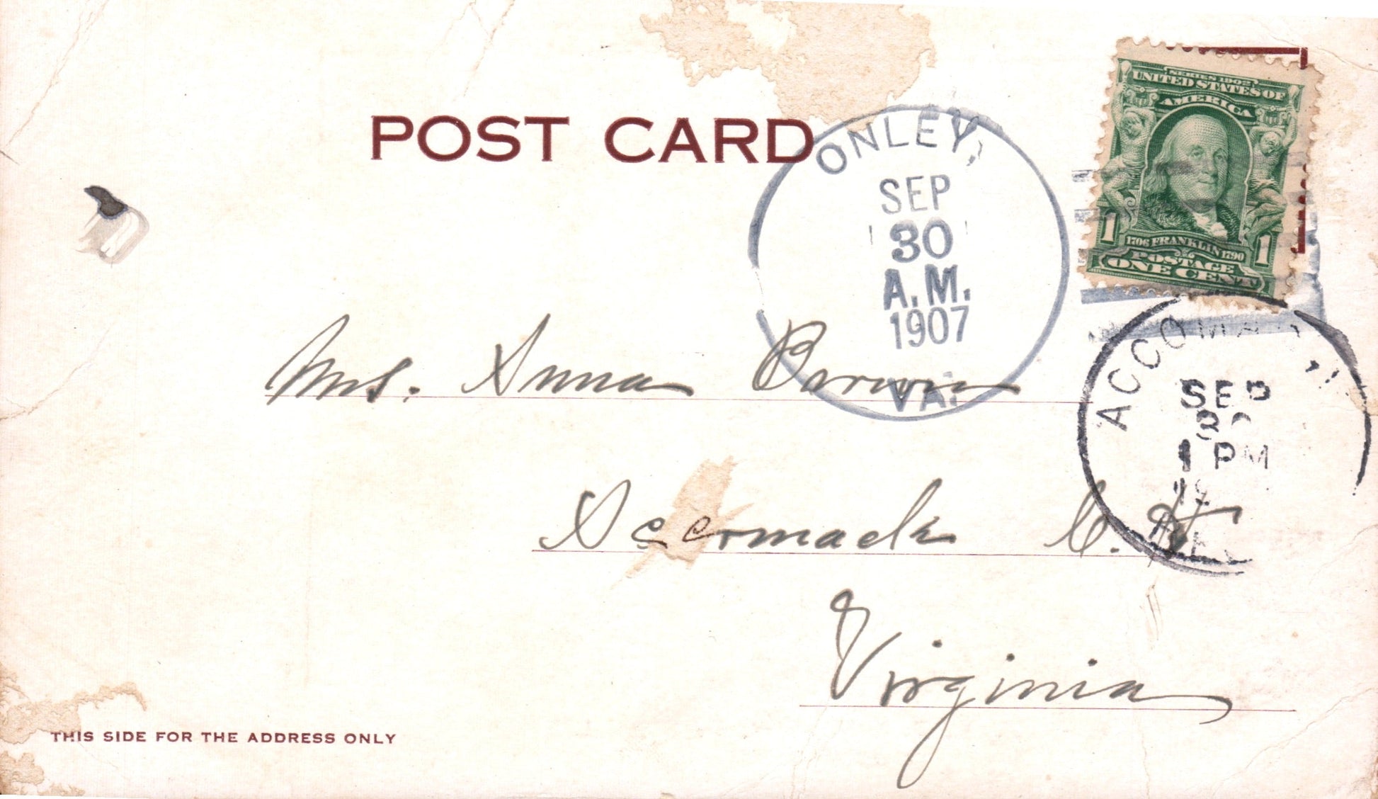 Onley 1907 4-bar on post card [view on “Christ P.E. Church, Eastville”], Accomac same-day rec. mark.