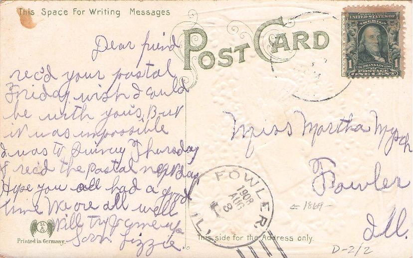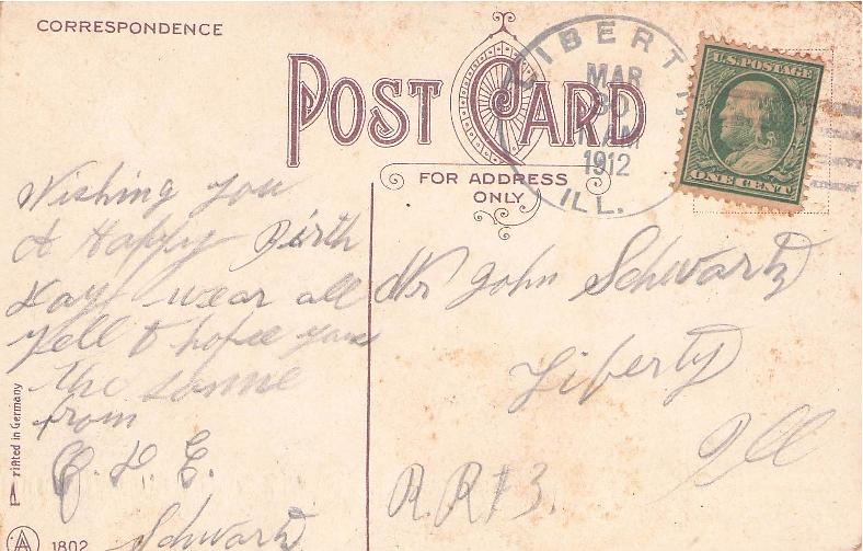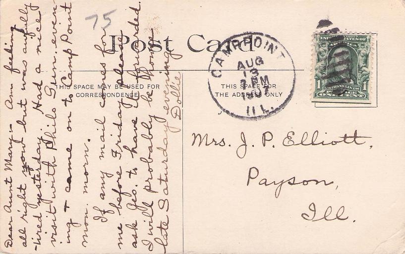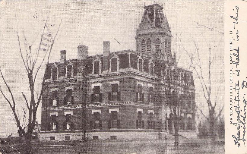 - Camp Point 1907 duplex on post card, view of Maplewood High School in Camp Point; 1910 cds with Chicago precancel stamp on post card