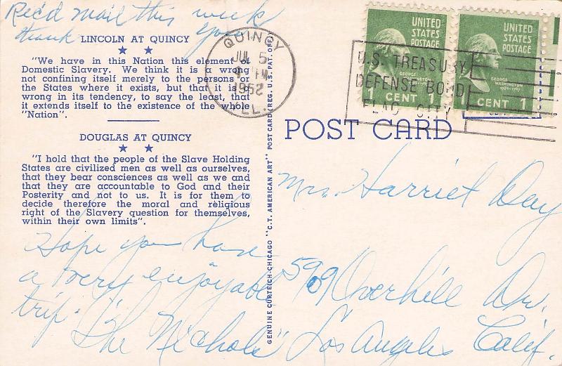 - Quincy 1945 Quincy Transfer Office duplex on post card; 1952 machine slogan for Defense Bonds on cover; 1970 machine slogan for Children’s Dental Health on cover; 1984 machine cancel on cover.