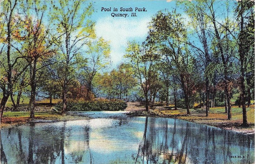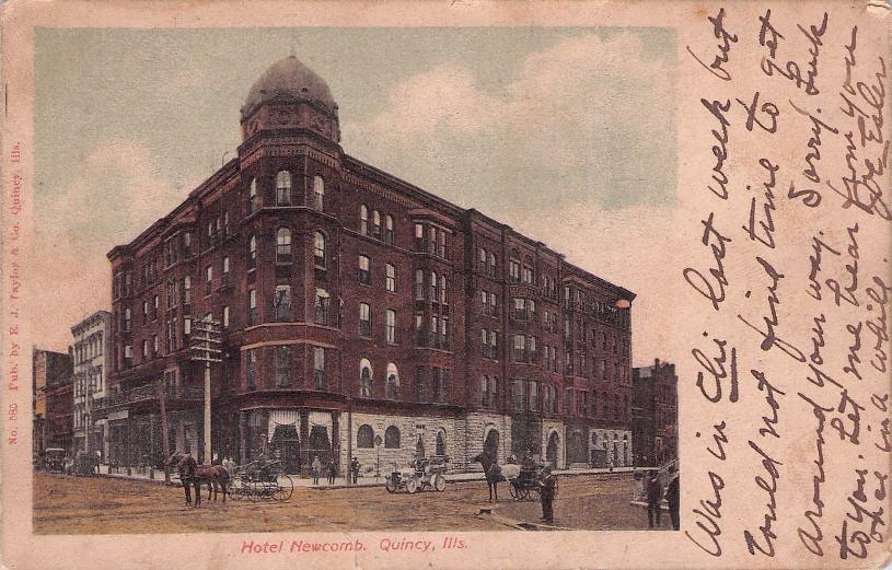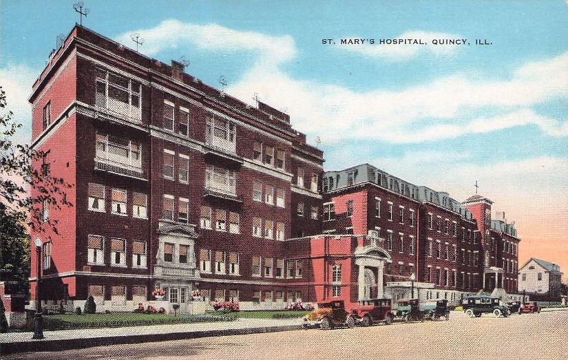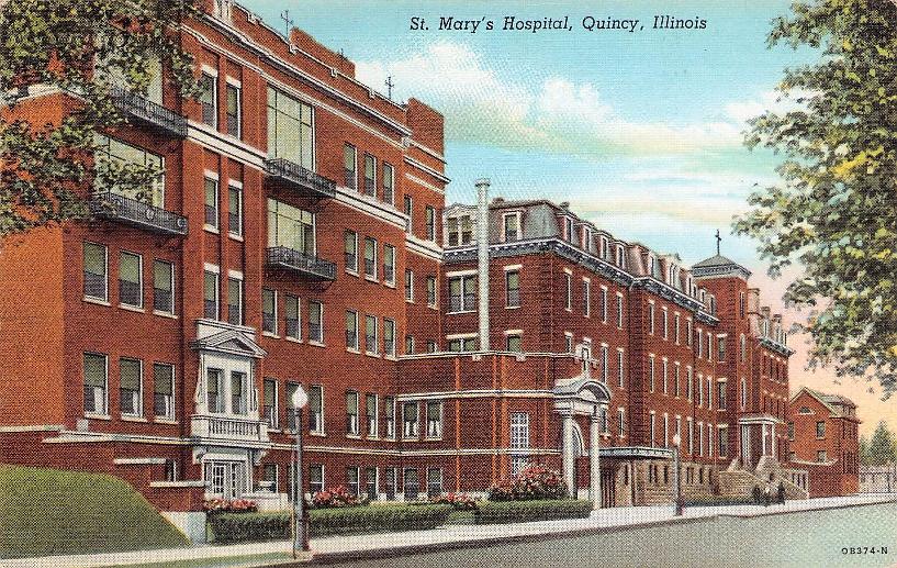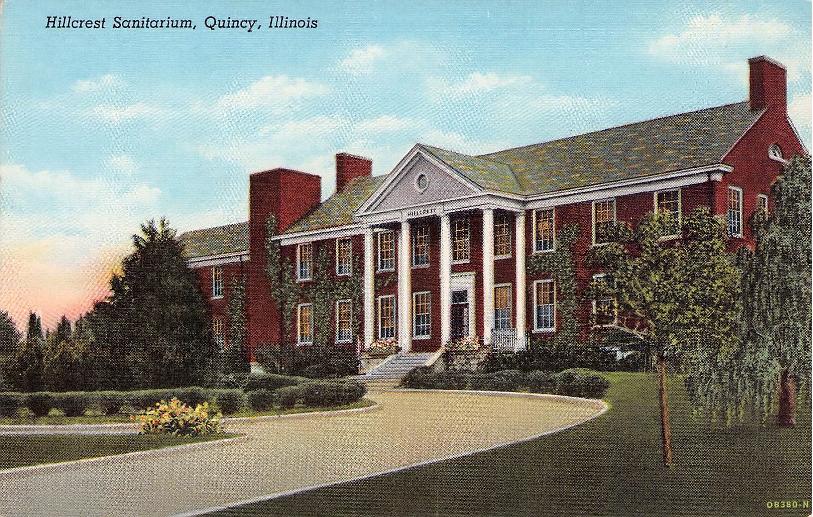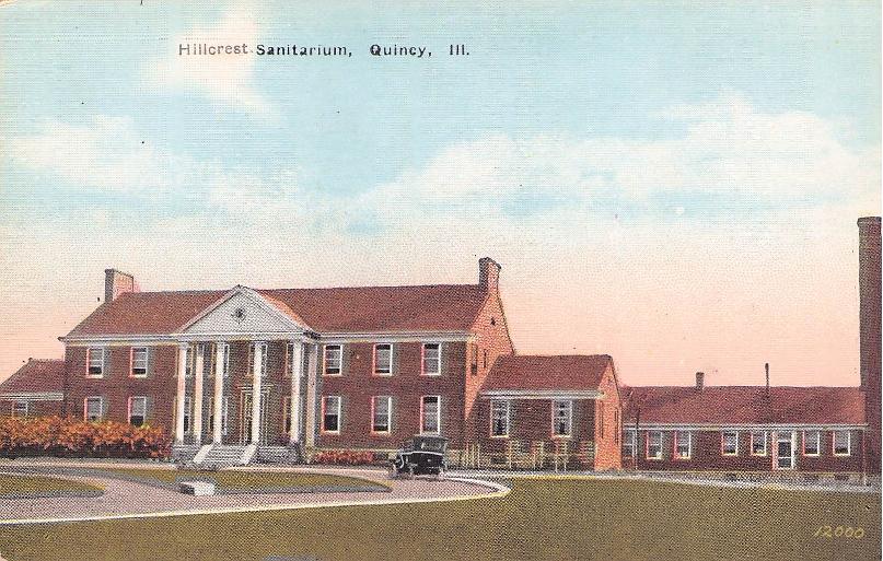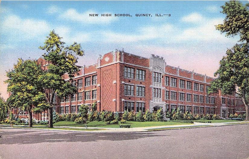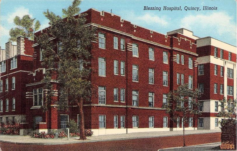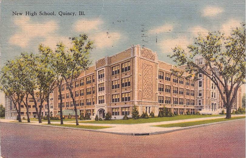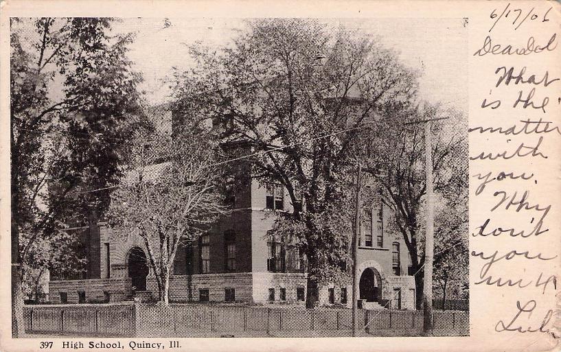 - Post cards: Illinois State Bank [c.1930]; Hotel Newcomb [c.1905, 2 horse-drawn vehicles, small tear bottom repaired by tape; Park Hotel & coffee shop [sepia, c.1930]; Blessing Hospital [linen]; St. Mary’s Hospital 2 linen views]; Hillcrest Sanitarium [2 views c.1930]; Post office, with 5 horse-drawn vehicles [c.1905]; Post office and Custom House [linen]; Franklin School [sepia, 1907]; High School (1906); New High School (2 linen views, one1938); First Christian church [linen]; Municipal Bathing Pool [linen]; 3 linen South Park scenes; Mississippi River Dam no. 21 [linen]; New Soldiers Memorial Bridge [linen]