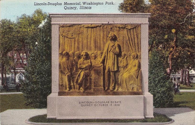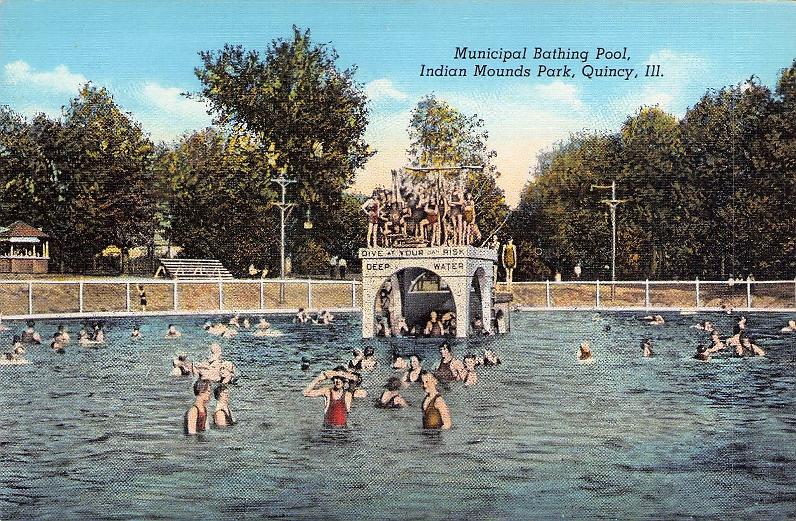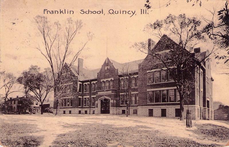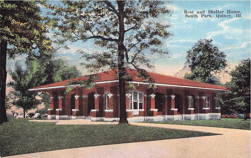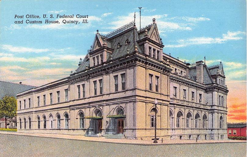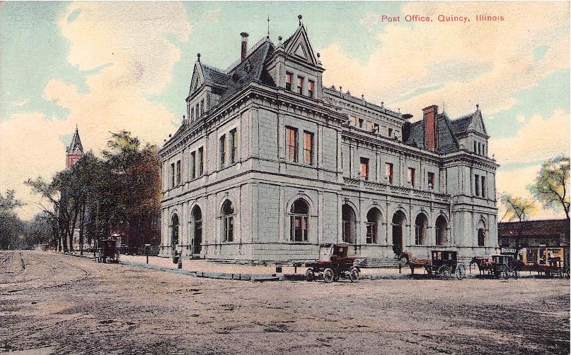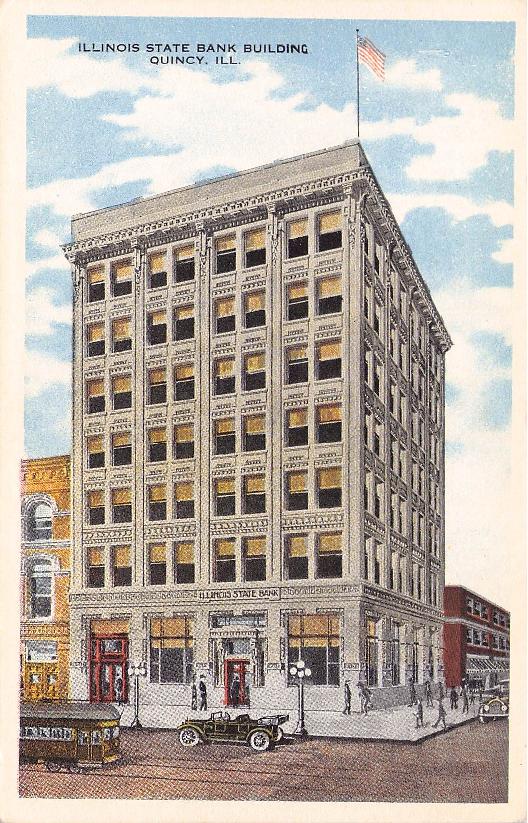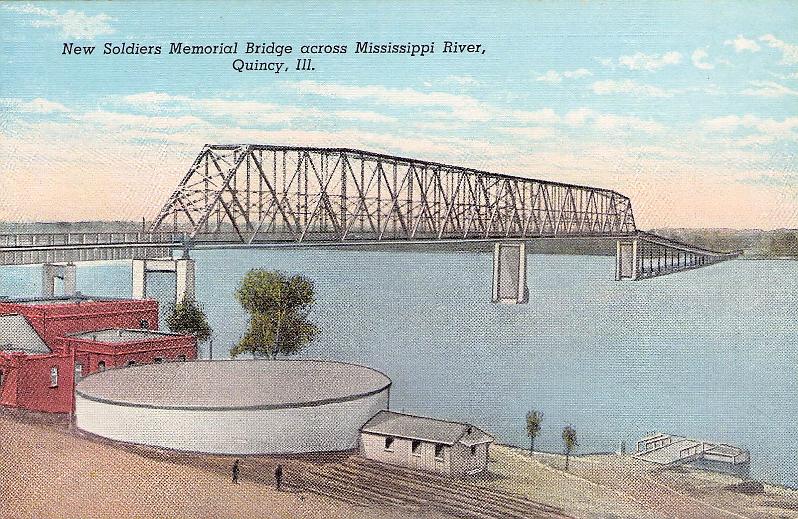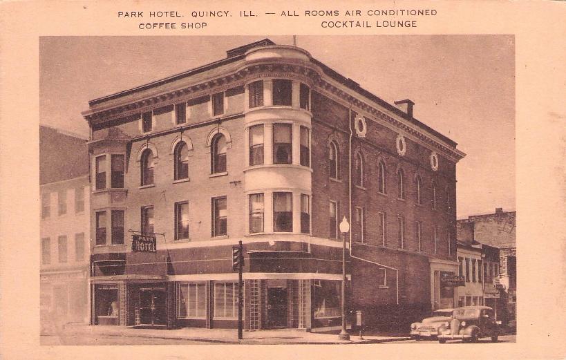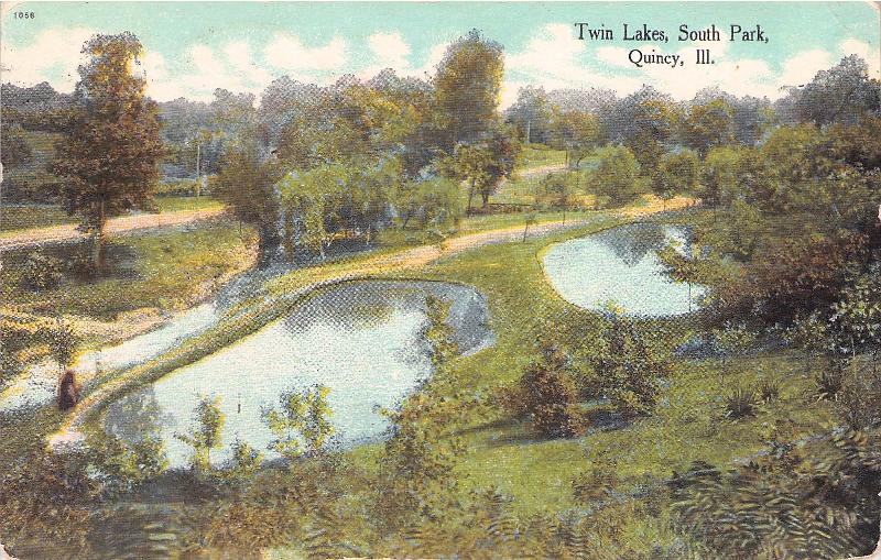 - Post cards: Illinois State Bank [c.1930]; Hotel Newcomb [c.1905, 2 horse-drawn vehicles, small tear bottom repaired by tape; Park Hotel & coffee shop [sepia, c.1930]; Blessing Hospital [linen]; St. Mary’s Hospital 2 linen views]; Hillcrest Sanitarium [2 views c.1930]; Post office, with 5 horse-drawn vehicles [c.1905]; Post office and Custom House [linen]; Franklin School [sepia, 1907]; High School (1906); New High School (2 linen views, one1938); First Christian church [linen]; Municipal Bathing Pool [linen]; 3 linen South Park scenes; Mississippi River Dam no. 21 [linen]; New Soldiers Memorial Bridge [linen]
