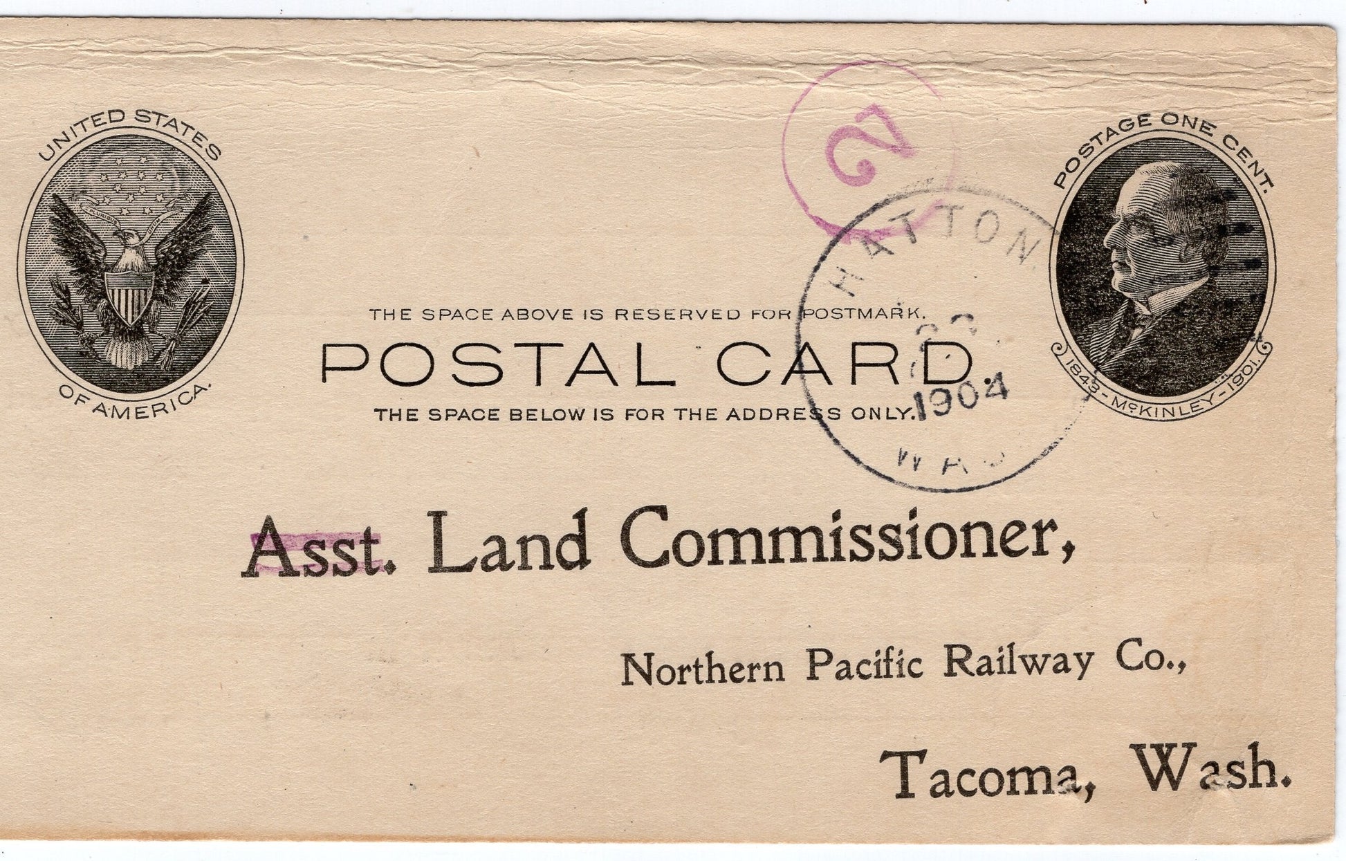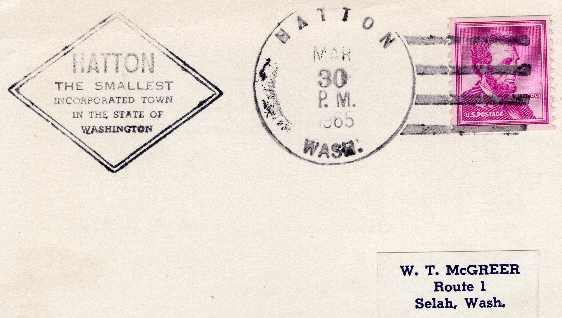 - Hatton (1898-1975) 1904 duplex on postal card to Northern Pacific RR Land Commissioner, a bit worn; 1965 4-bar on 3x5 card