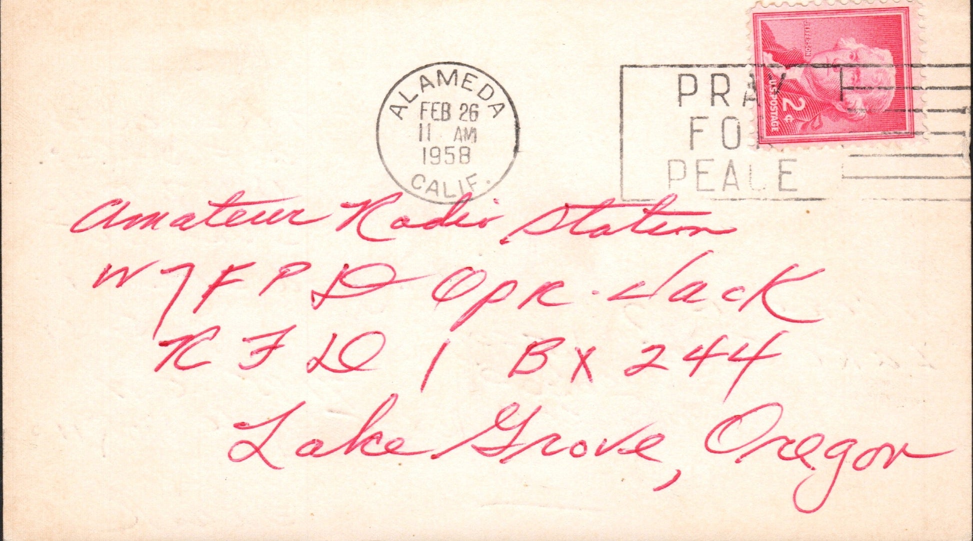 Alameda 1958 machine slogan “Pray for Peace” on ham radio post card; 1959 machine cancel on cover; 1970 machine cancel on cover