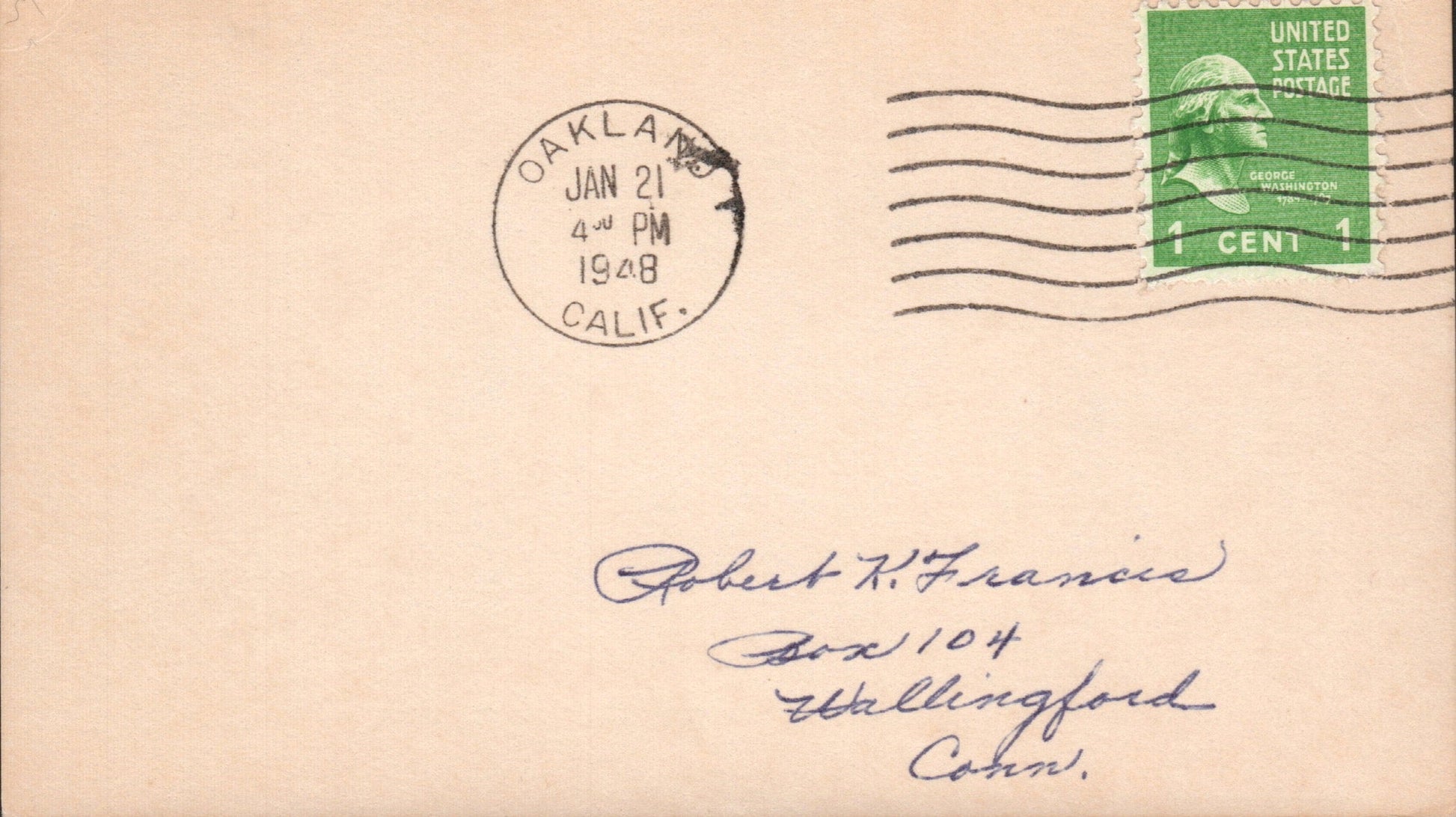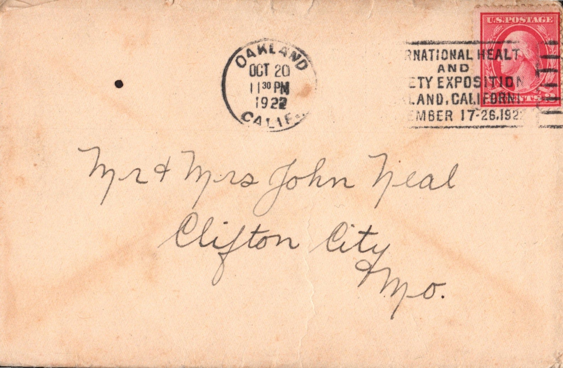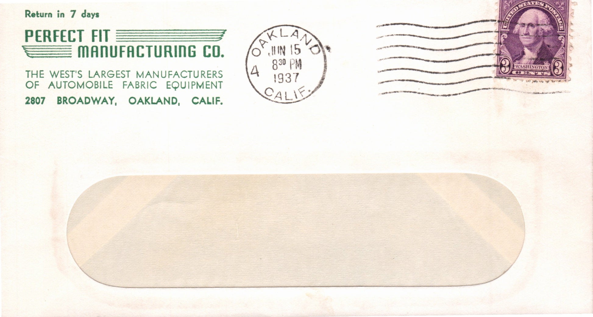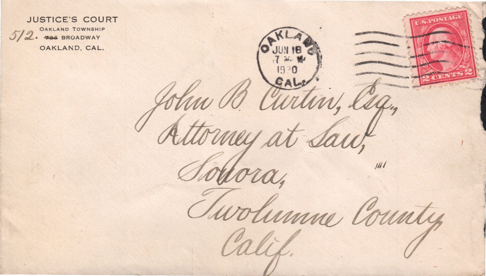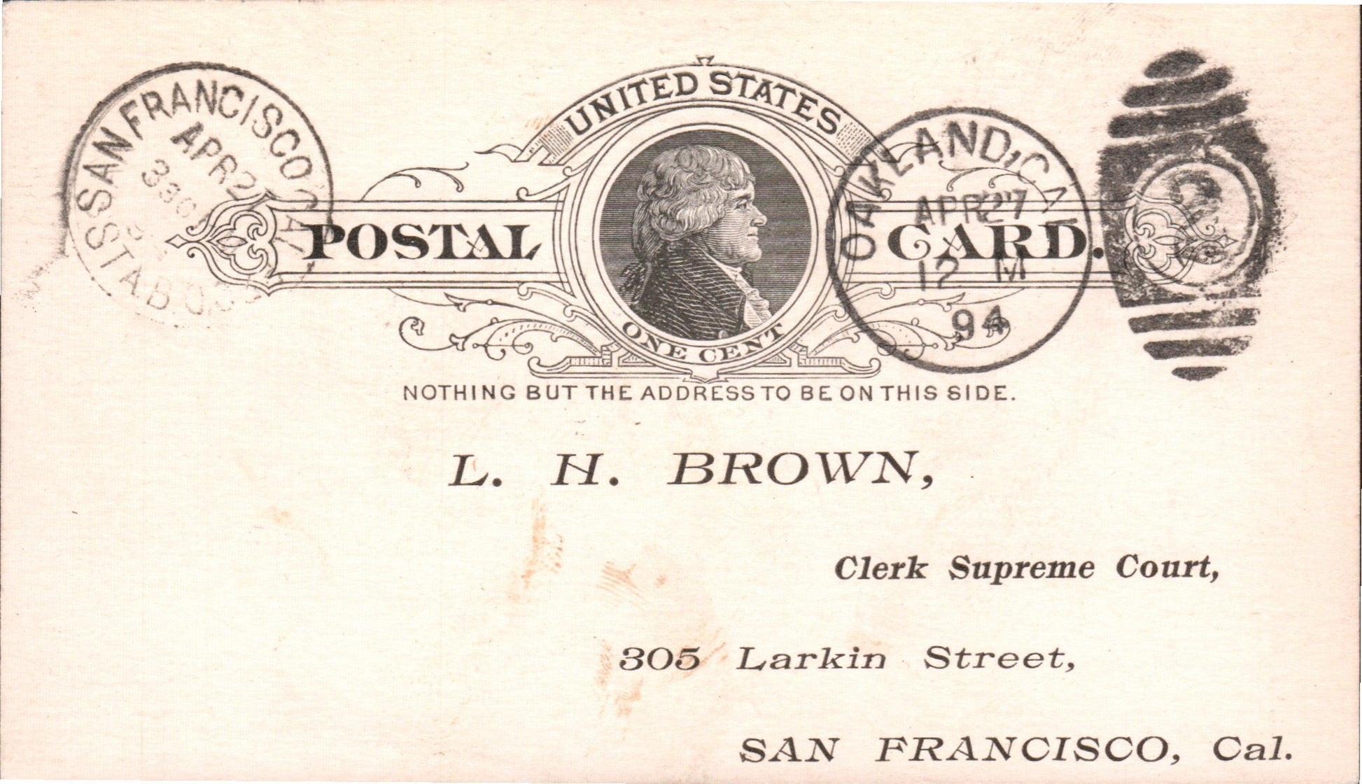 Oakland 1894 duplex 2 on Postal card; 1895 duplex on cover, corner “General Relief Committee I.O.O.F.”; 1912 machine slogan “World’s Panama-Pacific Exposition in San Francisco 1915”; 1920 machine cancel, “Justice’s Court” corner; 1922 machine slogan [incomplete] for Health Exposition in Oakland on cover including letter; 1932 machine cancel dial 3 on cover; 1937 machine cancel dial 2 on cover; 1937 machine cancel dial 3 on cover, “Perfect Fit Manufacturing Co.” corner; 1938 machine slogan “Air Mail Saves Time” on cover; 1942 machine slogan “Buy Defense Savings Bonds and Stamps” on window envelope, corner “Hap Alzina, Indian Motorcycles, Johnson Outboard Motors”; 1948 machine cancel on cover; 1949 machine cancel dial 5 on cover; 1950 machine cancel dial 2 on cover; 1952 duplex on cover; 1952 machine cancel dial 4 on cover; 1962 machine cancel dial 3 on cover; 1965 (3 diff. machine dials, 2 of which are overstruck); 1969 4-bar on cover