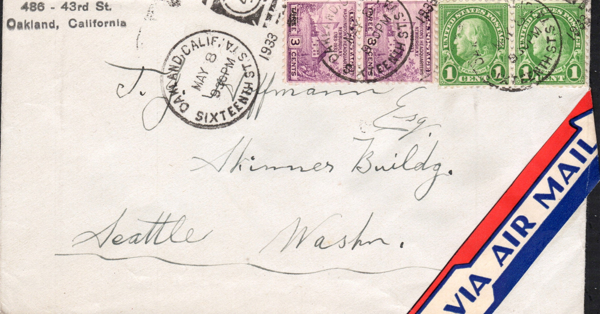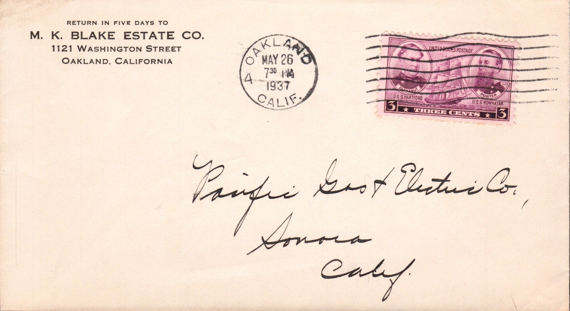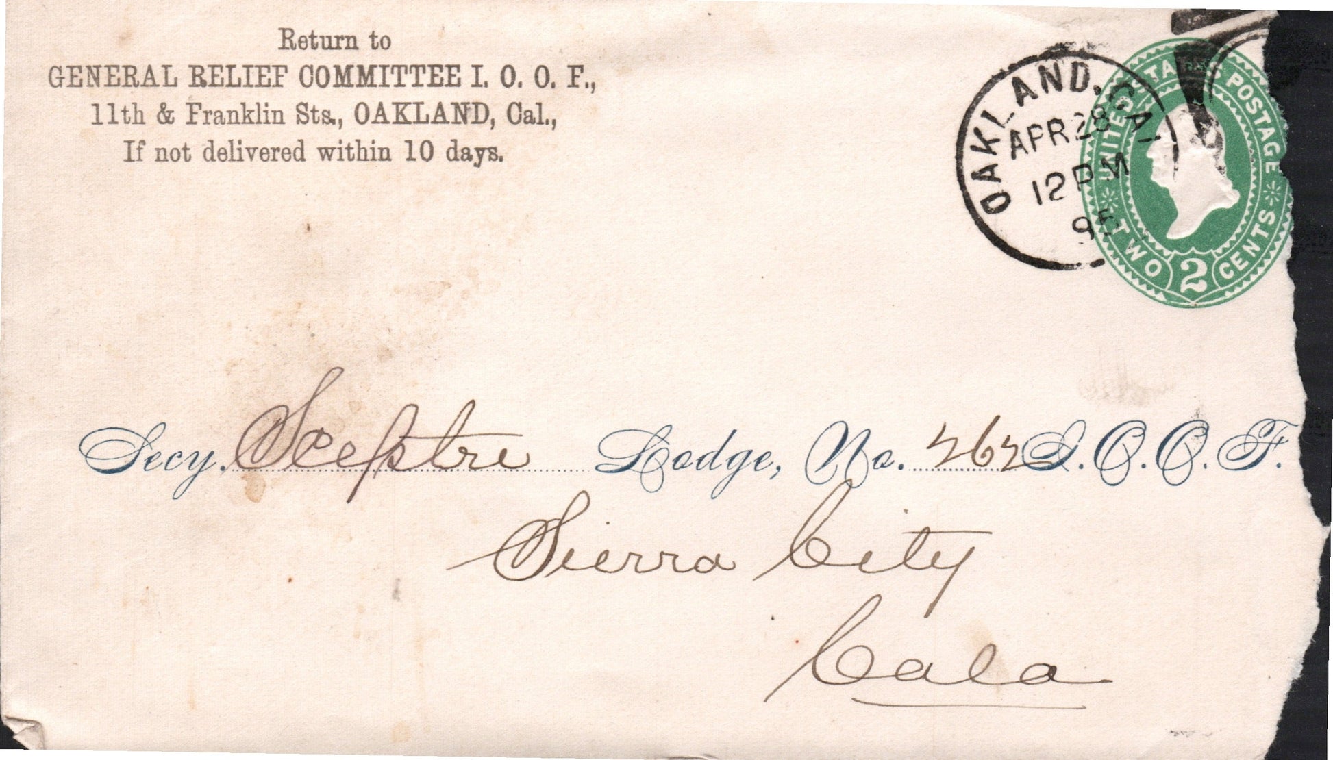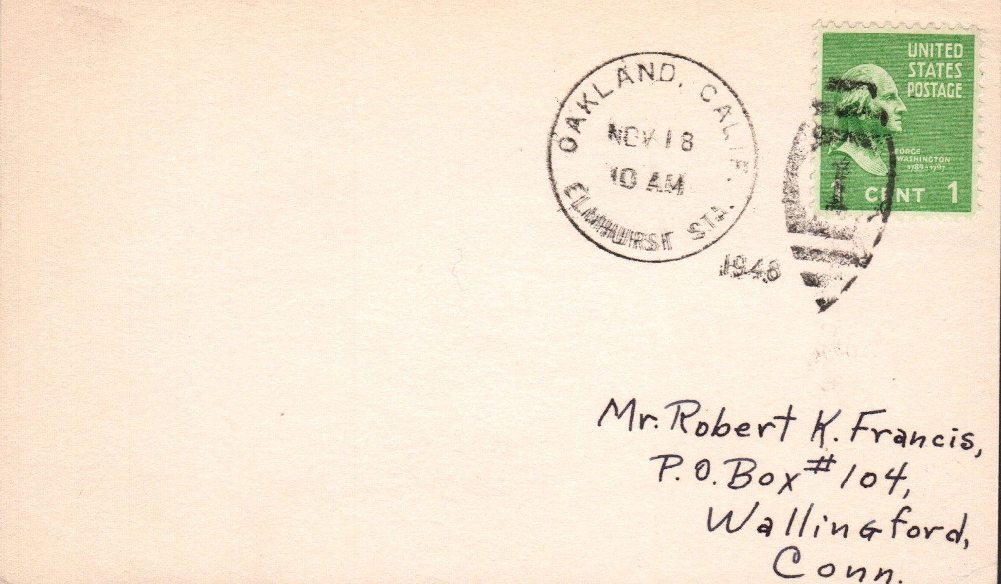 Oakland 1894 duplex 2 on Postal card; 1895 duplex on cover, corner “General Relief Committee I.O.O.F.”; 1912 machine slogan “World’s Panama-Pacific Exposition in San Francisco 1915”; 1920 machine cancel, “Justice’s Court” corner; 1922 machine slogan [incomplete] for Health Exposition in Oakland on cover including letter; 1932 machine cancel dial 3 on cover; 1937 machine cancel dial 2 on cover; 1937 machine cancel dial 3 on cover, “Perfect Fit Manufacturing Co.” corner; 1938 machine slogan “Air Mail Saves Time” on cover; 1942 machine slogan “Buy Defense Savings Bonds and Stamps” on window envelope, corner “Hap Alzina, Indian Motorcycles, Johnson Outboard Motors”; 1948 machine cancel on cover; 1949 machine cancel dial 5 on cover; 1950 machine cancel dial 2 on cover; 1952 duplex on cover; 1952 machine cancel dial 4 on cover; 1962 machine cancel dial 3 on cover; 1965 (3 diff. machine dials, 2 of which are overstruck); 1969 4-bar on cover