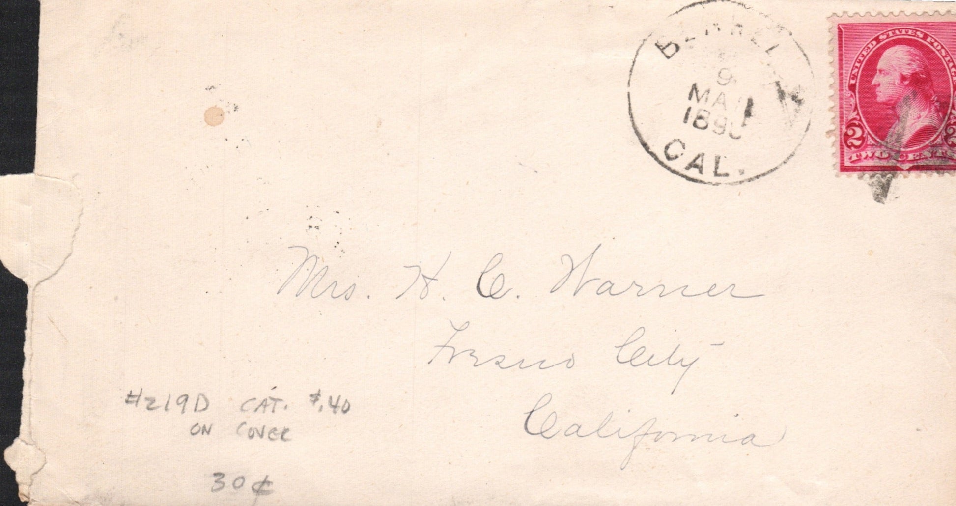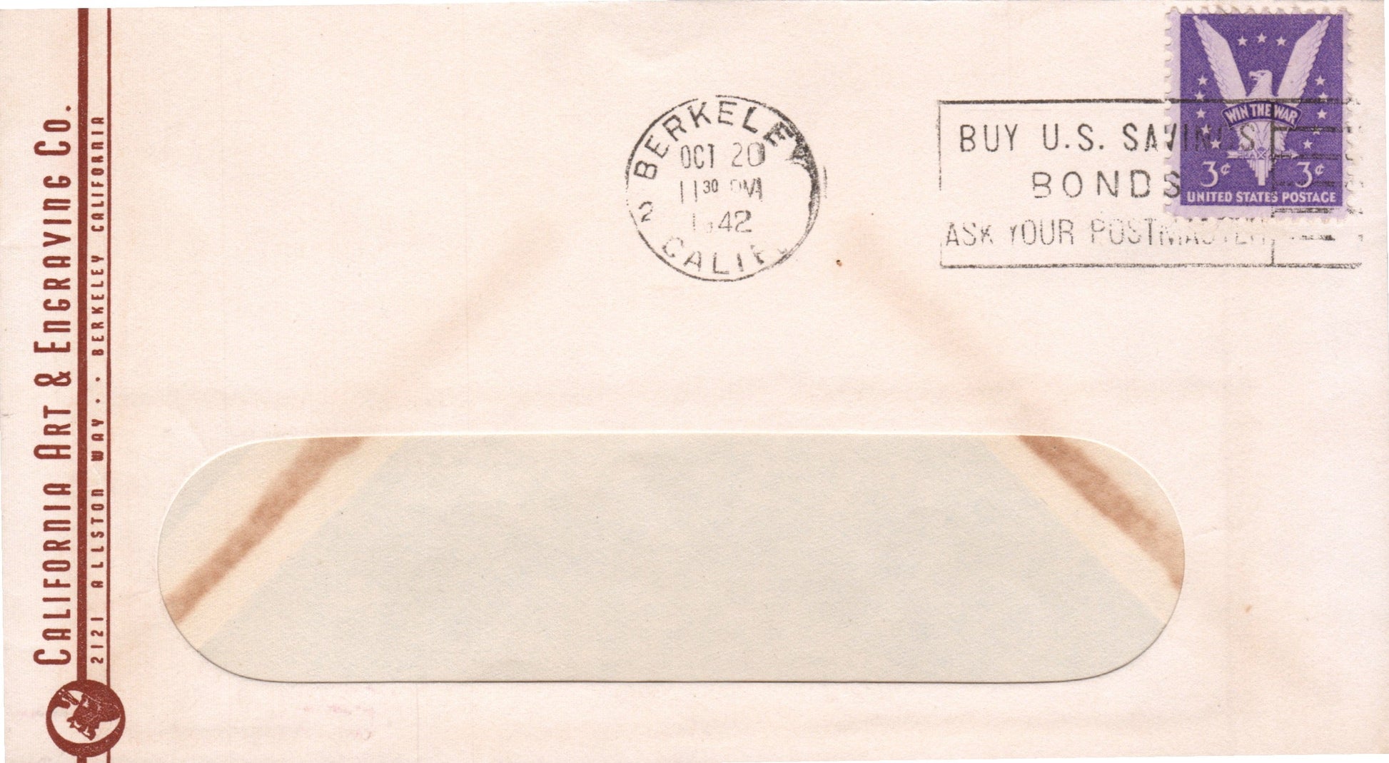 Berkeley poor 1890 cds on cover; poor 1902 duplex on cover; 1907 8 Flag cancel on post card; 1926 machine cancel on Postal Card; 1936 machine slogan “Buy U.S. Savings Bonds” on cover; 1942 machine slogan “Buy U.S. Savings Bonds” [diff. die] on cover; 1965 machine cancel on cover