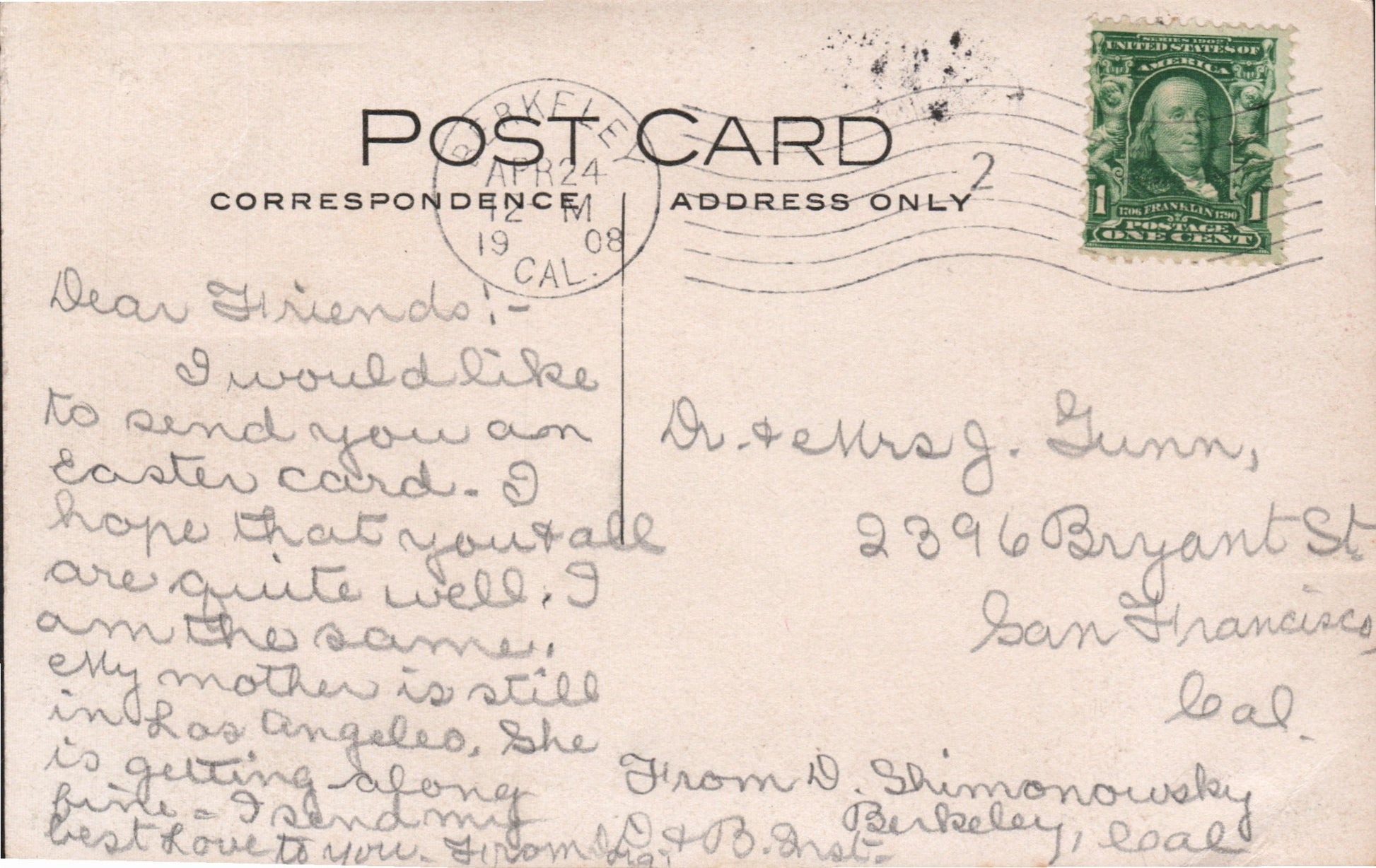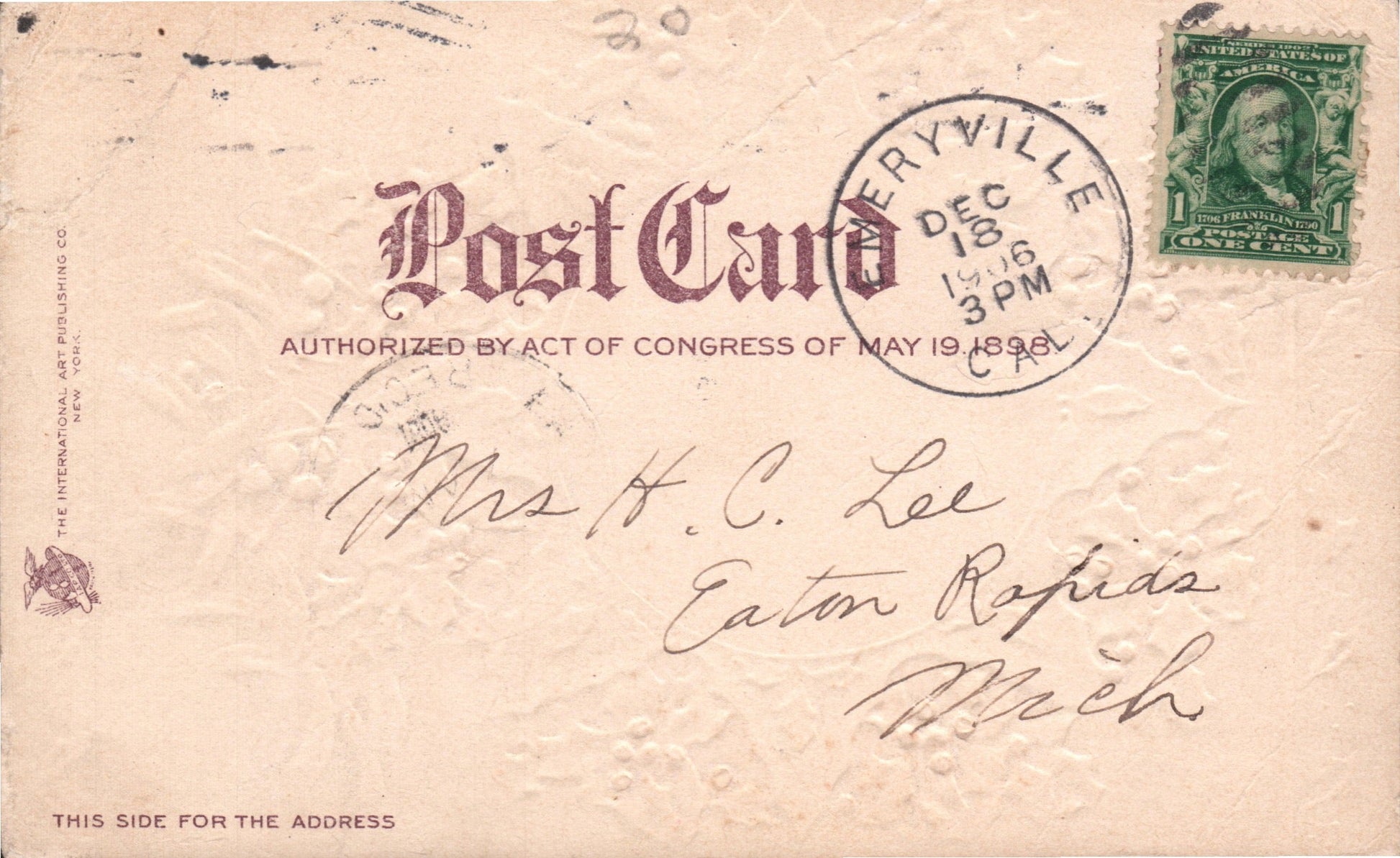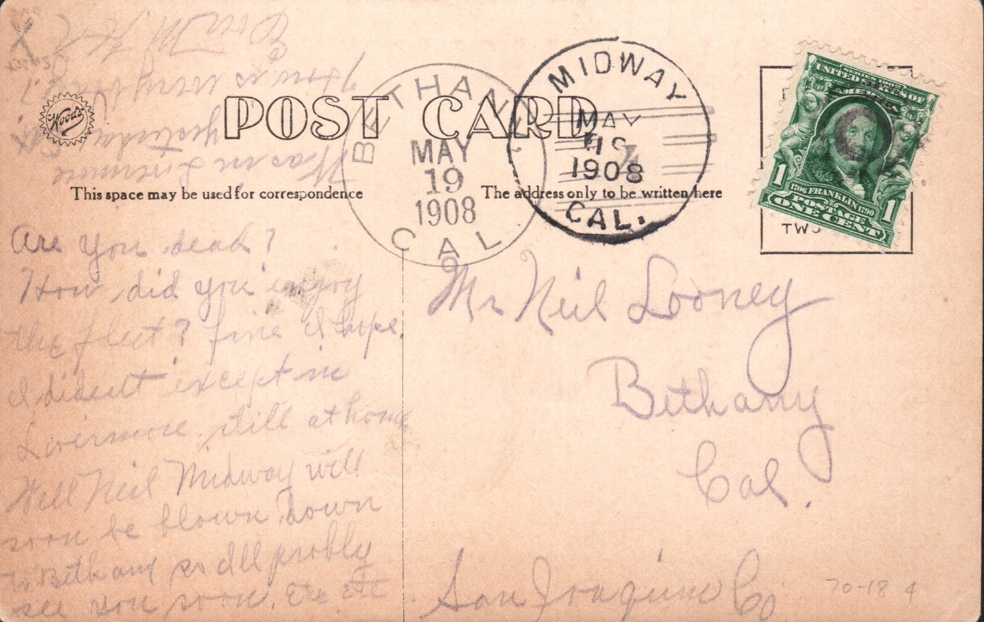 Midway (1870-1918) 1908 cds & target killer overstruck Bethany, Cal. Doane 4 as rec’g strike on post card