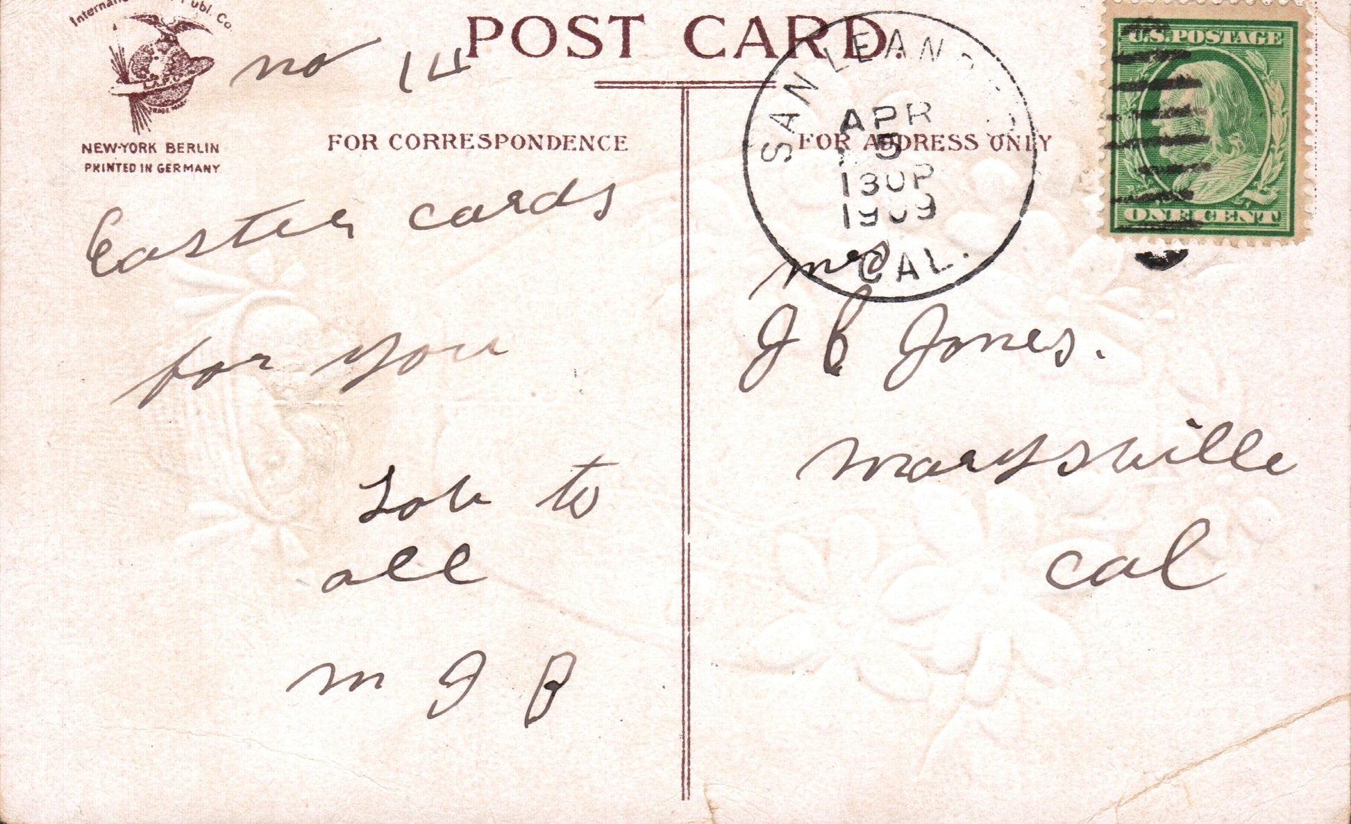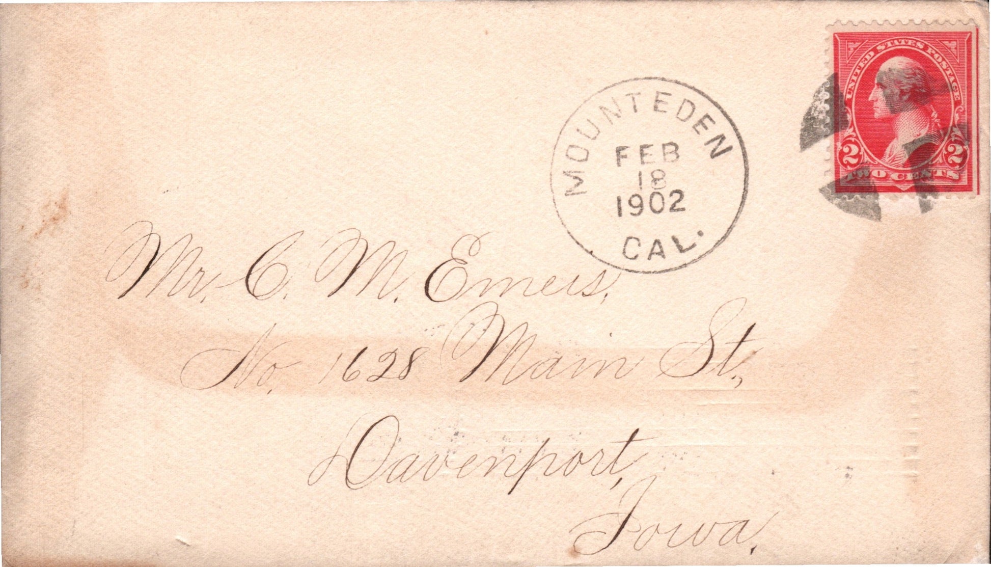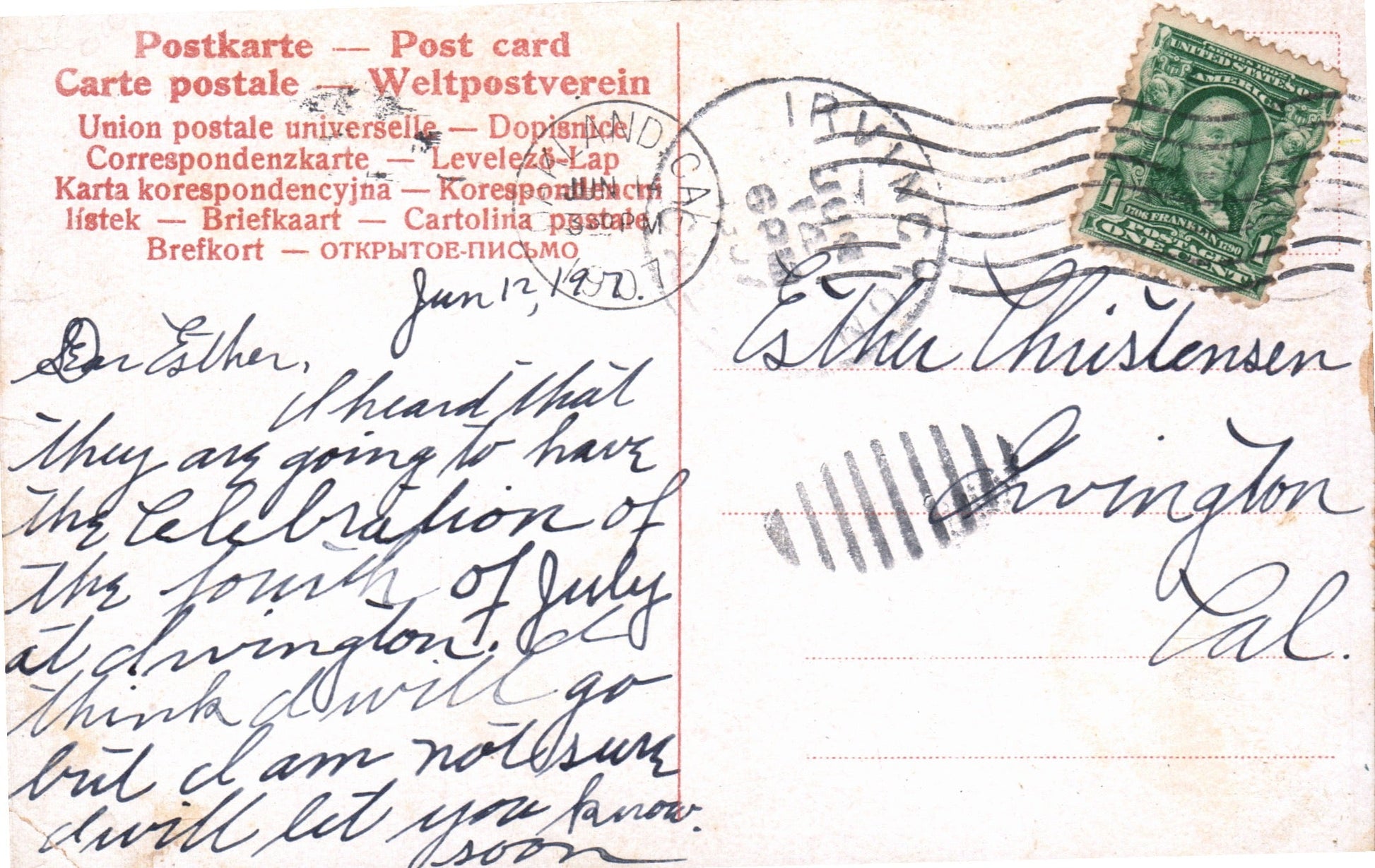 Midway (1870-1918) 1908 cds & target killer overstruck Bethany, Cal. Doane 4 as rec’g strike on post card