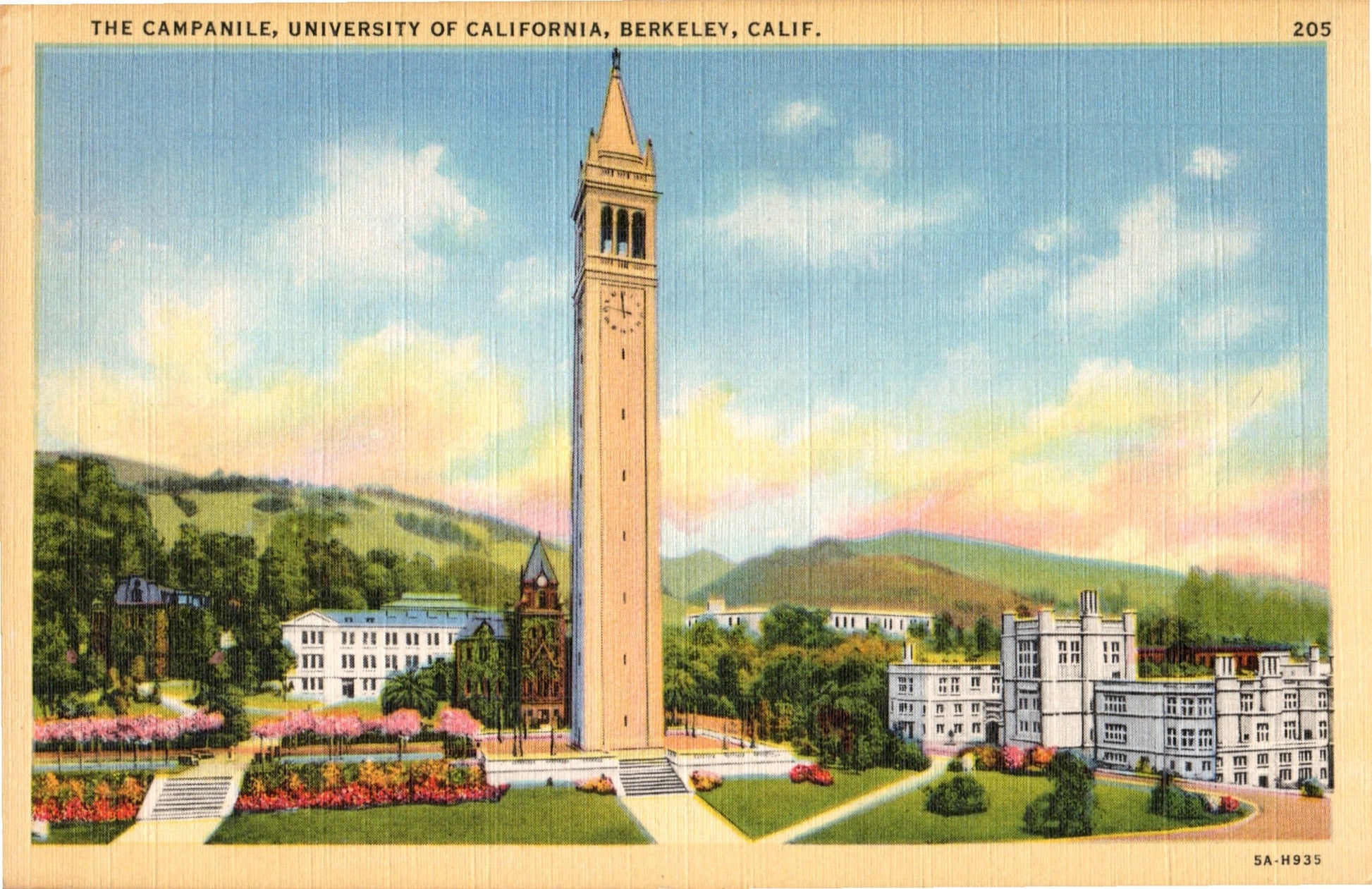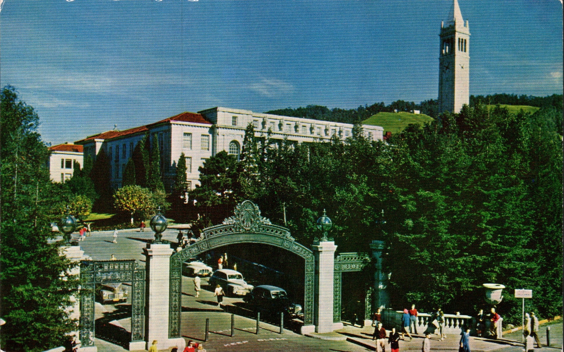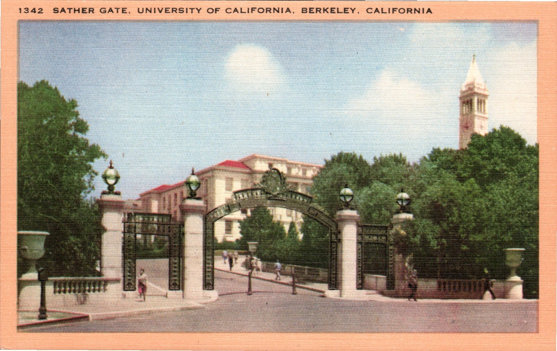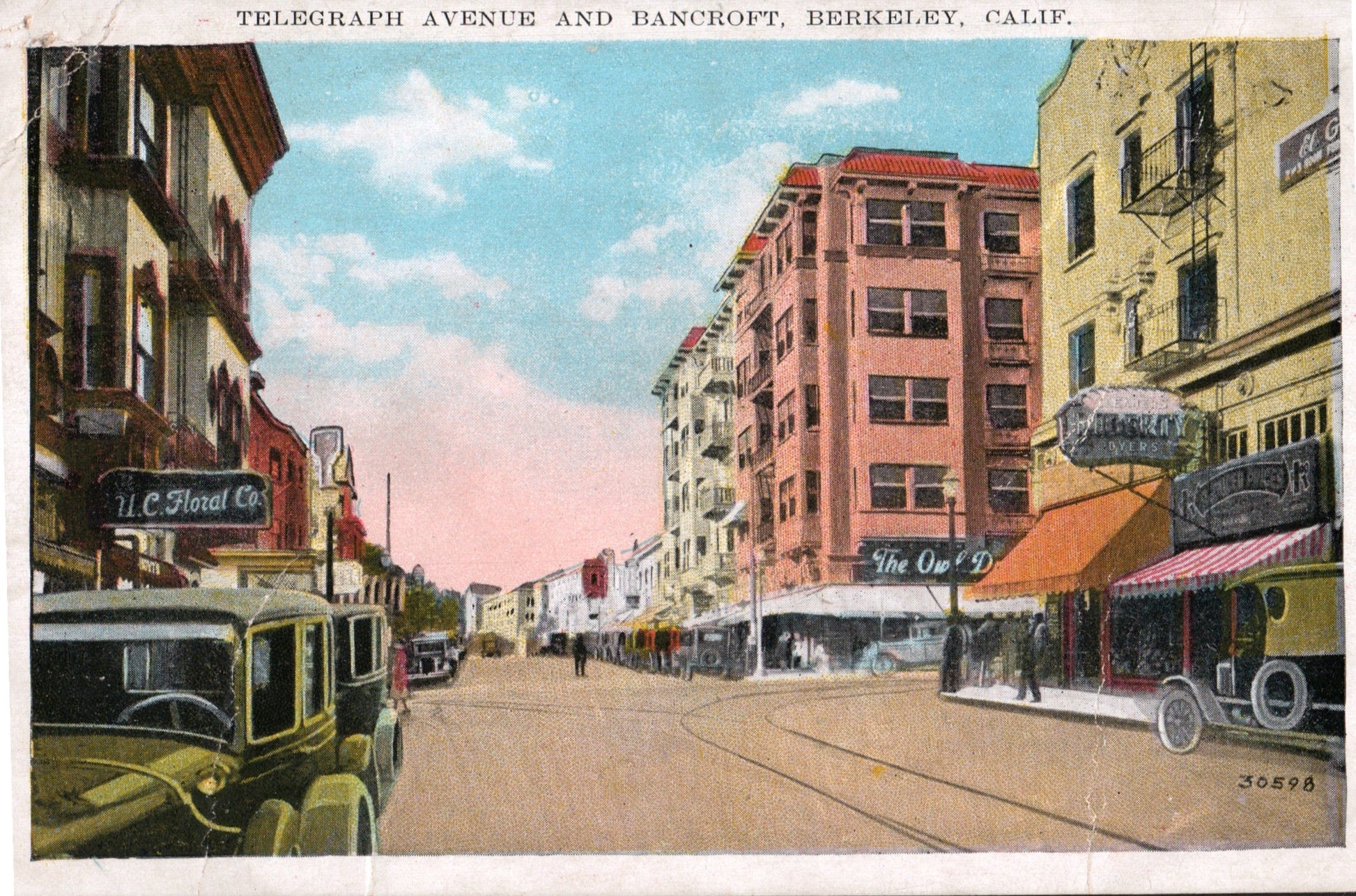 Post cards: “Telegraph Avenue and Bancroft” on post card [white border, 1930s]; Univ. of Calif. 8 campus scenes [1 sepia, 1 real photo, 3 linen, 3 chrome]