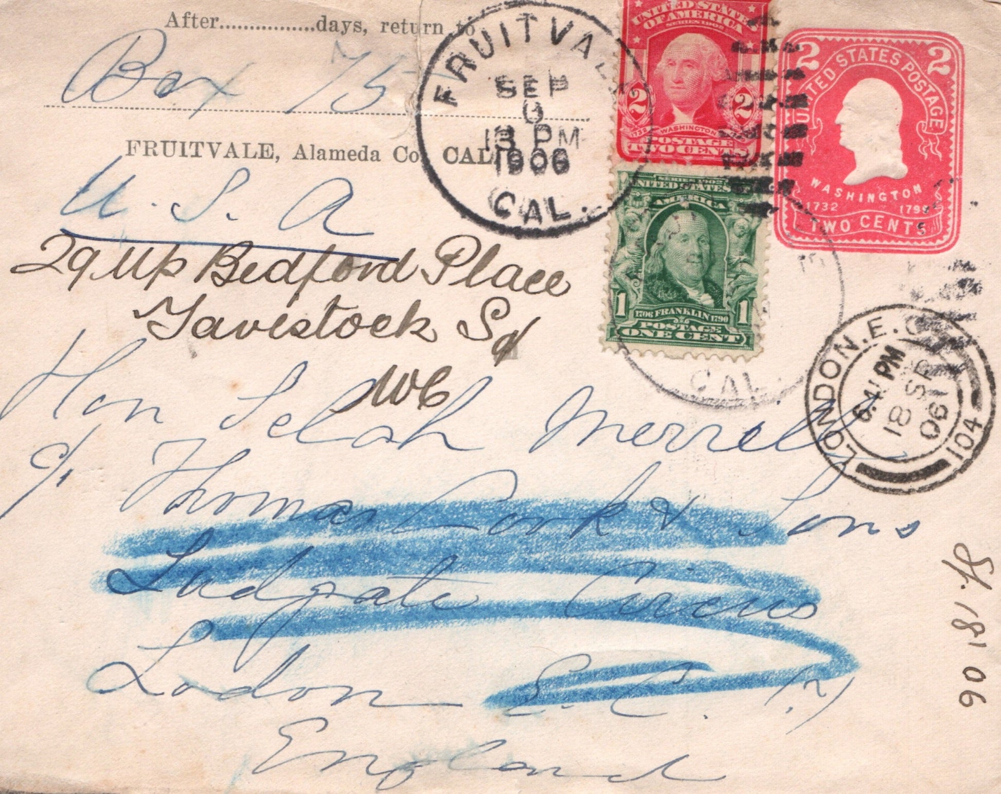 Fruitvale (1892-1907) 1906 duplex on damaged cover to England, also London rec’g mark