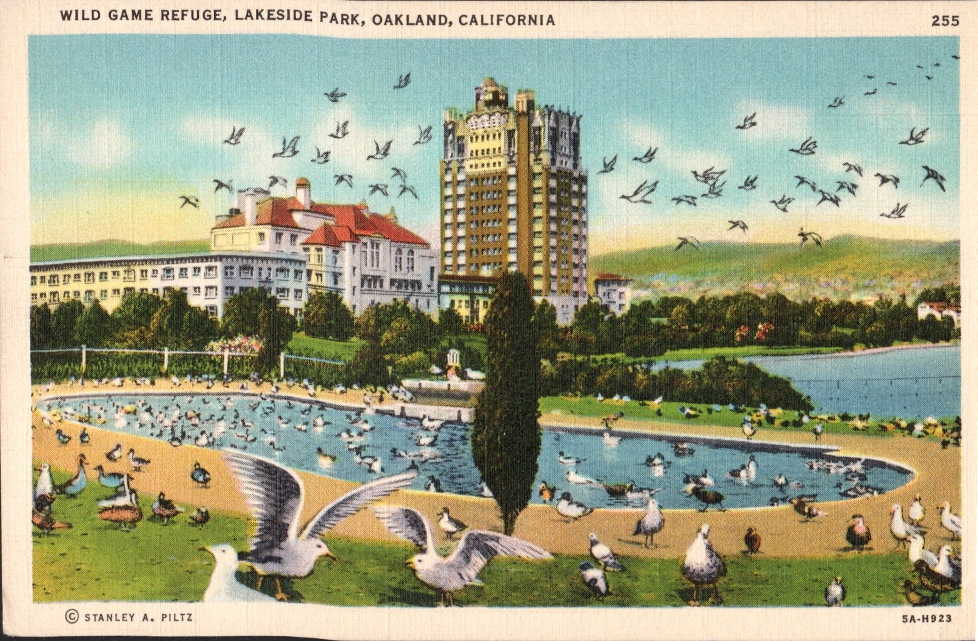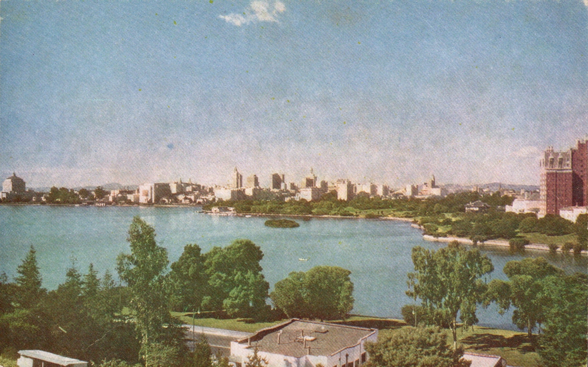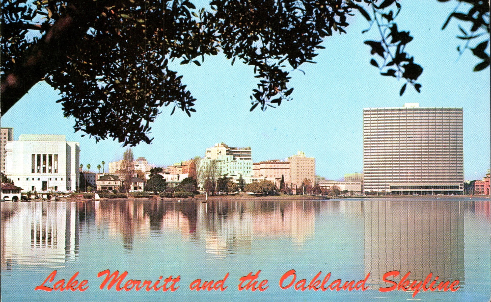 Post cards: overview [chrome]; Skyline [chrome]; Downtown from Bay [chrome]; Washington St. [c.1905]; Lake Merritt [chrome]; Lakeside Park [linen]; “Heinold’s First and Last Cha nce” saloon; “Joaquin Miller... at his home” [1915?]; Jack London Village [chrome]; California Garden Show [chrome]