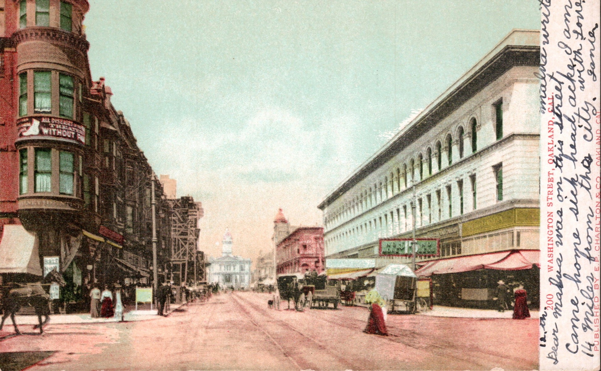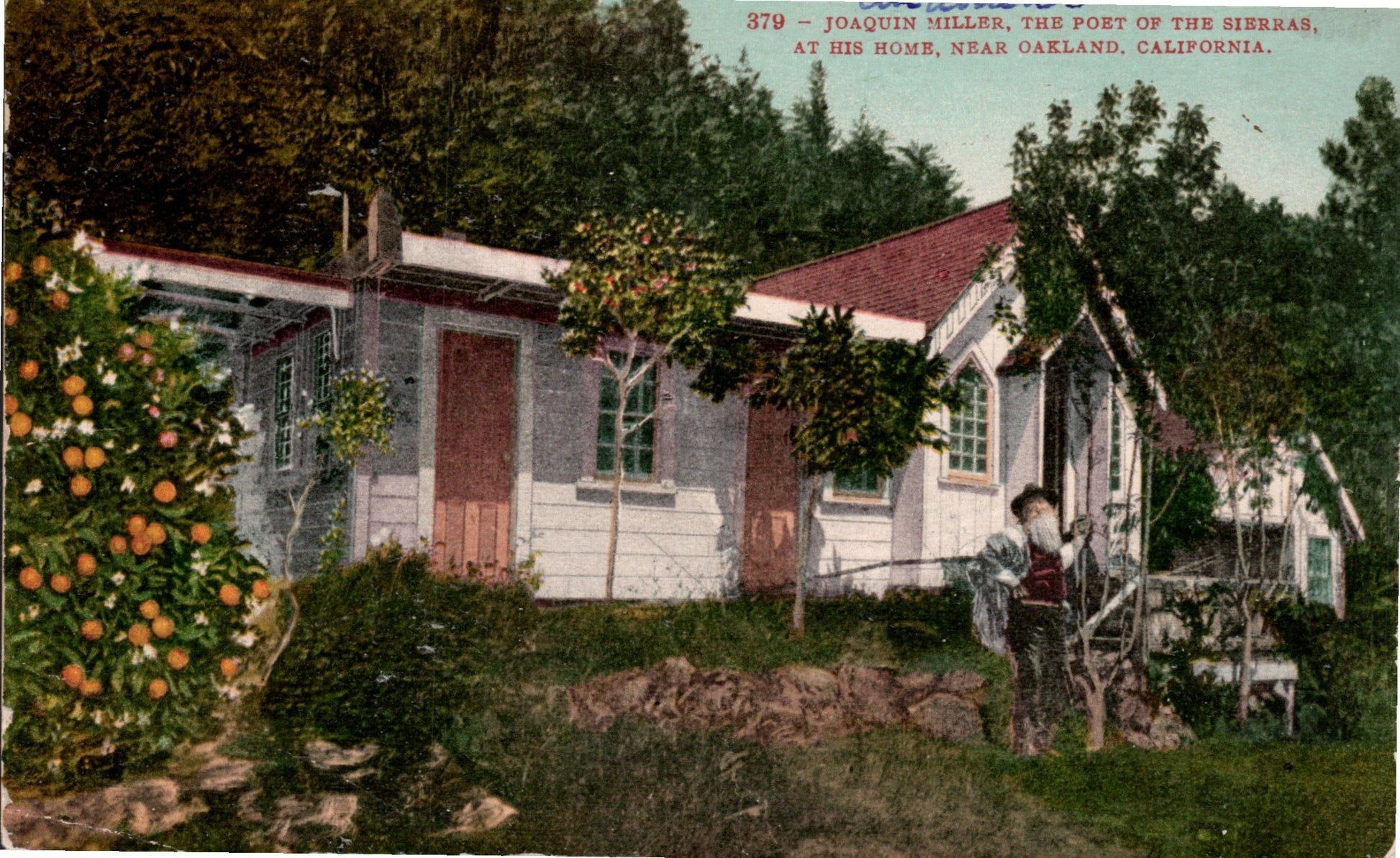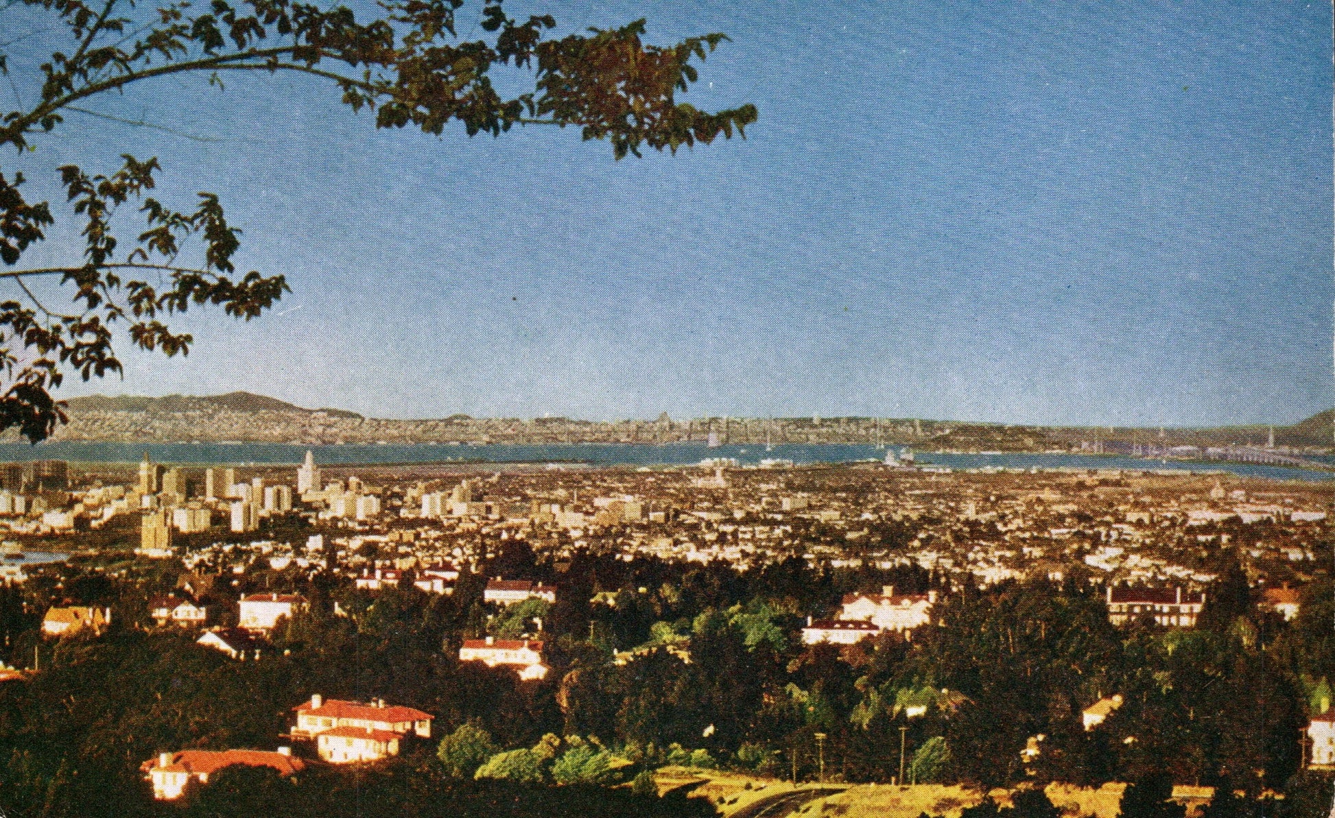 Post cards: overview [chrome]; Skyline [chrome]; Downtown from Bay [chrome]; Washington St. [c.1905]; Lake Merritt [chrome]; Lakeside Park [linen]; “Heinold’s First and Last Cha nce” saloon; “Joaquin Miller... at his home” [1915?]; Jack London Village [chrome]; California Garden Show [chrome]