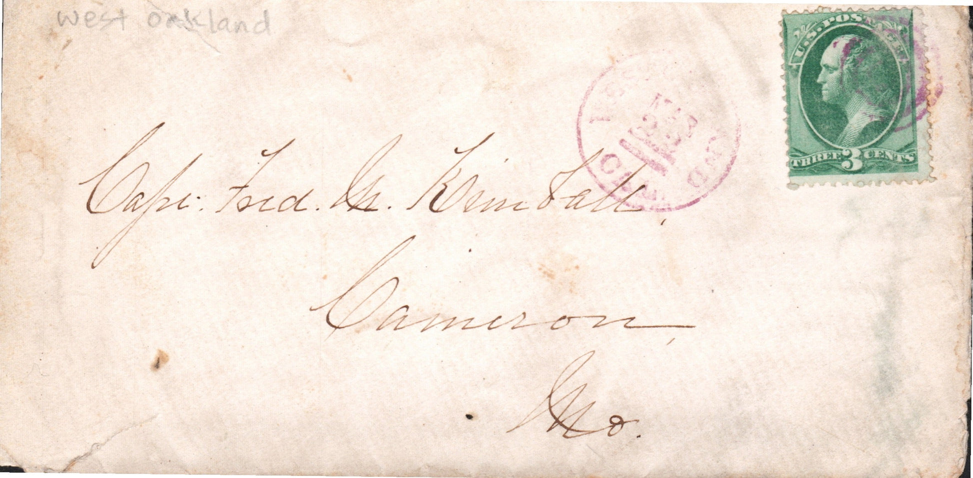 West Oakland (1873-1878) poor 1877 cds & target killer on cover
