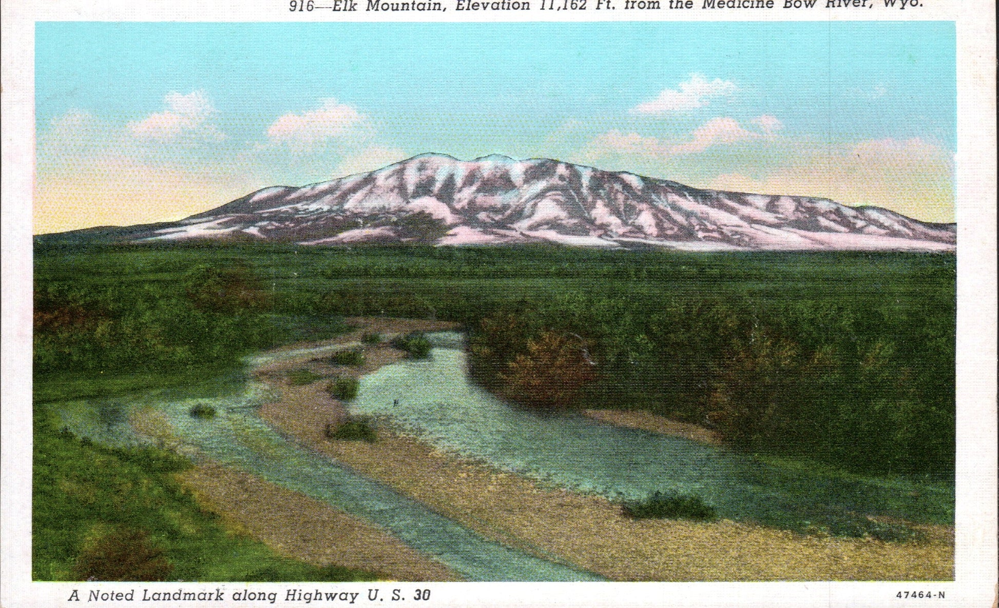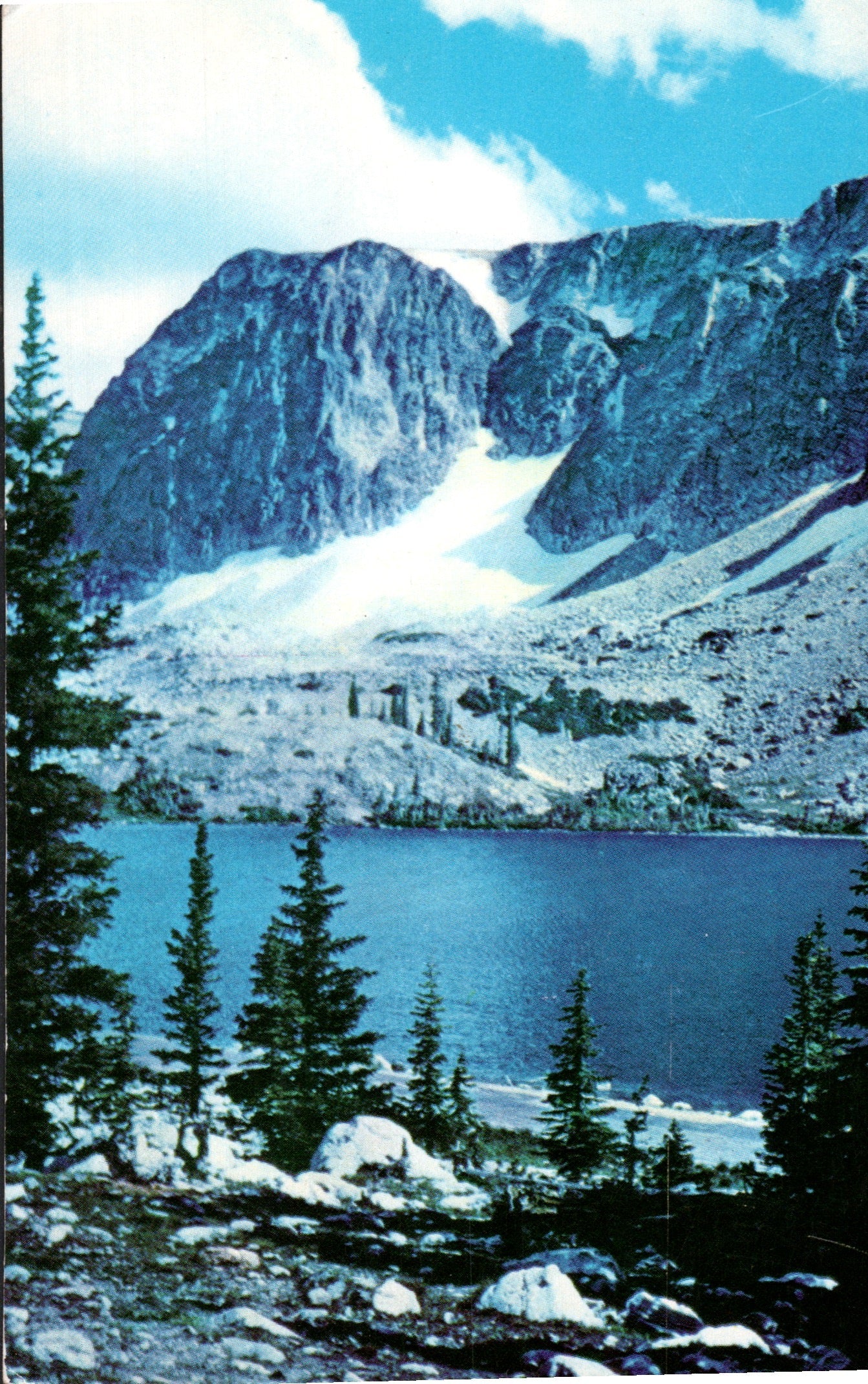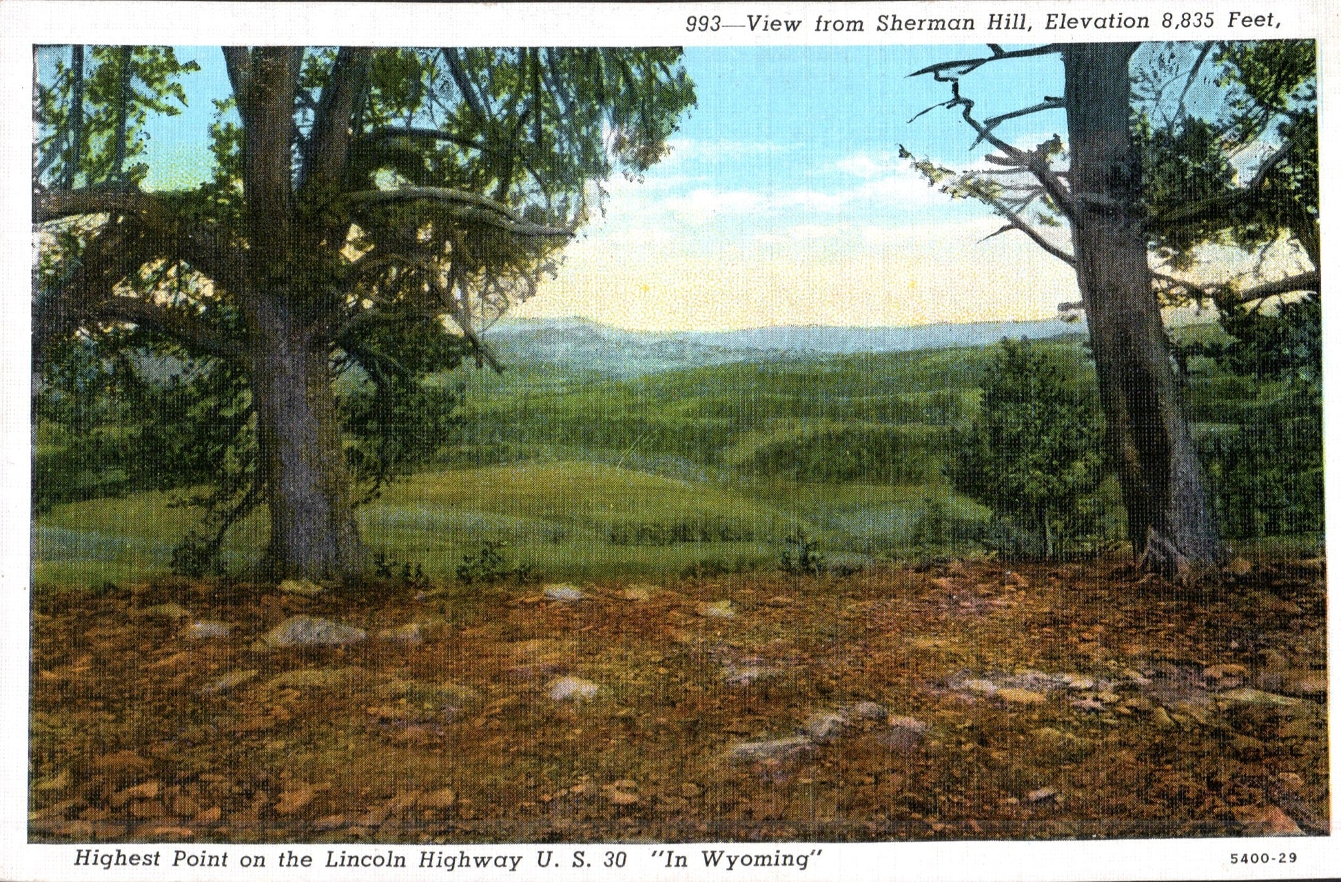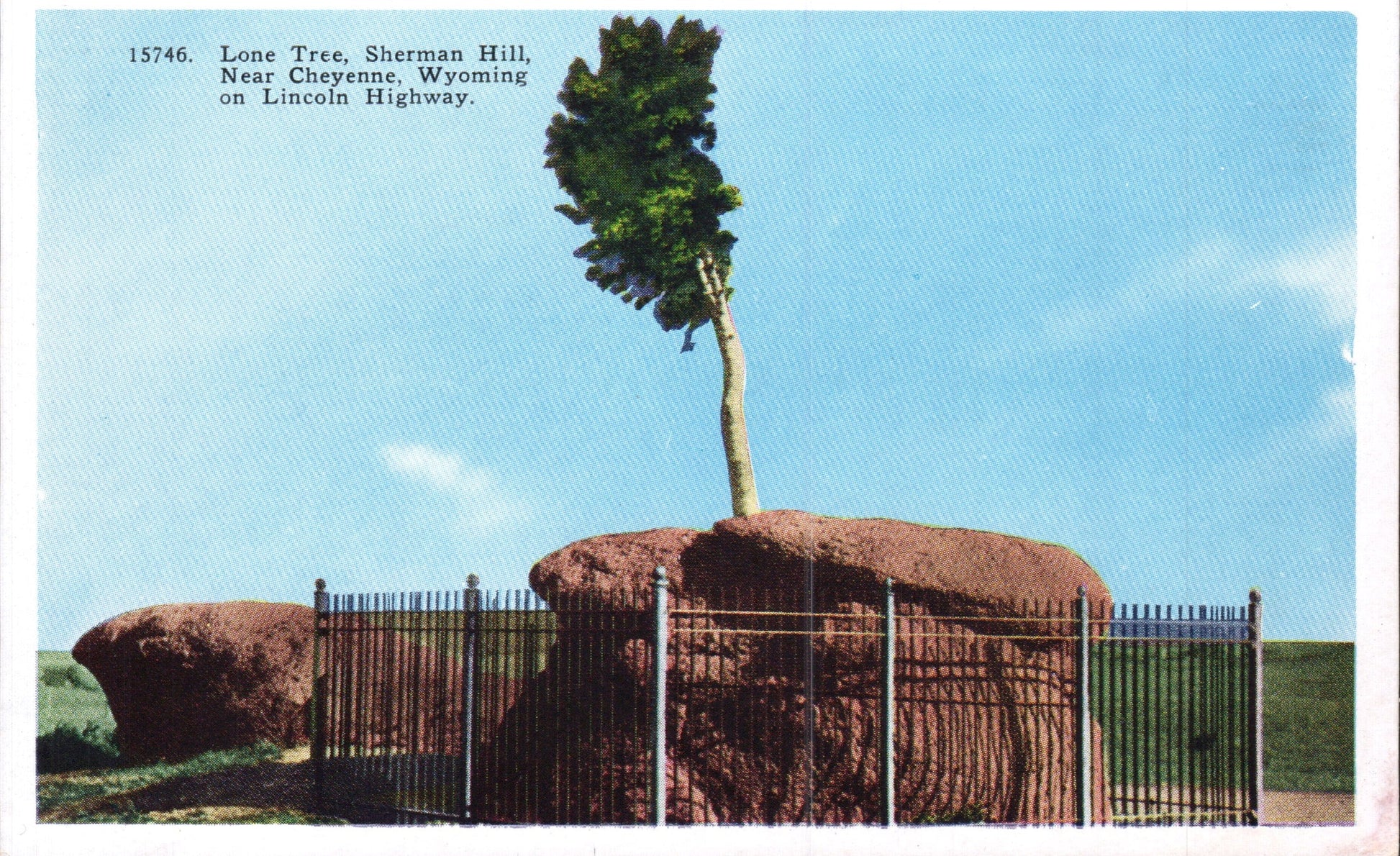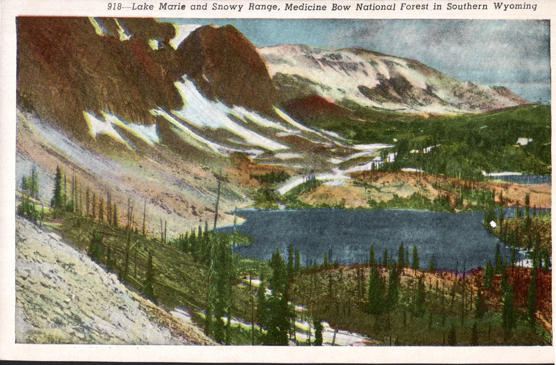 Post cards: “Ames Monument” [linen, S#908]; “Tree Growing Out of Solid Rock” [linen, S#927]; “Lone Tree, Sherman Hill” [1930s] “Elk Mountain” [linen, S#916]; “Guernsey Lake” [linen, S#1108]; View from Sherman Hill (S#993 “Laramie Peak” [2 linen, S#996, different coloring]; “Snowy Range” [linen]; “Highway and Lake over Snowy Range” [linen, S#924]; “Highway through the Snowy Range” [linen, S#1217]; “Brooklyn Lake” [linen, S#1119]; “Lake Marie” [linen]; “Lake Marie and Snowy Range” [linen, S#918]; “Lake Marie ” [chrome]; “Mirror Lake” [chrome, S#3912]; “Silver Lake” [chrome, S#3997]; “Highway No. 130 over the Snowy Range” [chrome, S#3996]