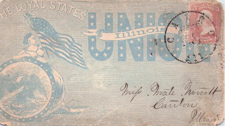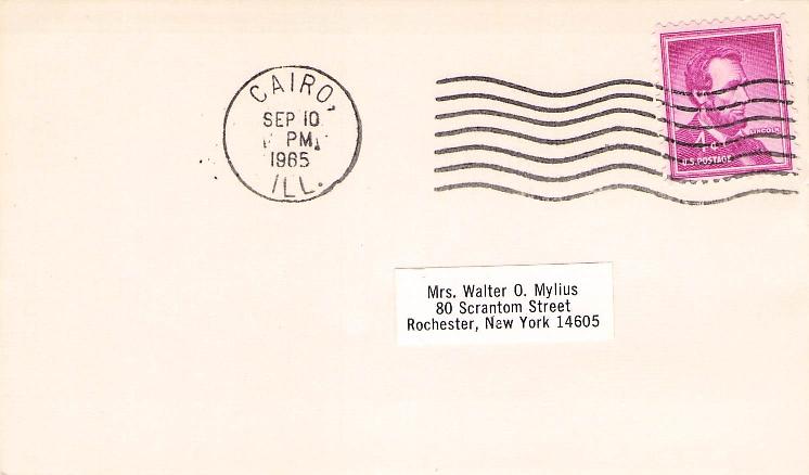 - Cairo c.1862 cds on Civil War all-over patriotic cover, a bit worn; 1863 duplex on small cover; 1907 Flag cancel on Postal Card, price list for Illinois Hay and Grain Co.; 1929 machine cancel on cover, P.O.D. official letter with 2¢ stamp; 1965 machine cancel on 3x5 card