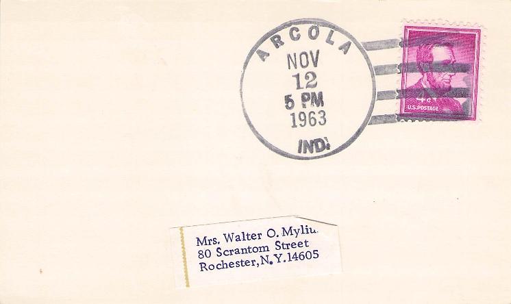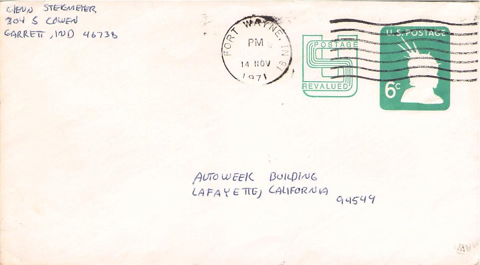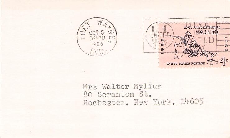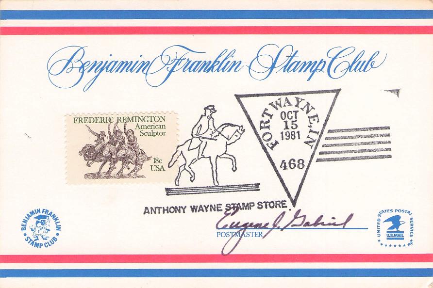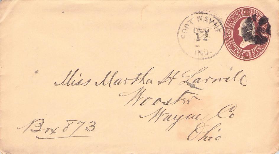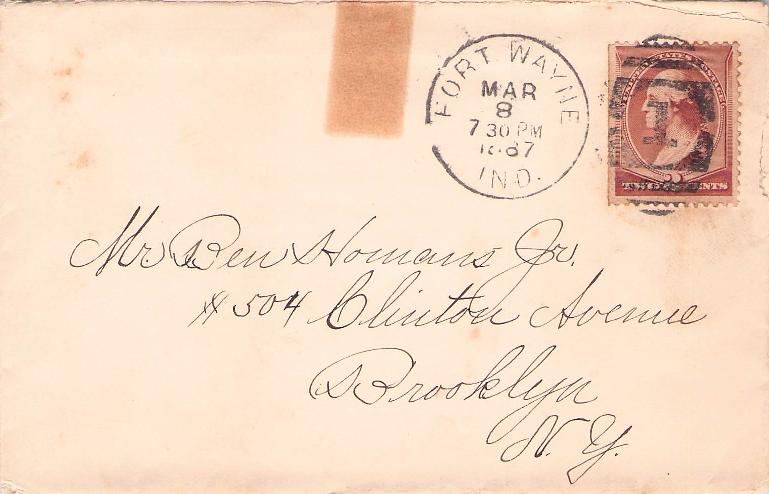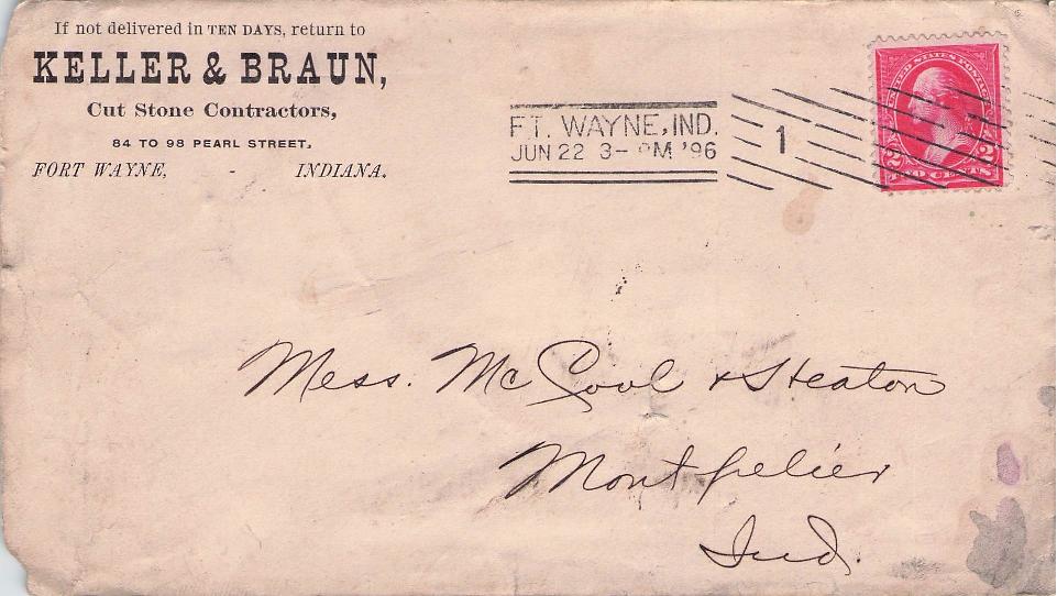 Fort Wayne c.1880 cds on cover; 1887 cds on cover, tape mark; 1896 Doremus machine cancel on cover, “Keller & Braun, Cut Stone Contractors” corner; 1933 duplex on airmail cover; 1963 machine slogan “United Way” on 3x5 card; 1971 machine cancel on revalued envelope. Parcel Post Annex c,1960 Received mark as sending strike; 1981 fancy cancel for Benjamin Franklin Stamp Club, signed by PM