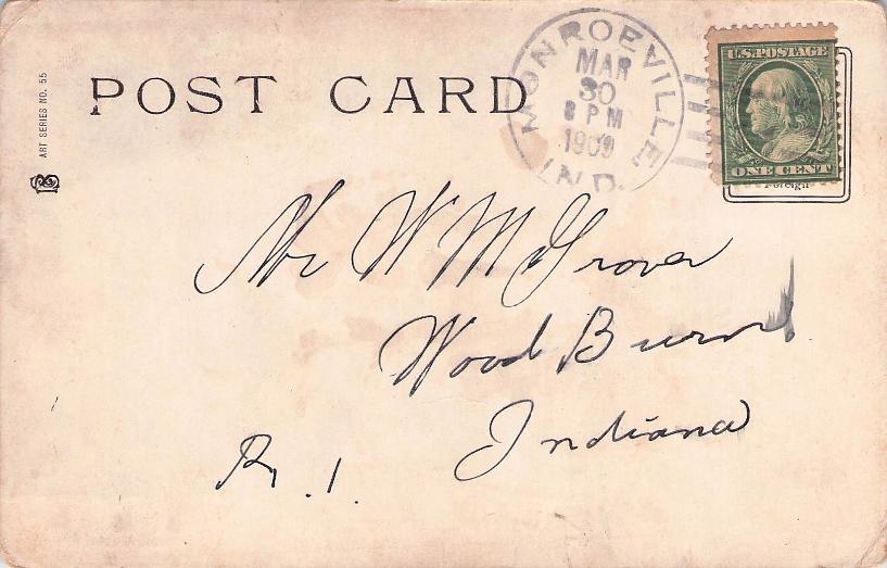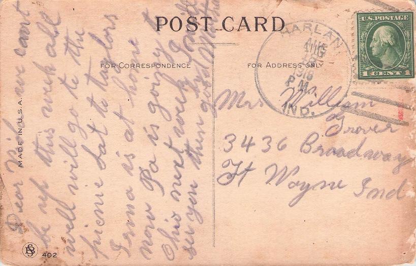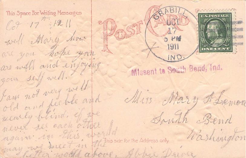 Grabill 1911 4-bar on post card, auxiliary marking “missent to South Bend”