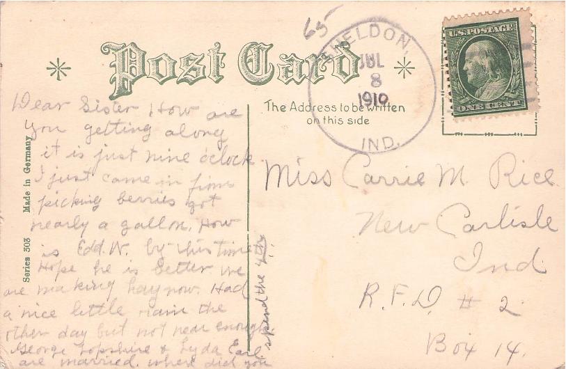 Sheldon (1870-1970) 1910 4-bar on post card, “1910” written in