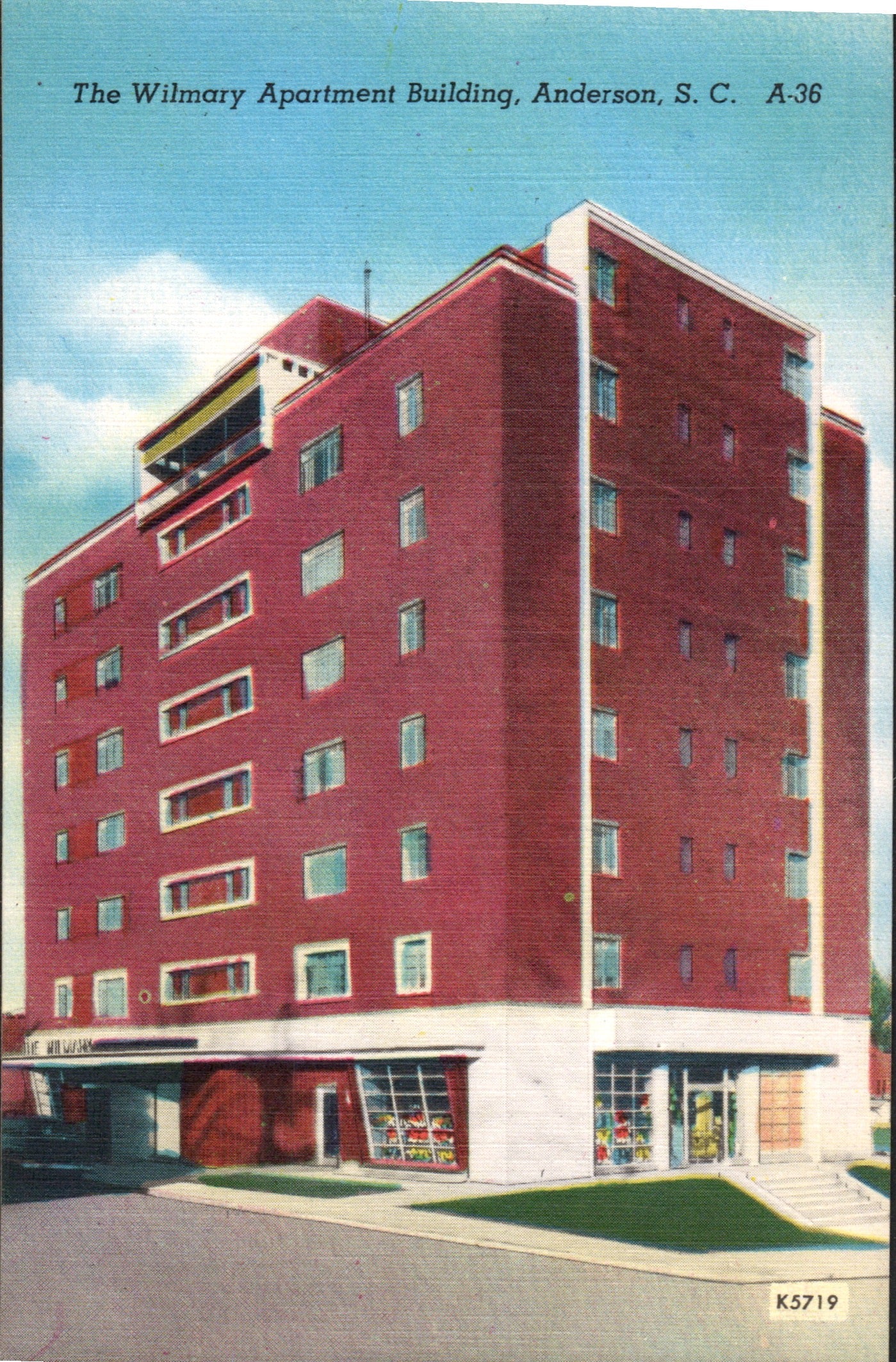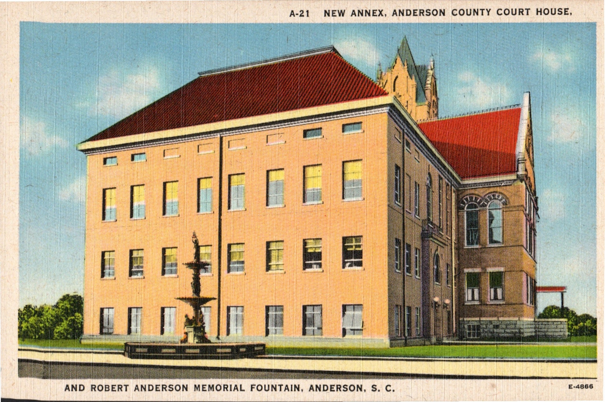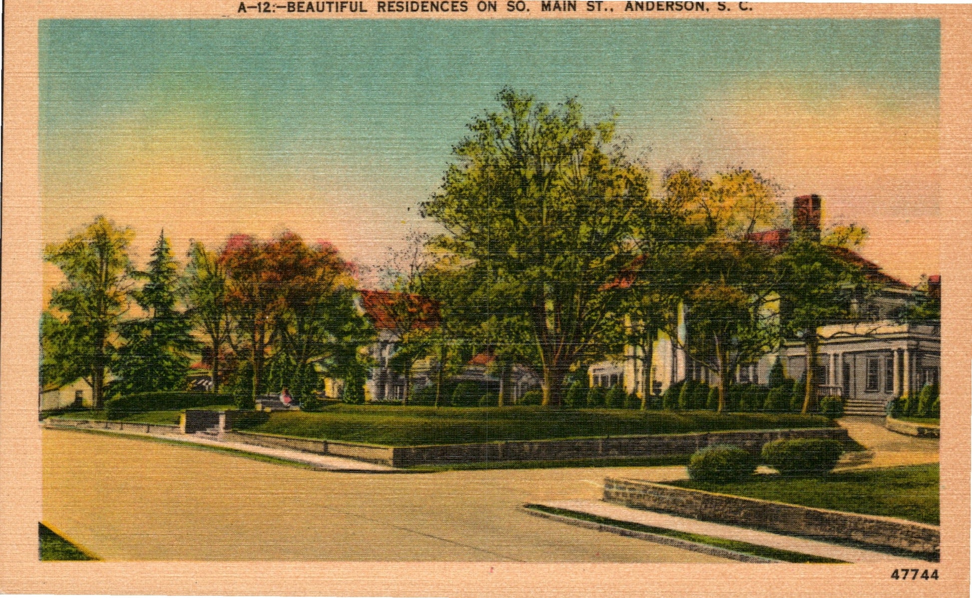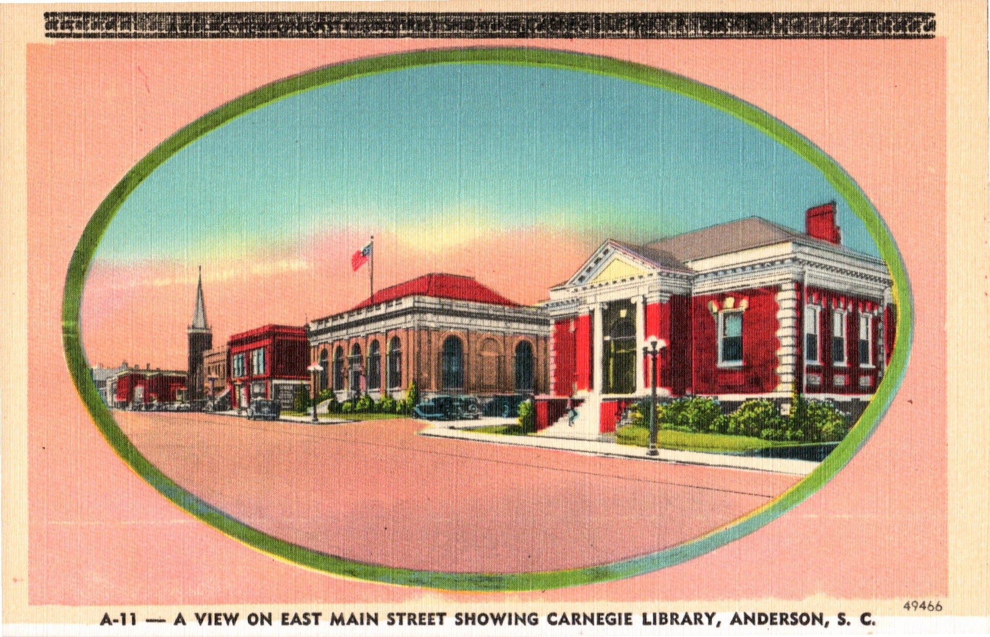 Anderson Post cards: “Main Street Looking South at Night” [linen]; “A View on East Main Street Showing Carnegie Library” in oval; “Anderson County Hospital” [white border, c.1940]; “Anderson Memorial Hospital” [chrome];; Post office [chrome] “Anderson County Court House” [linen, c.1940]; “New Annex, Anderson County Court House” [linen]; Wilmary Apartment Building [linen]; “Anderson College” [chrome]; “Anderson Recreation Center” [chrome]; “Beautiful Residences on So. Main St.” [linen]