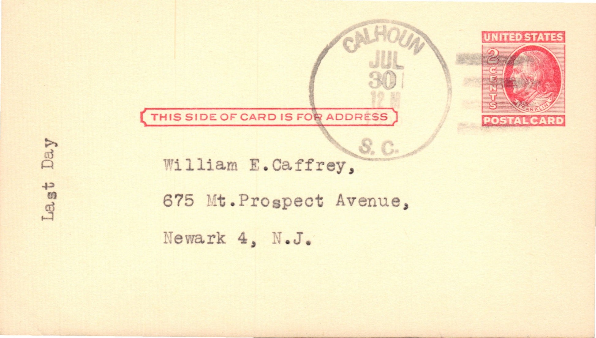 Calhoun (1802/1955) 1955 4-bar on LD Postal Card
