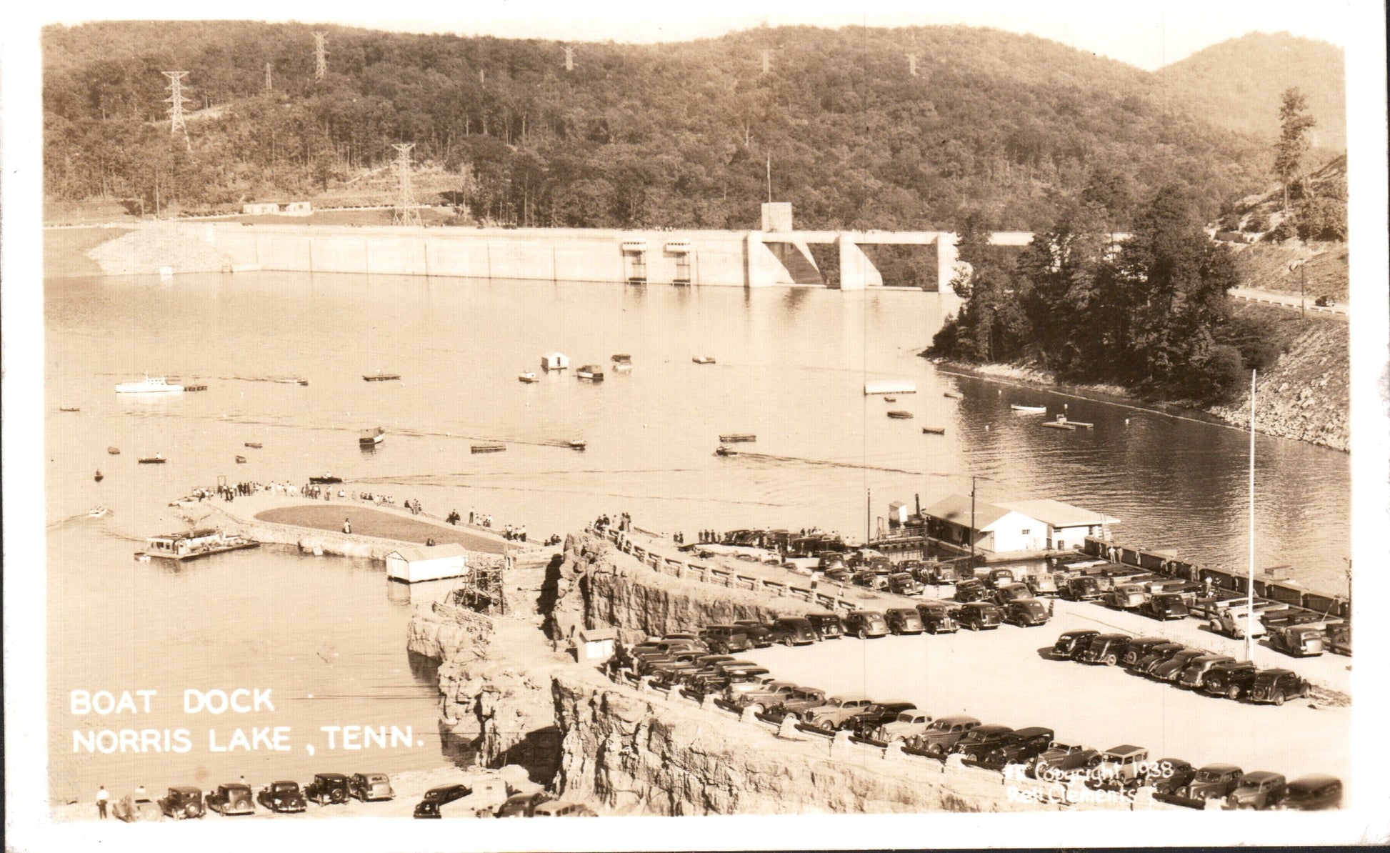 Norris 1938 machine cancel on real photo post card, view of Norris Dam & boat locks