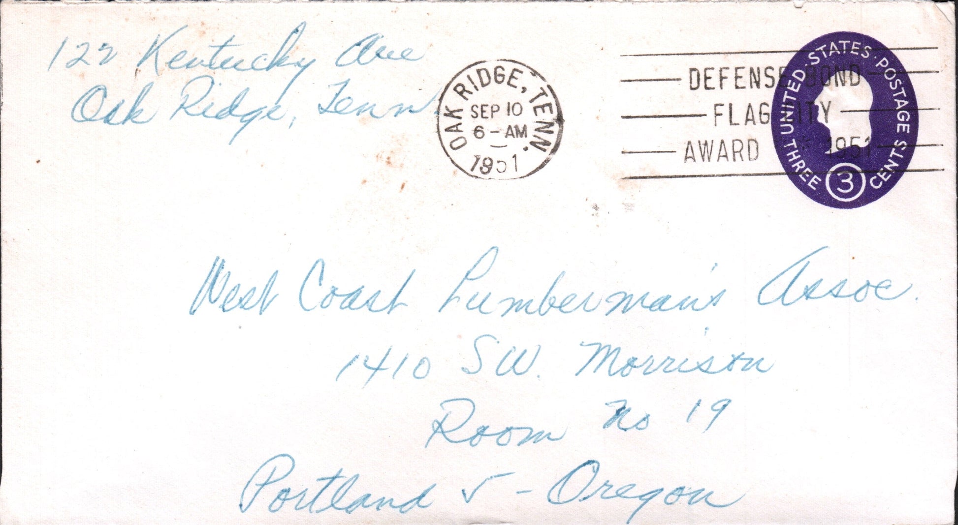 Oak Ridge 1951 machine slogan for Defense and Flag Day on cover