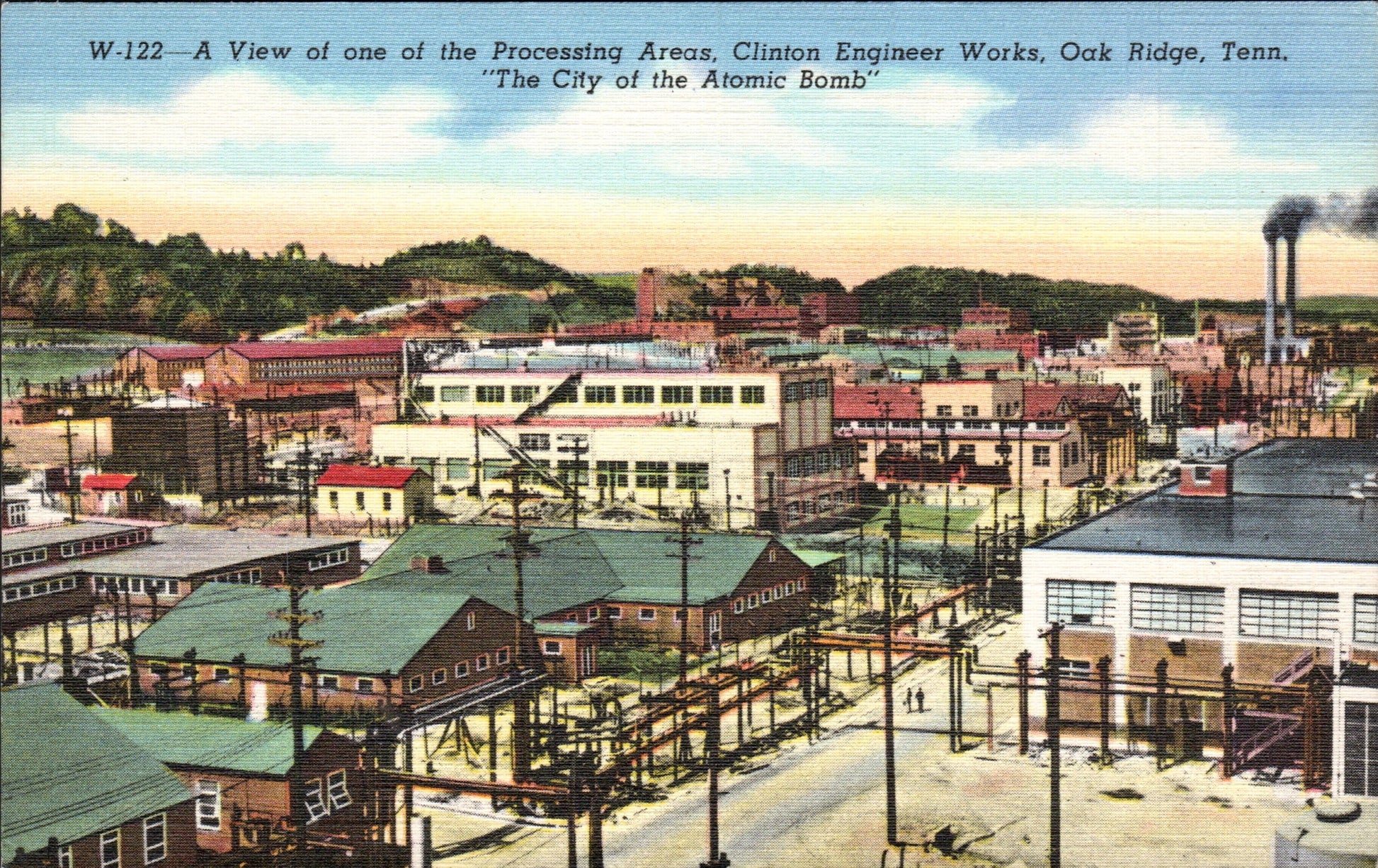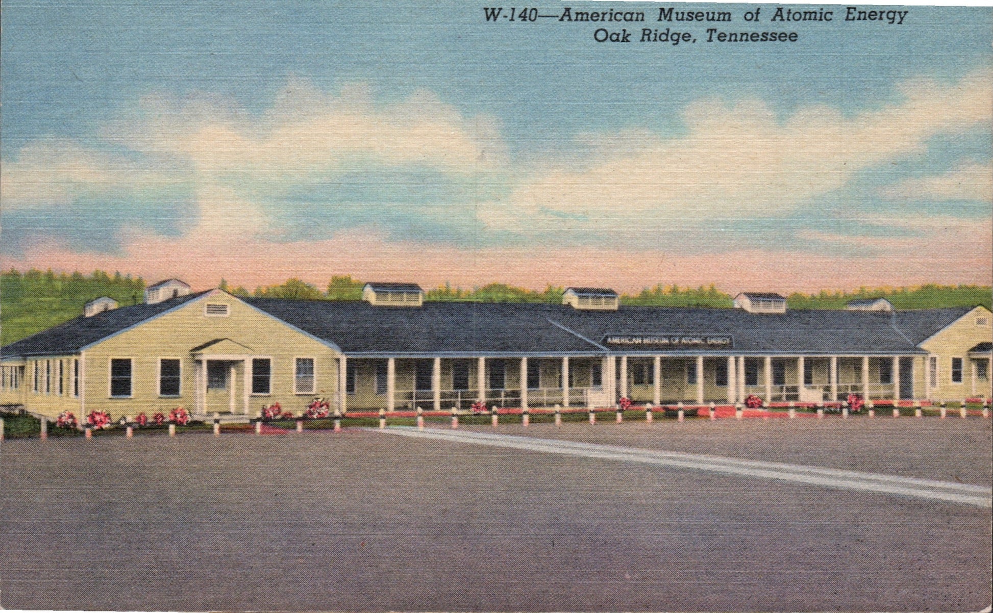 Post cards: “View of one of the Processing Areas, Clinton Engineer Works” [linen]; Museum of Atomic Energy [linen]; Oak Ridge High School [linen]