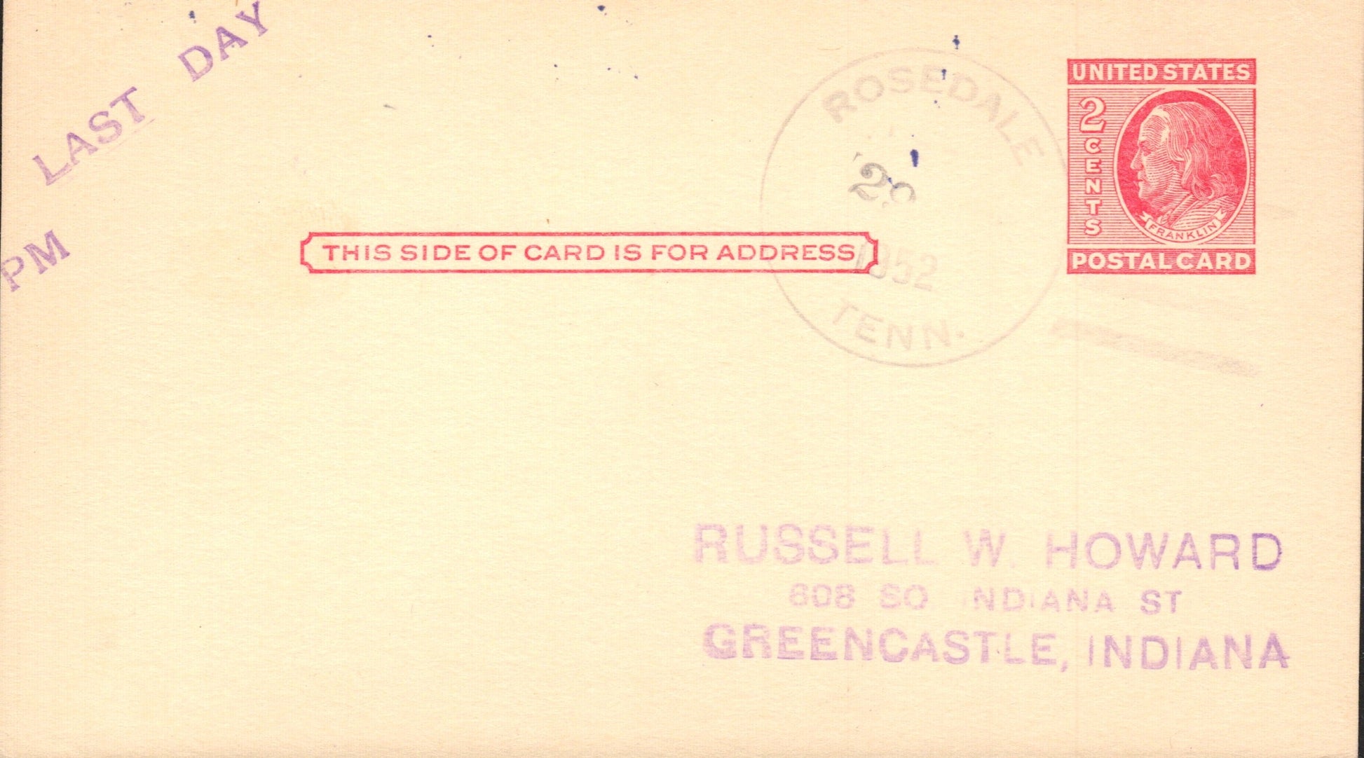 Rosedale (1907-1952) light 1952 4-bar on LD Postal Card