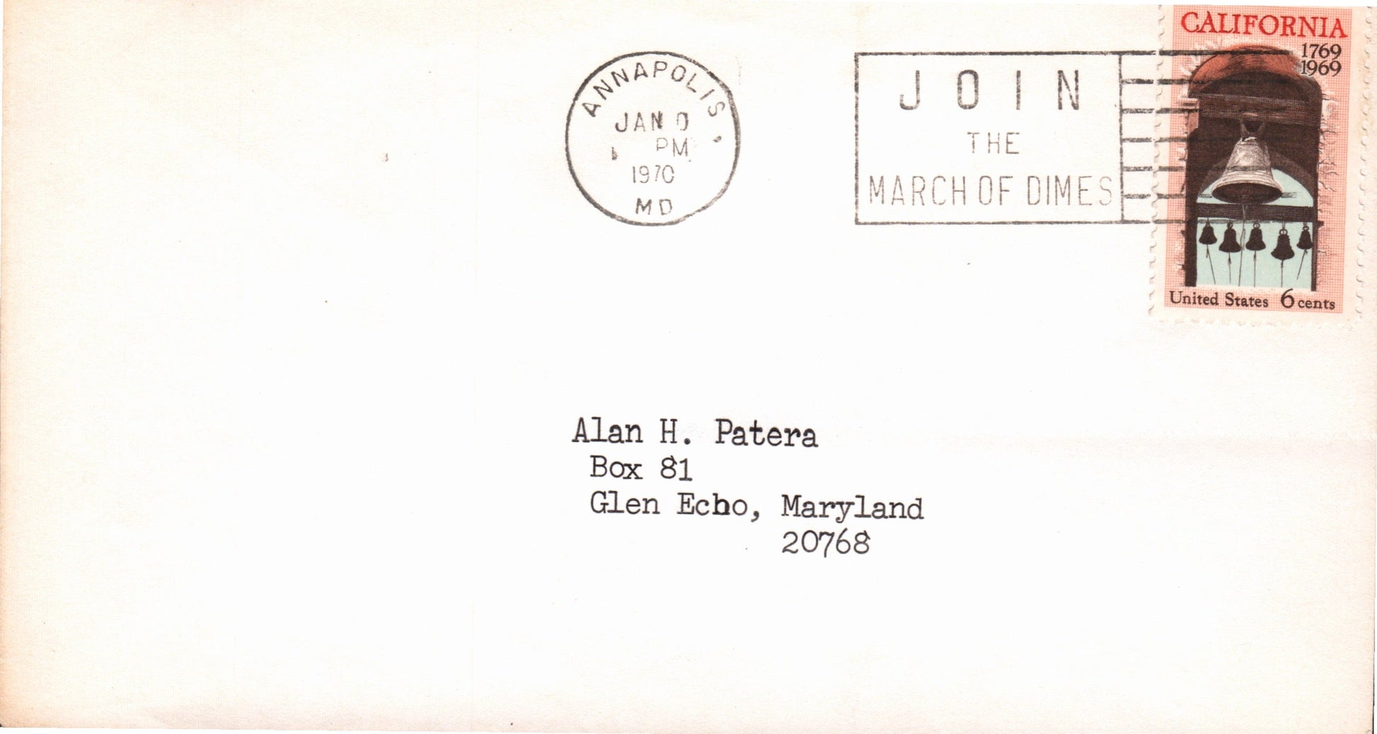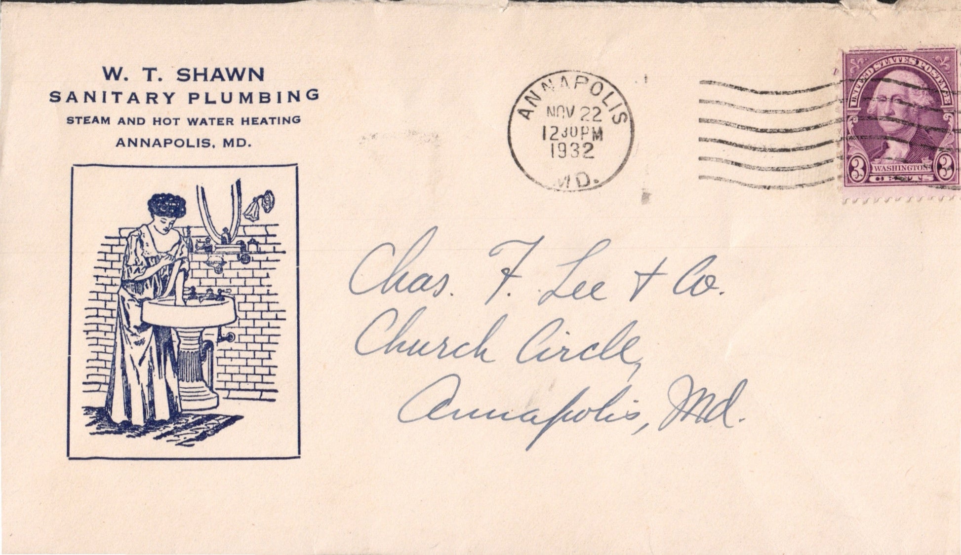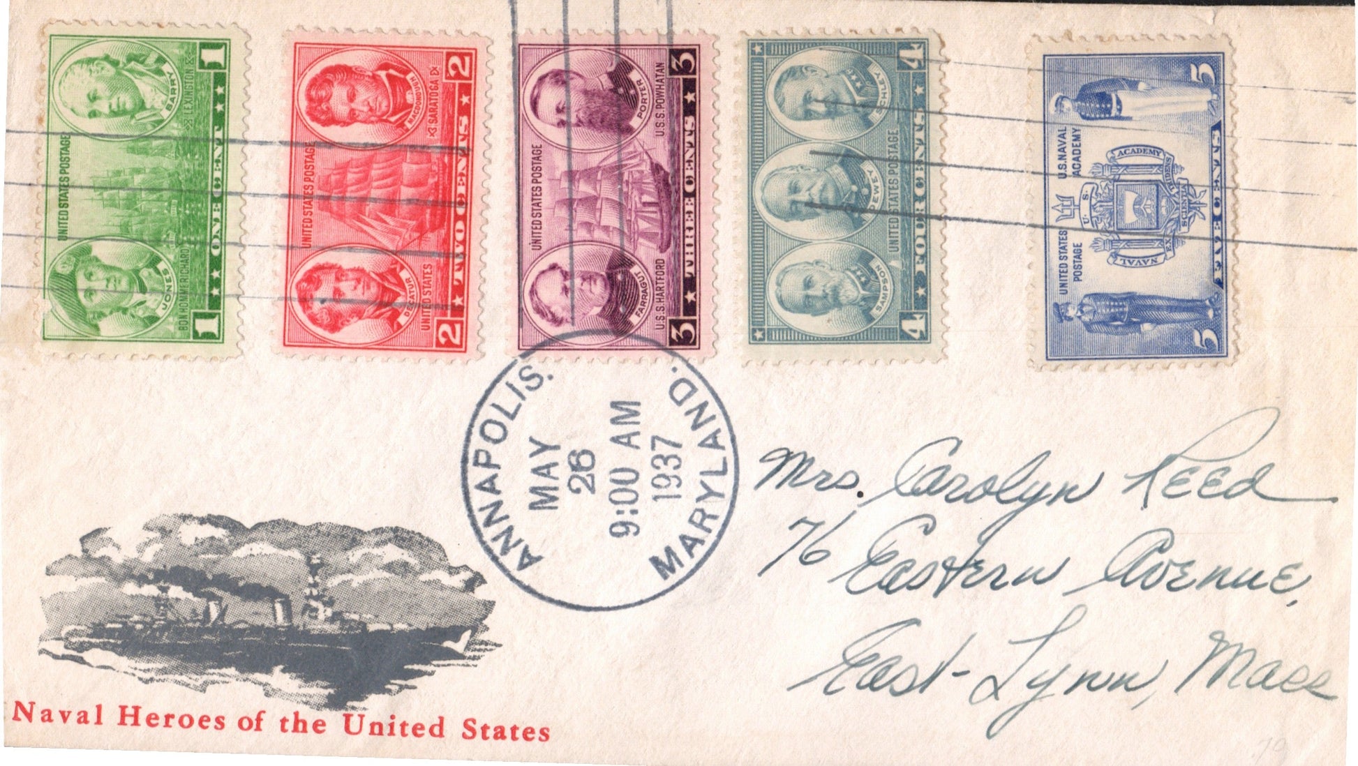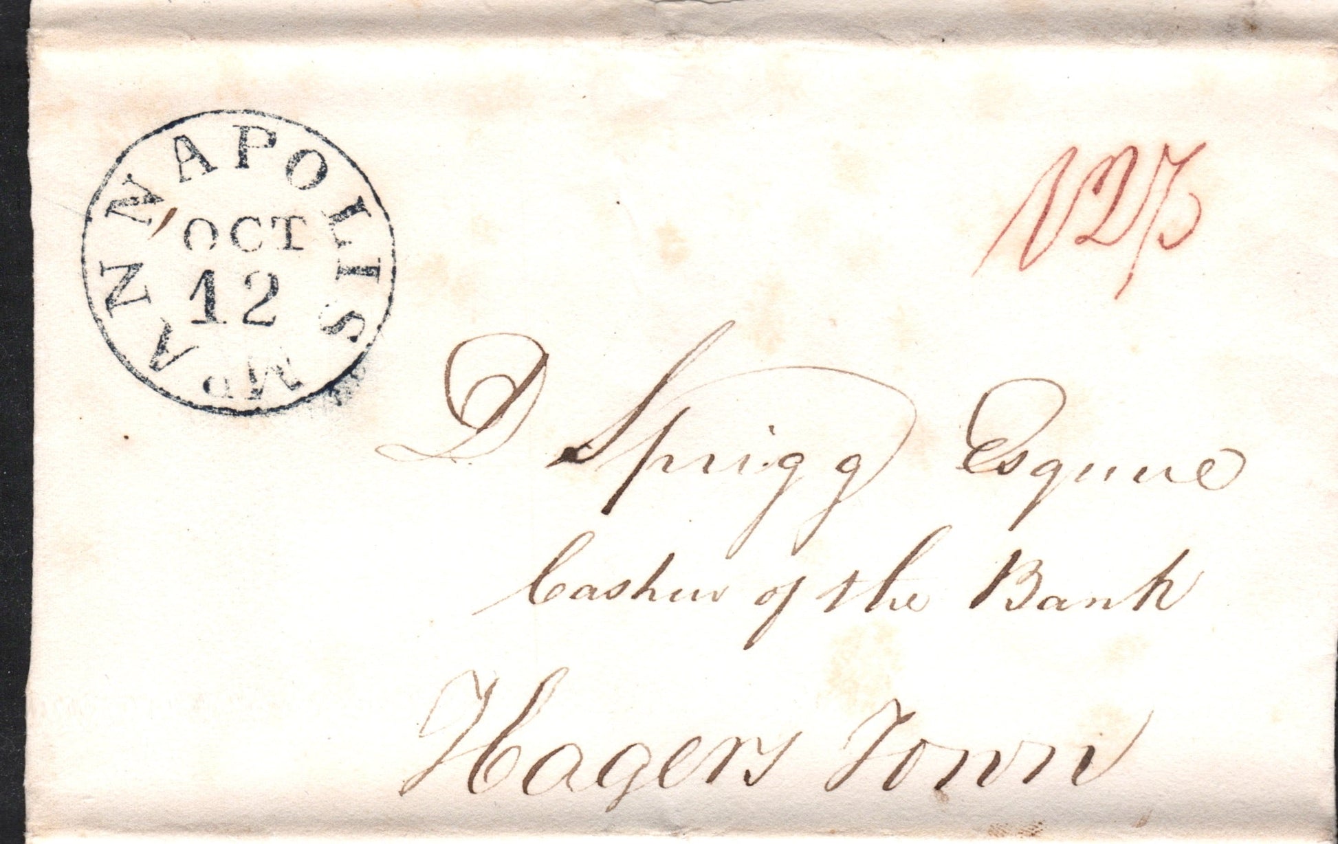 Annapolis 1831 stampless letter to Hagerstown; 1932 machine cancel on illustrated cover for “W.T. Shawn, Sanitary Plumbing, Steam and Hot Water Heating” corner; 1937 4-bar “Naval Heroes of the United States” with small cachet of ship and five stamps (1¢ through 5¢) depicting Naval heroes; 1947 machine slogan on cover for John Paul Jones Centennial, multi-color cachet; 1969 machine cancel on cover; 1970 machine slogan “Join the March of Dimes” on cover