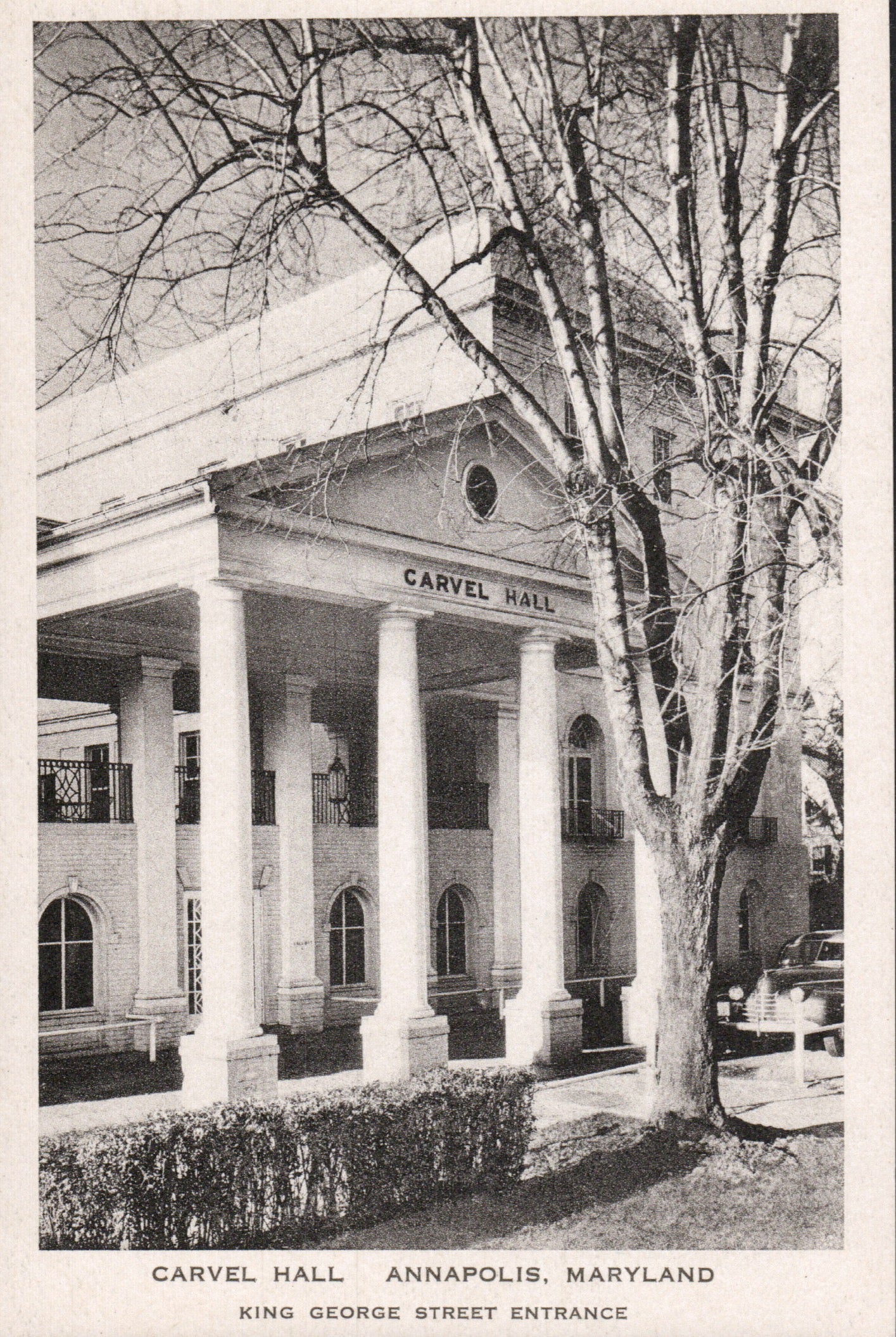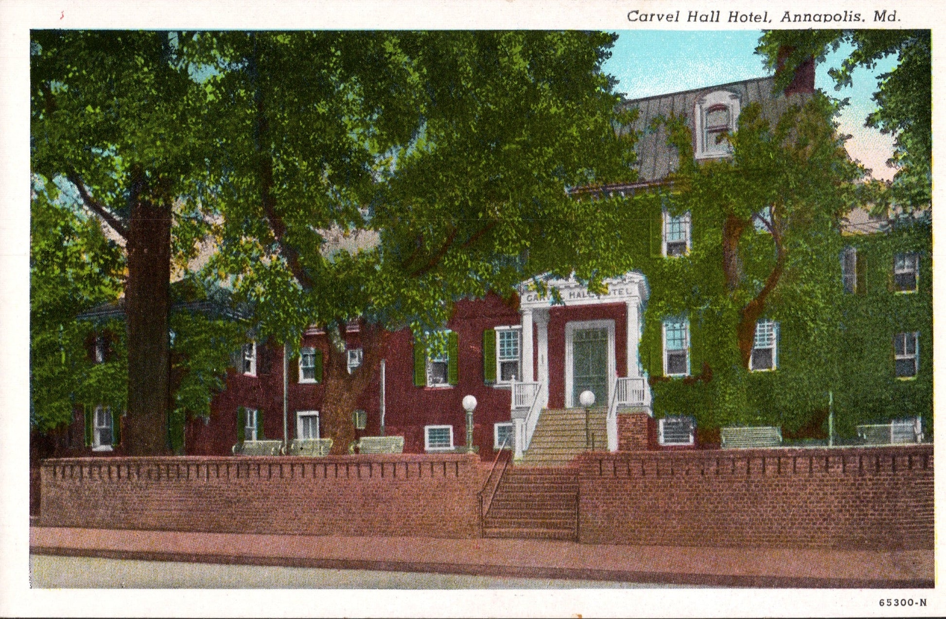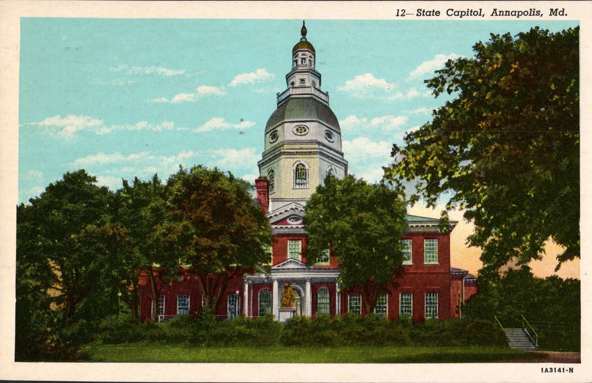 Post cards: Carvel Hall Hotel [c.1930]; Sherwood Hall [c.1930]; Tecumseh statue [chrome]; Chase Mansion [linen]; Carvel Hall [B&W]; “Liberty Tree and Woodward Hall, St. John’s College” [linen]; State Capitol [2 linen views]; Governor’s House [chrome]