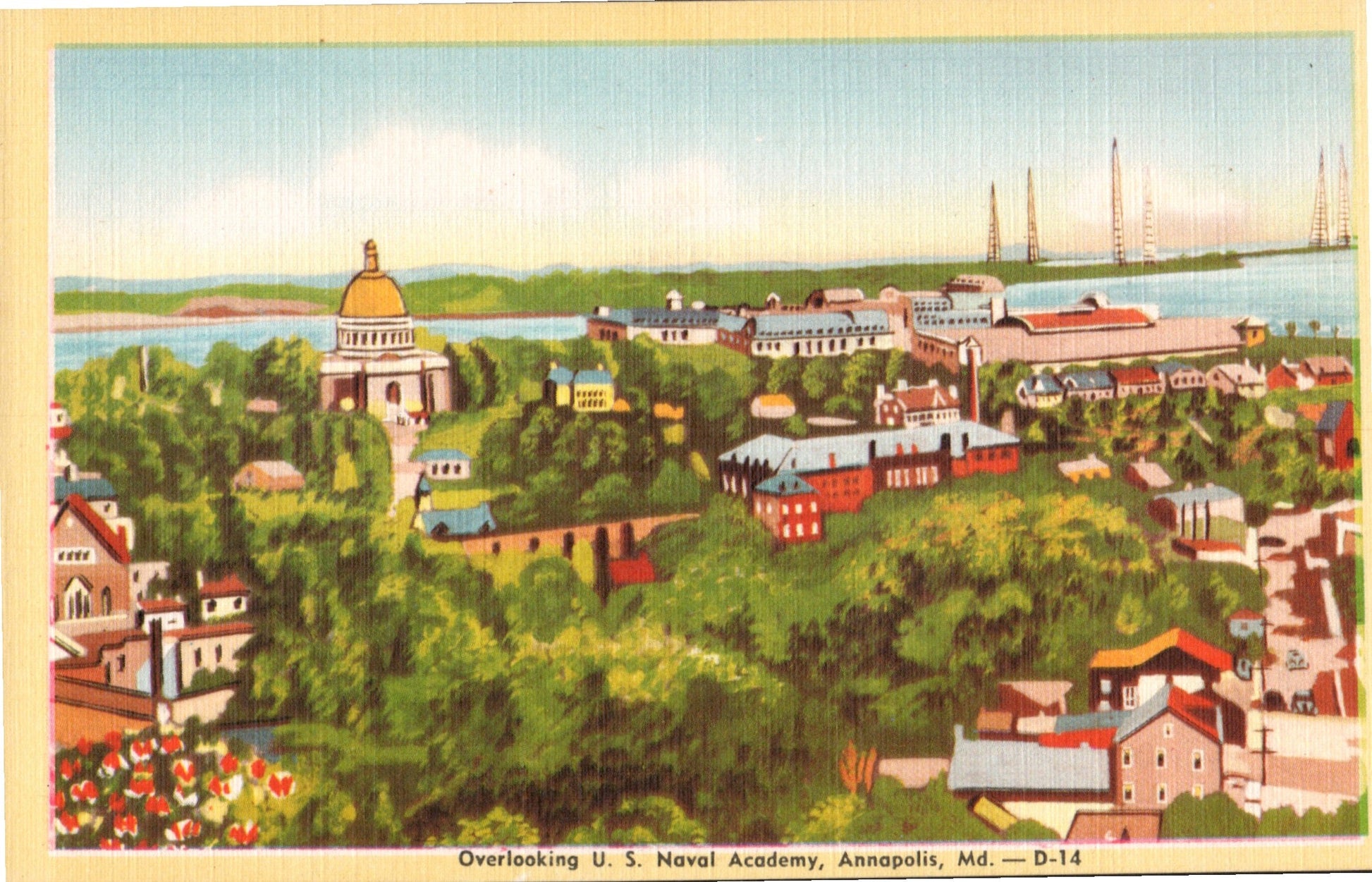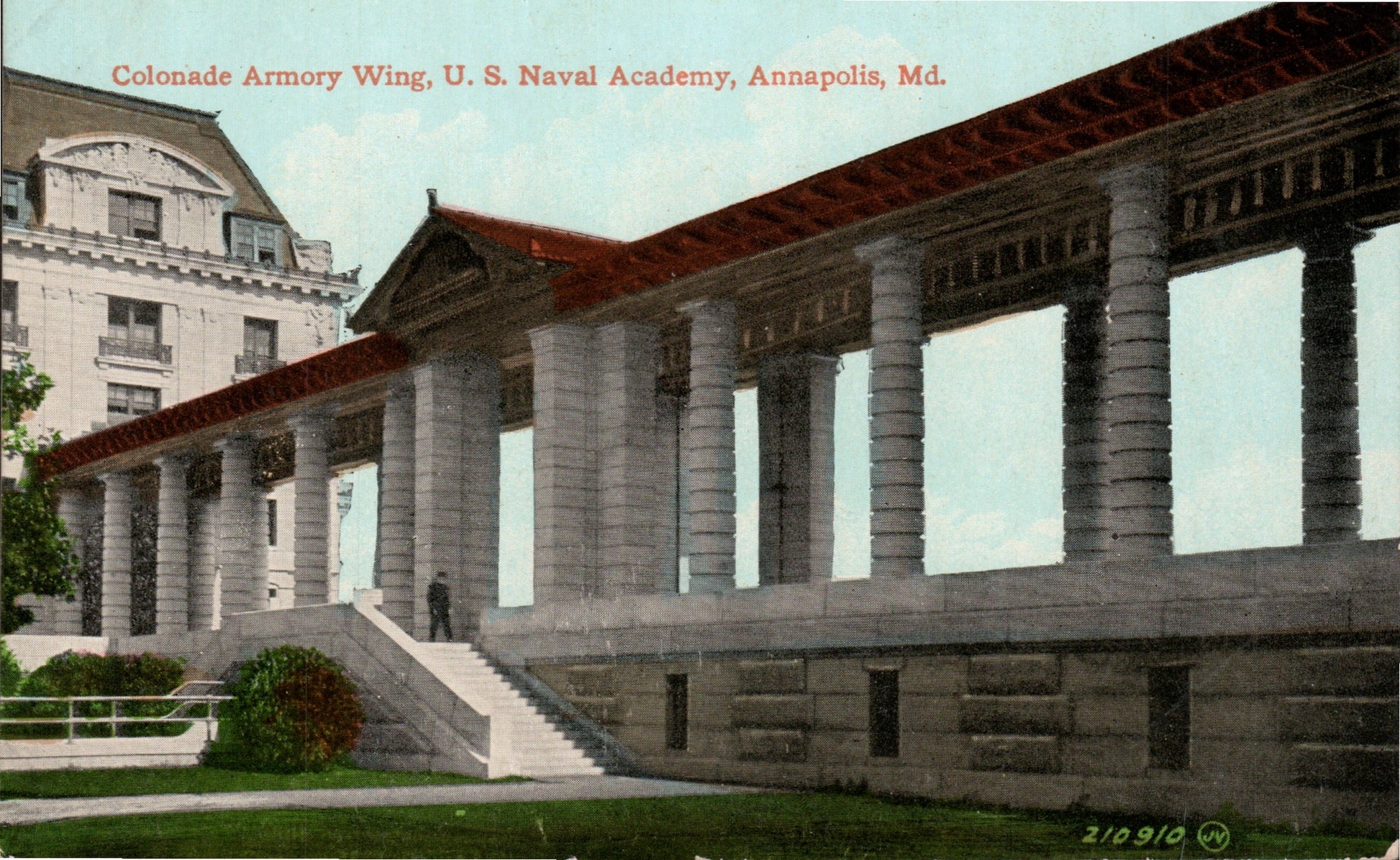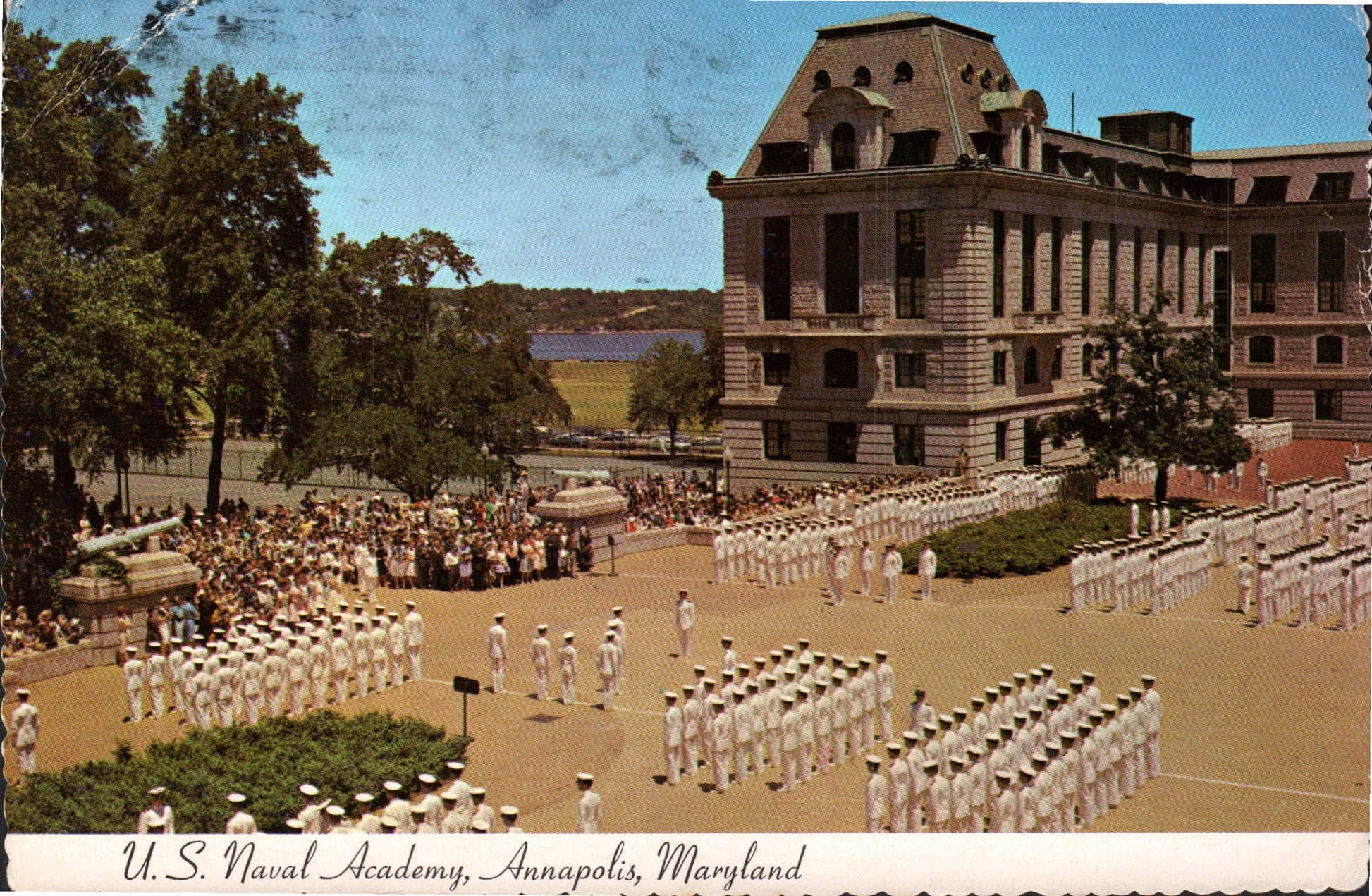 U.S. Naval Academy Aerial view [linen]; Overview [linen]; Main entrance [c.1910]; Noon formation [Continental]; “Dress Parade” [linen]; Bancroft Hall [1907 B&W], tape mark on front]; “Colonnade Armory Wing [c.1910]; Crypt of John Paul Jones [chrome]