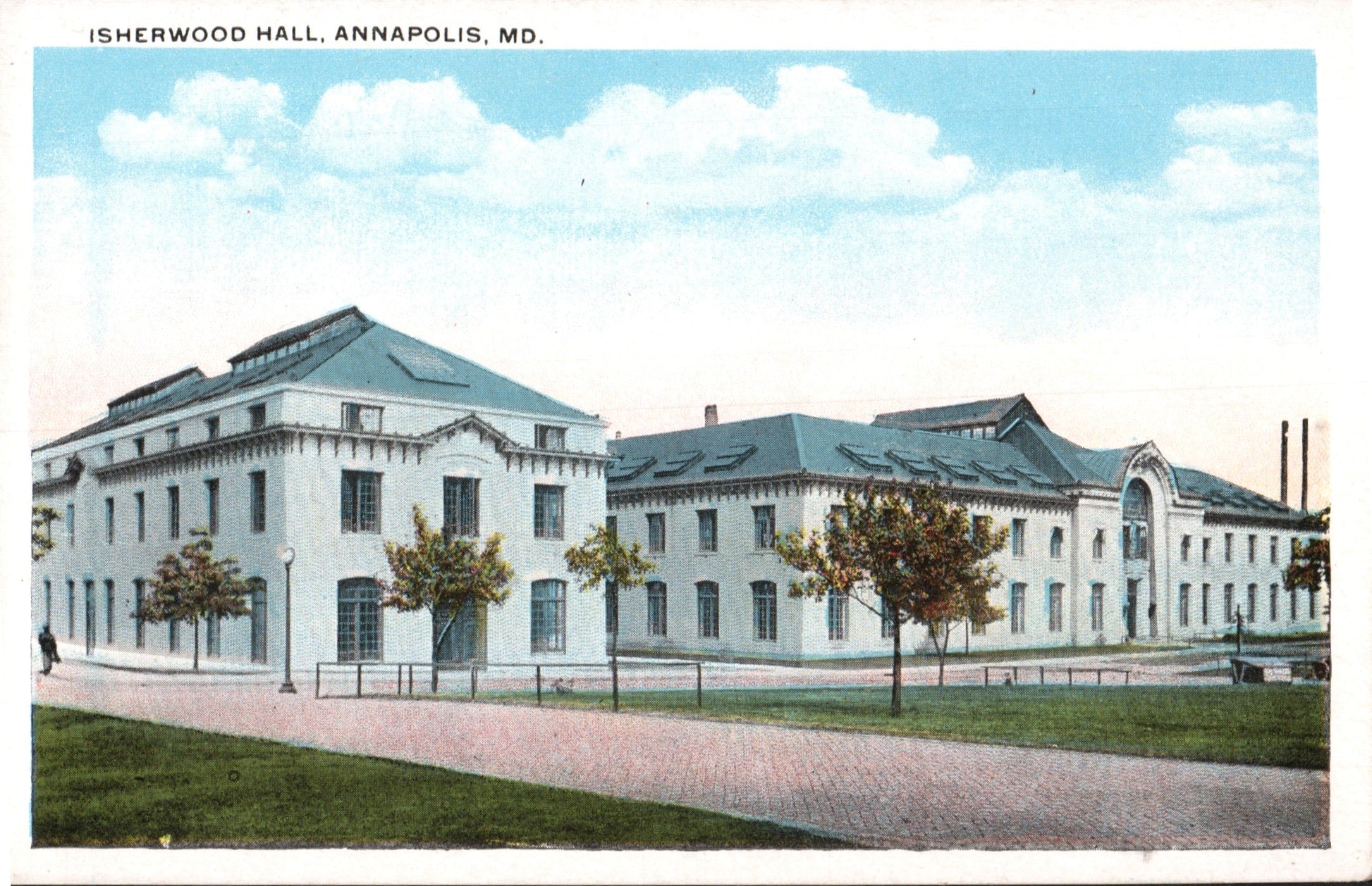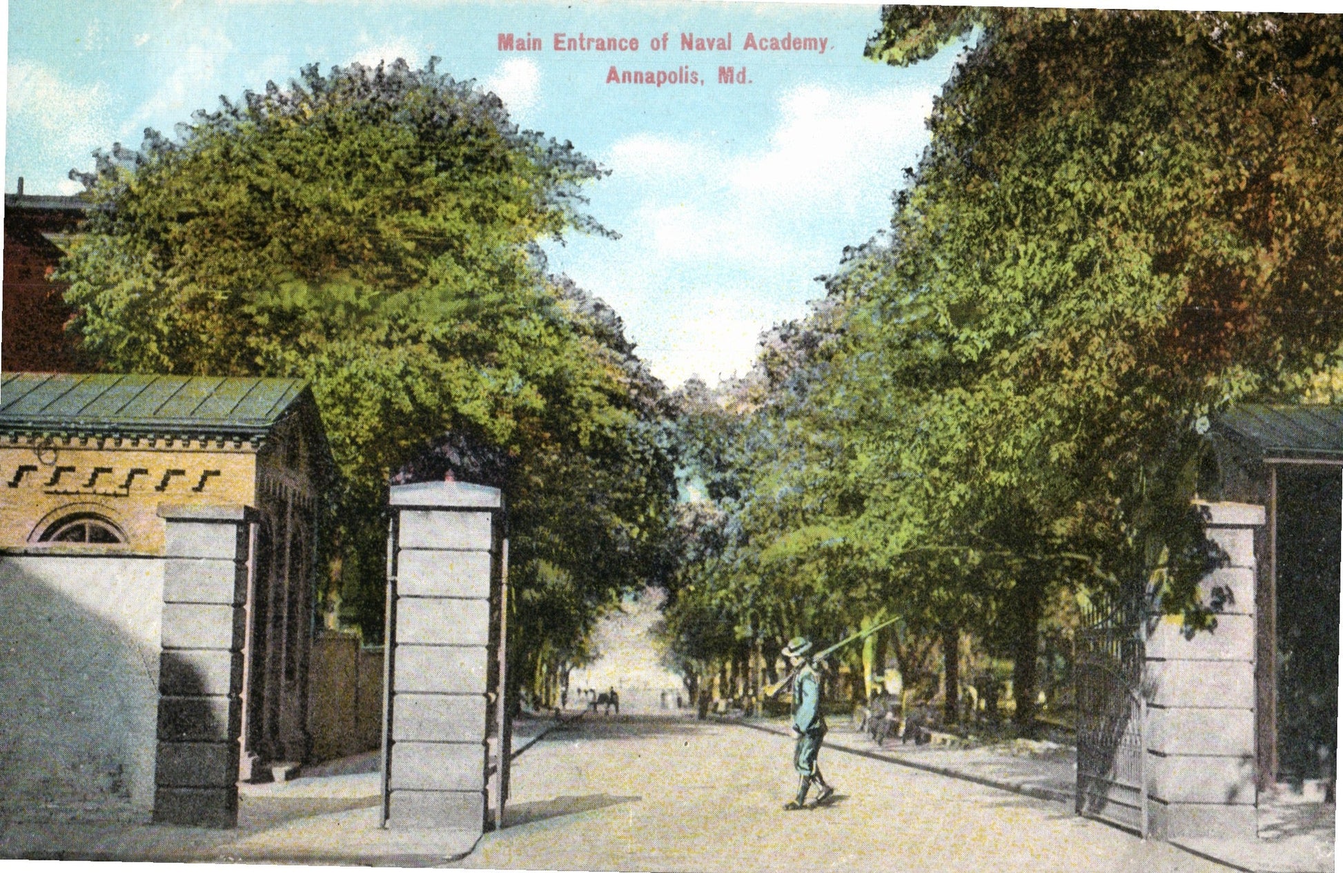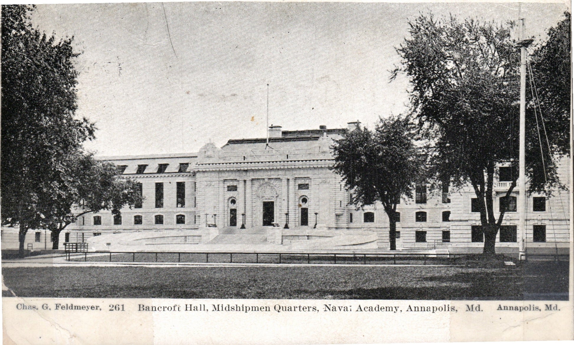 U.S. Naval Academy Aerial view [linen]; Overview [linen]; Main entrance [c.1910]; Noon formation [Continental]; “Dress Parade” [linen]; Bancroft Hall [1907 B&W], tape mark on front]; “Colonnade Armory Wing [c.1910]; Crypt of John Paul Jones [chrome]