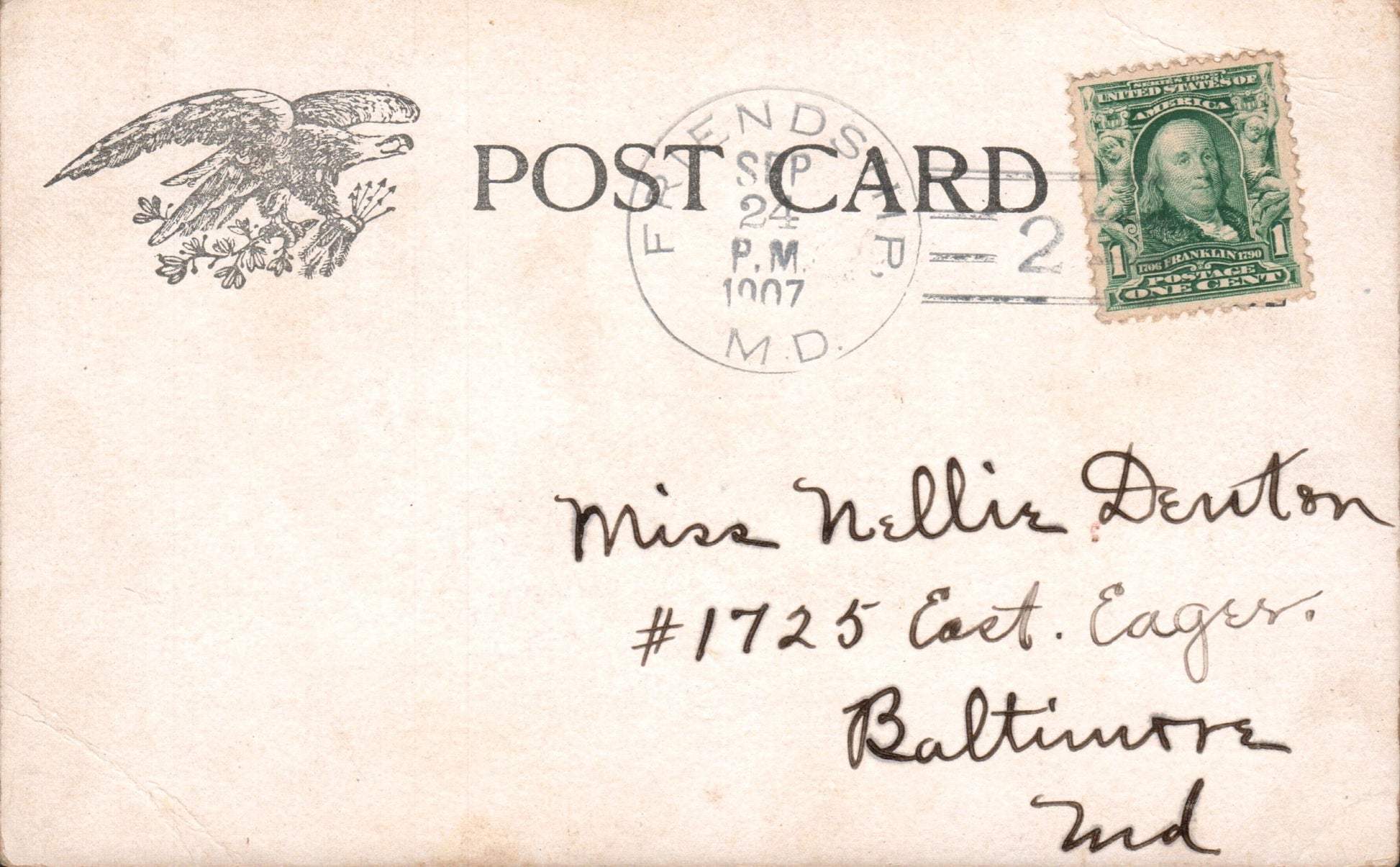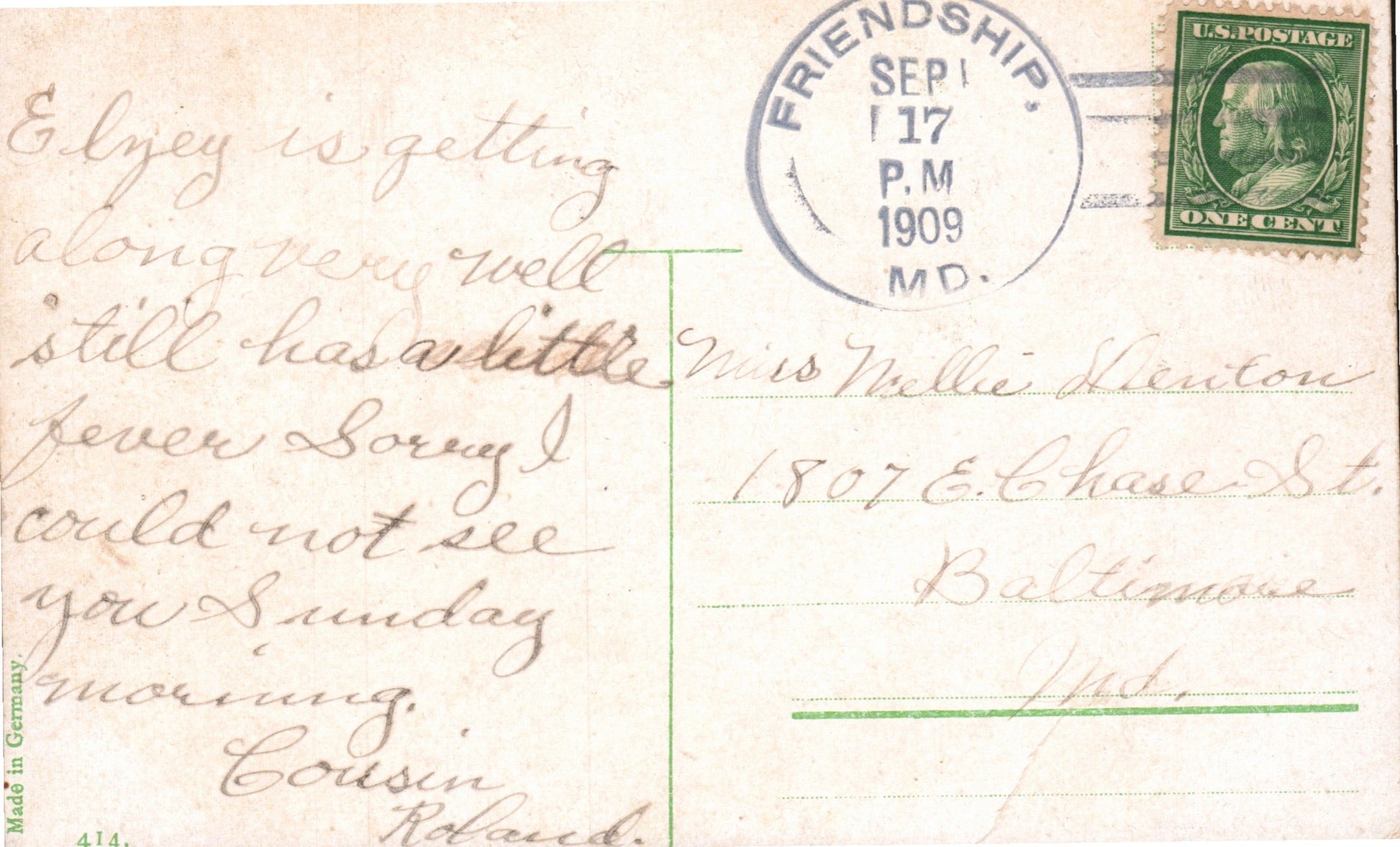 Friendship 1907 Doane (2) on post card; fine 1909 4-bar on post card