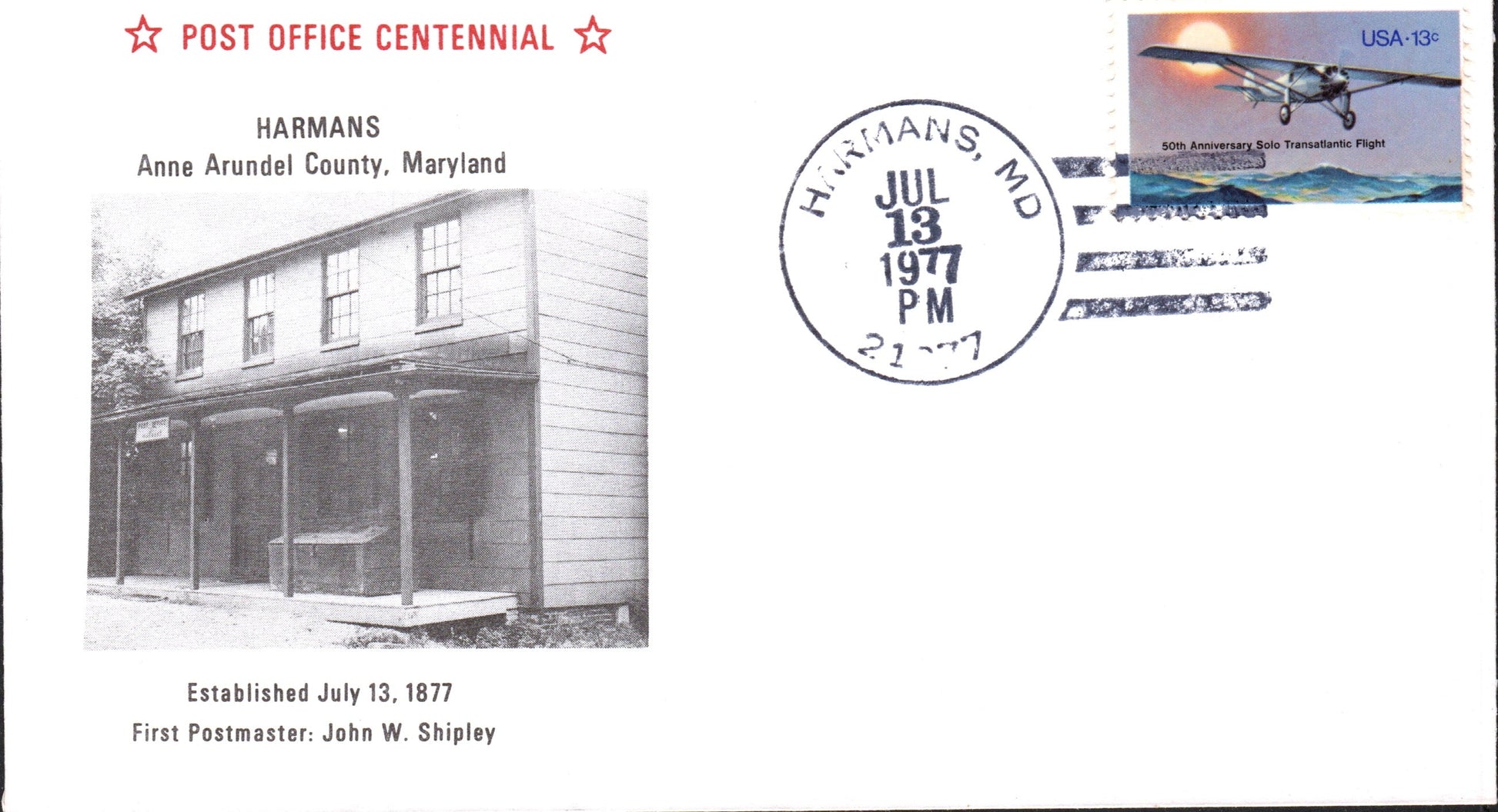 Harmans 1977 4-bar on Centennial cover, cacheted with a photo of the post office