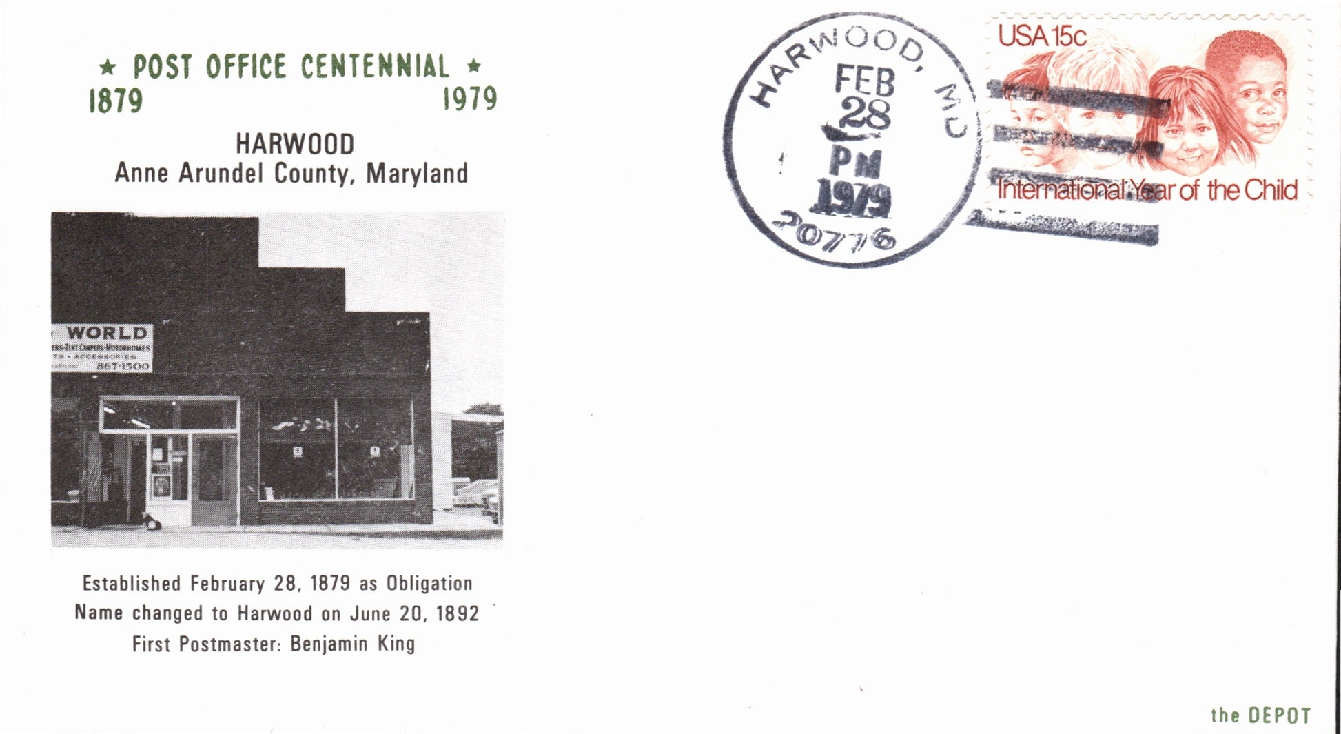 Harwood 1979 4-bar on Centennial cover, cacheted with a photo of the post office