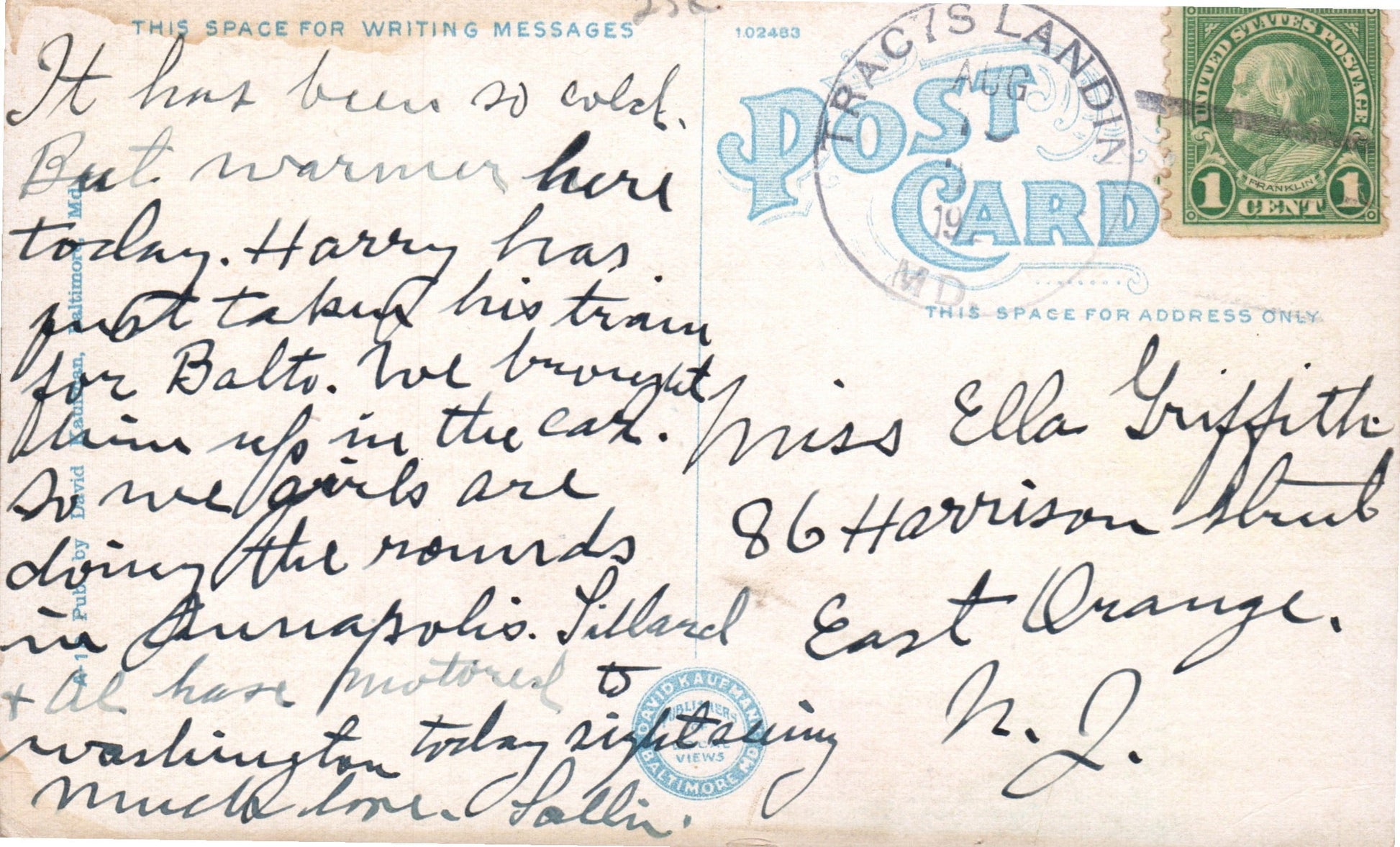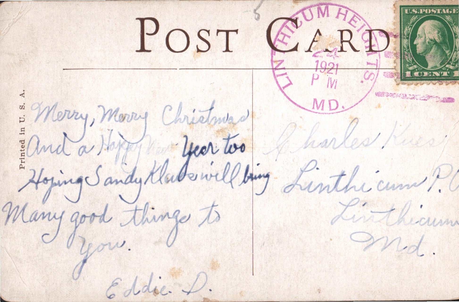 Linthicum Heights 1921 4-bar, purple ink, on post card