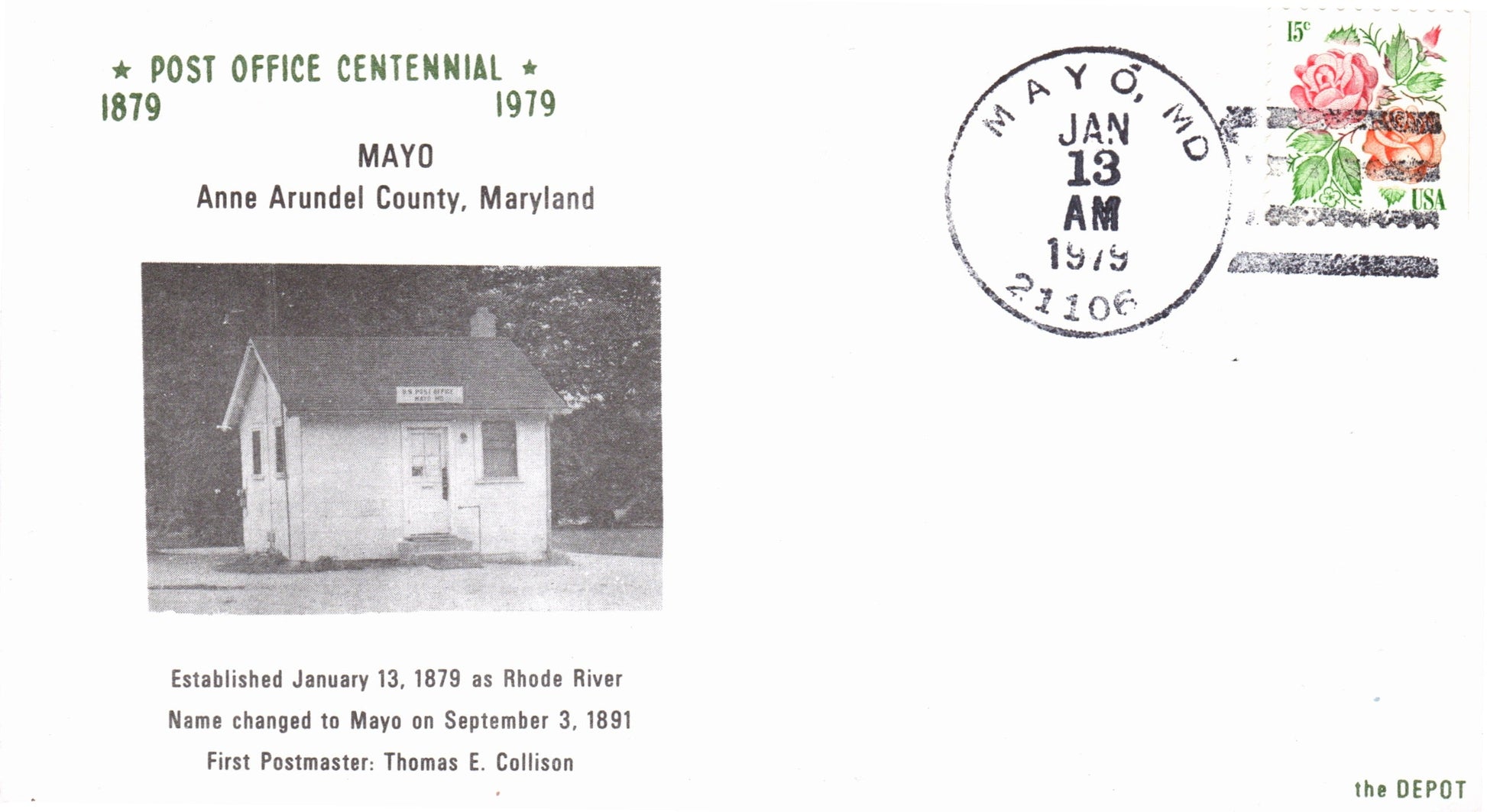 Mayo 1957 4-bar on post card; 1979 4-bar on Centennial cover, cacheted with a photo of the post office