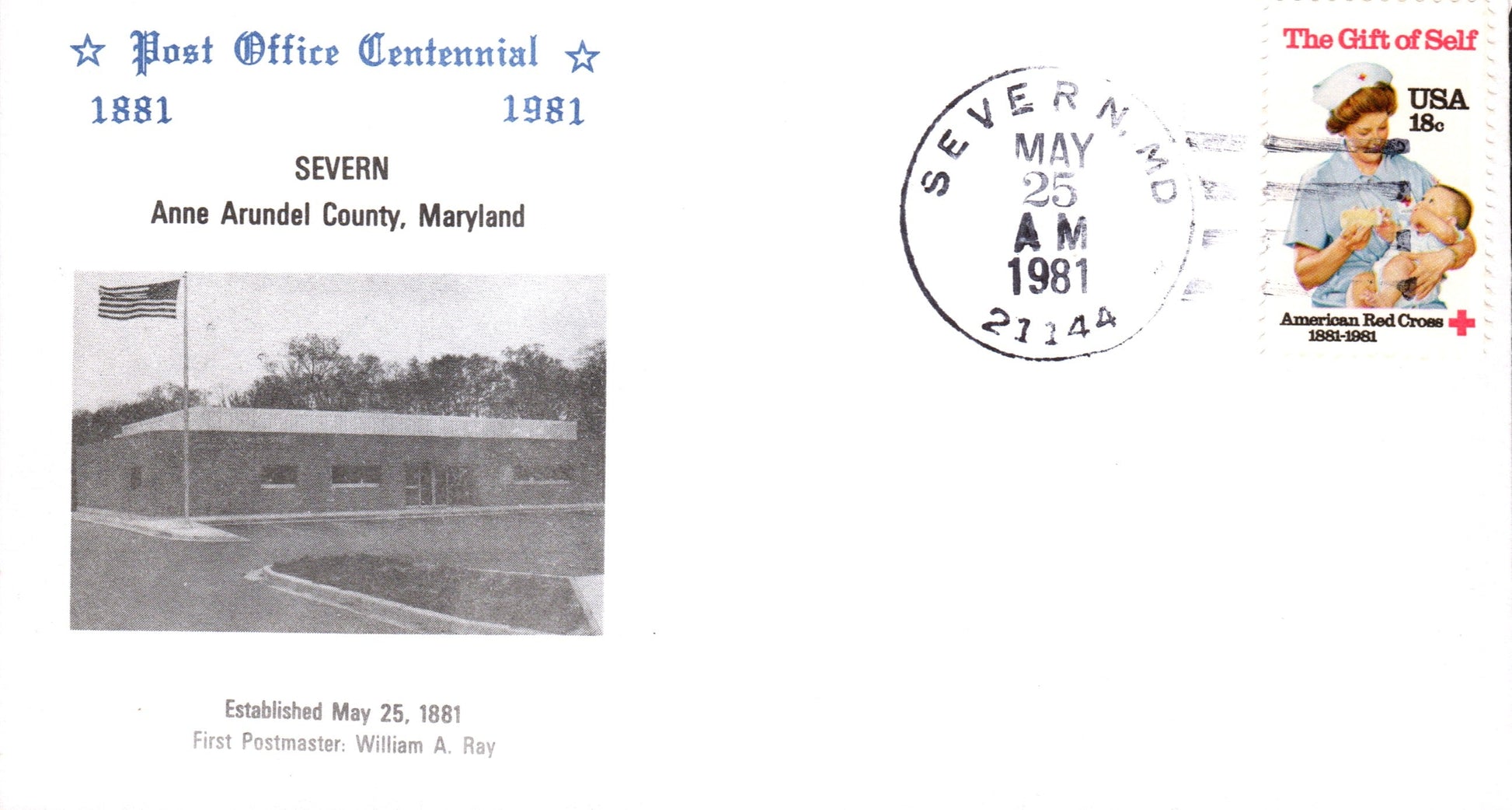 Severn 1981 4-bar on Centennial cover, cacheted with a photo of the post office