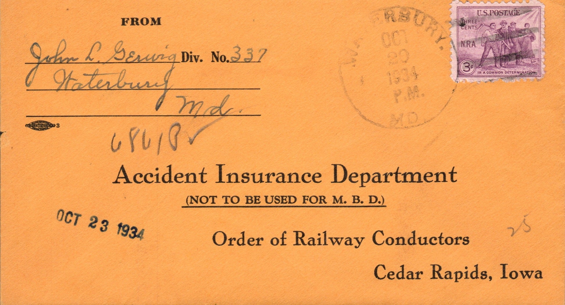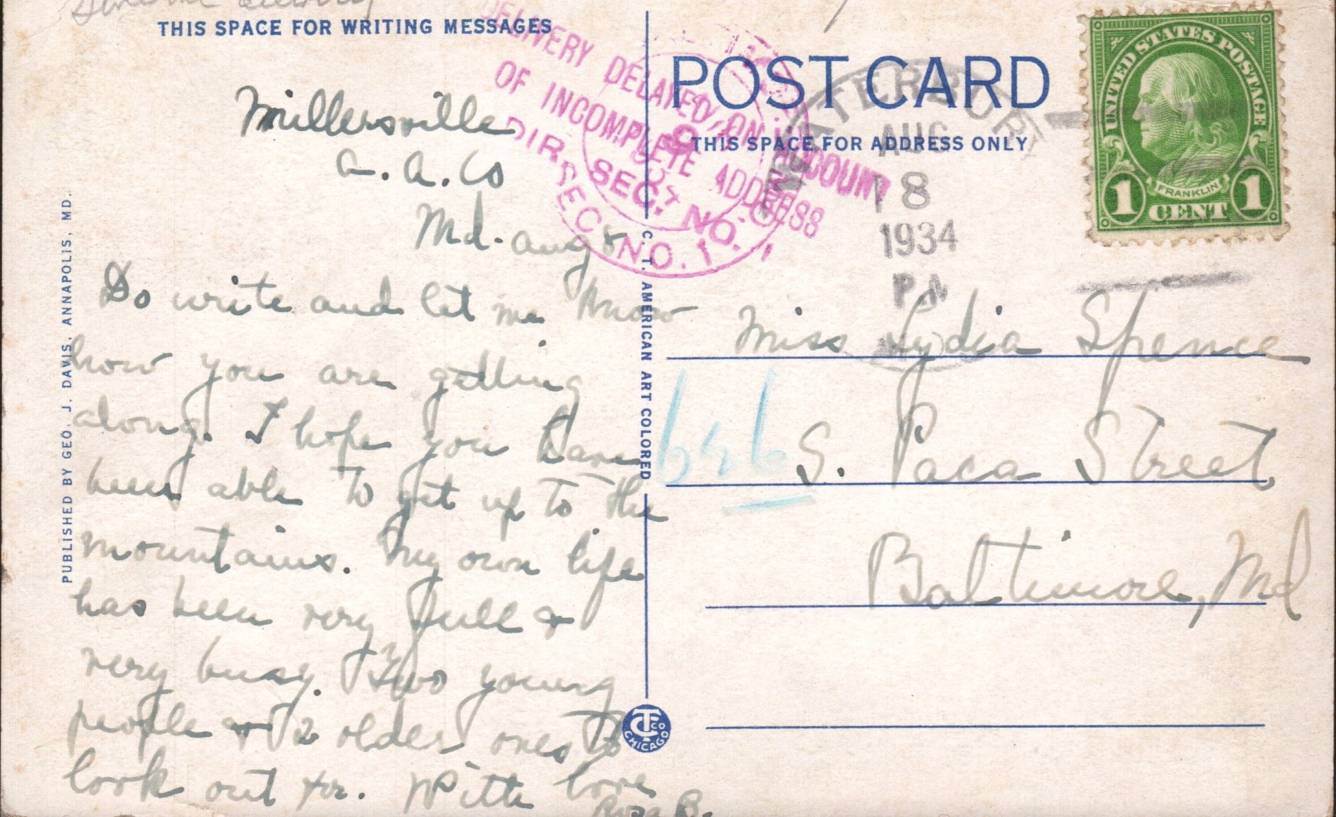Waterbury (1867-1937) 1934 4-bar on cover; 1934 4-bar on post card to Baltimore w/ 2 auxiliary markings “Delivery Delayed on Account of Incomplete Address” straight line, and “Sec. No.1” round dater