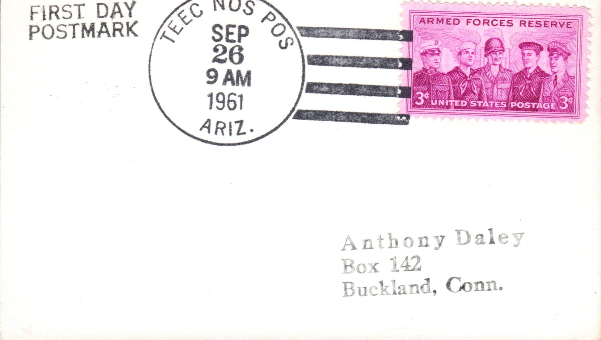 Teec Nos Pos 1961 4-bar on FD (of postal status) 3x5 card; 2004 round dater on unaddressed cover [Navajo Weaving stamp], hard to read