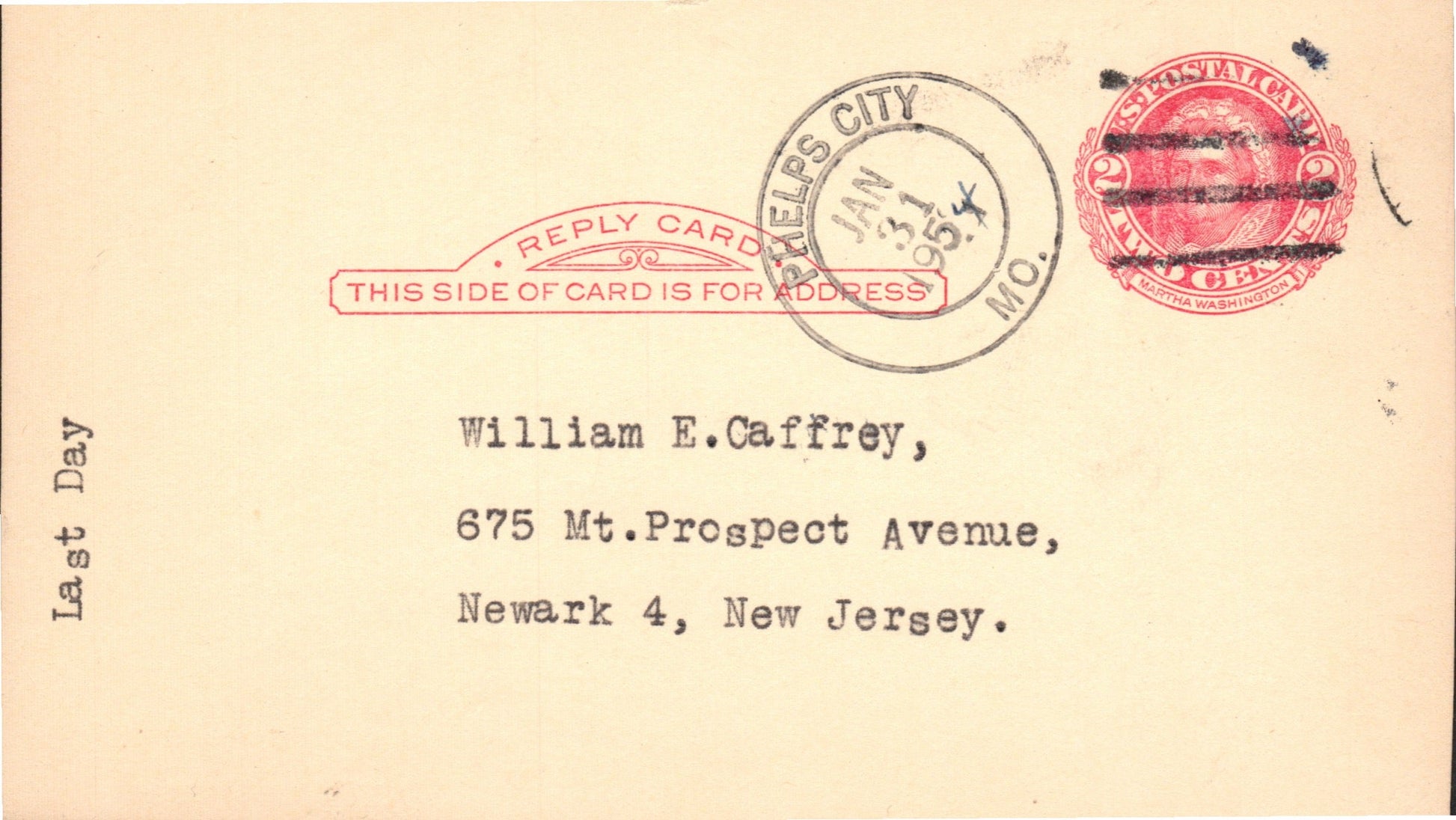 Phelps City ( -1954) 1954 round dater and 4 bars on LD Postal Card