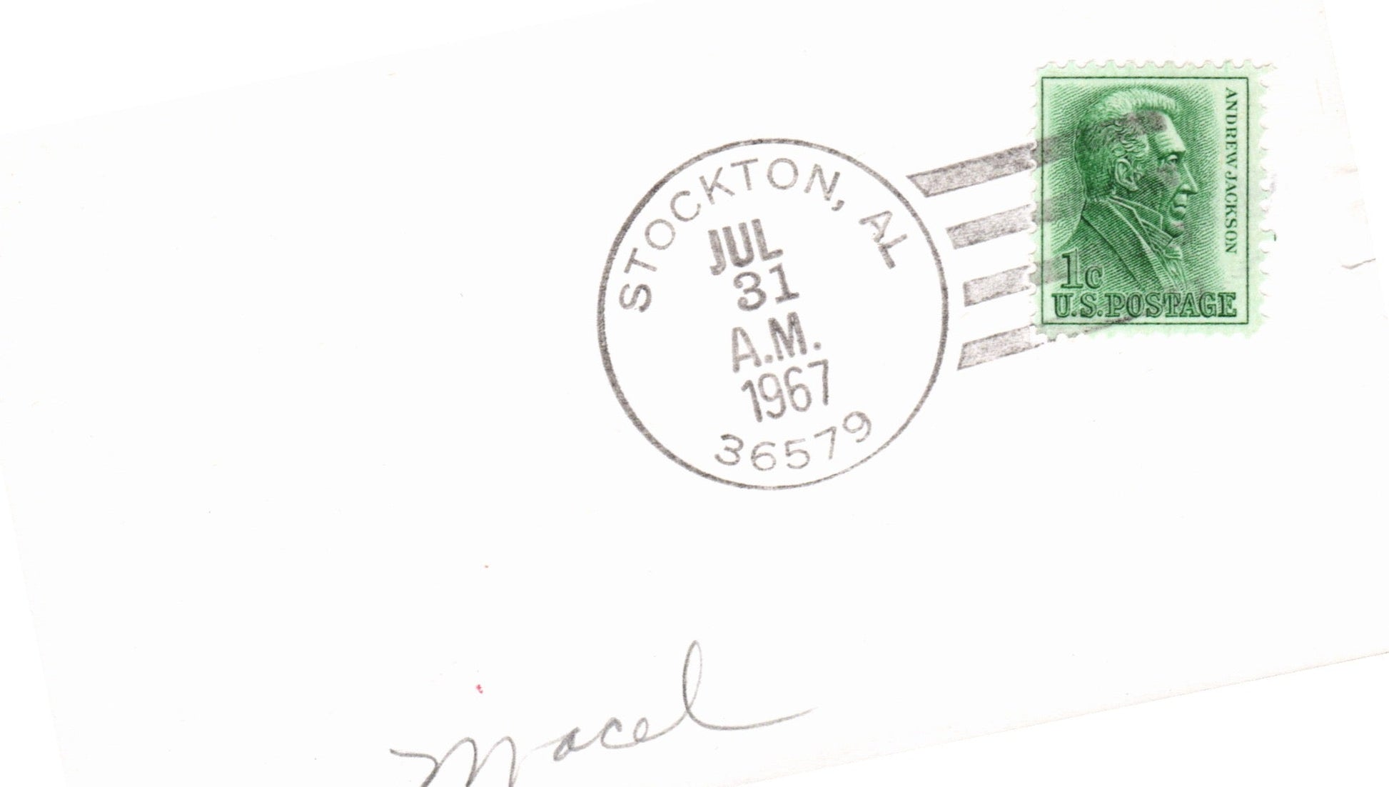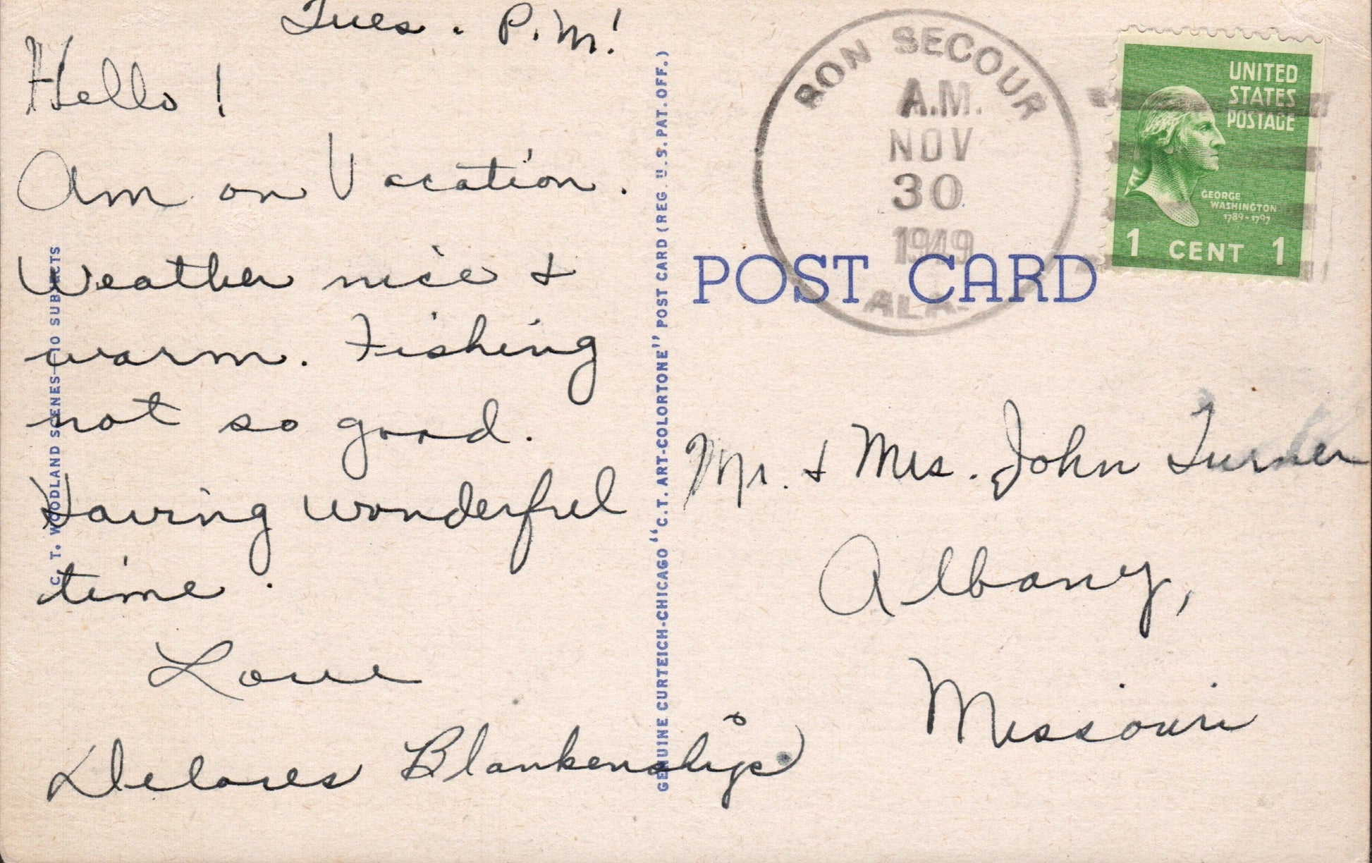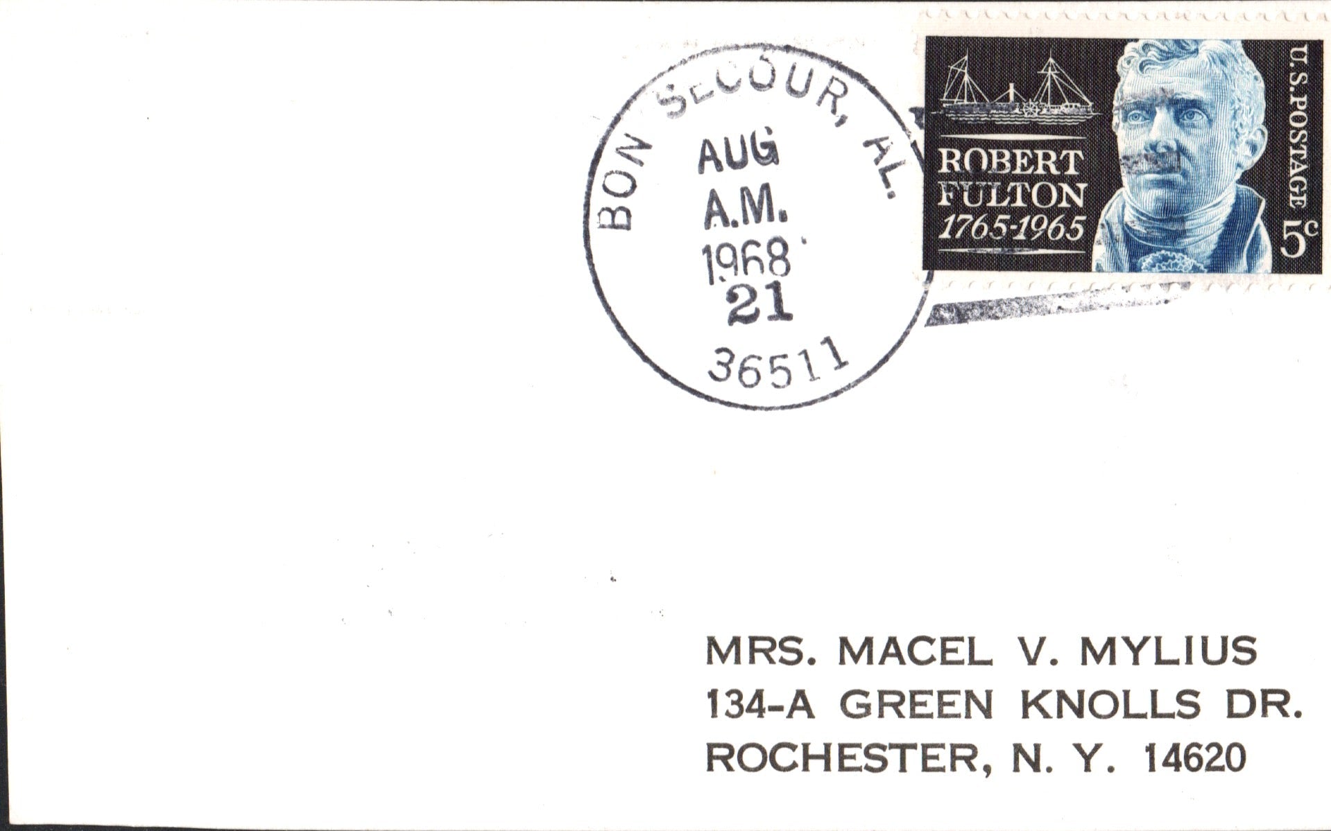 Bon Secour 1949 4-bar on post card; 1968 4-bar on 3x5 card