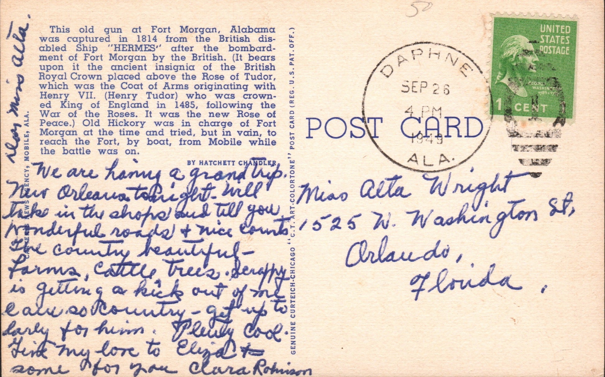 Point Clear misshaped 1909? Rec’d mark on post card, stamp removed.