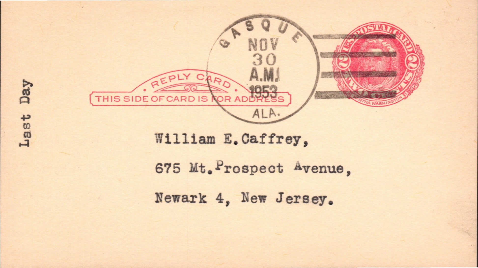 Gasque (1880-1953) 1953 4-bar on LD Postal Card
