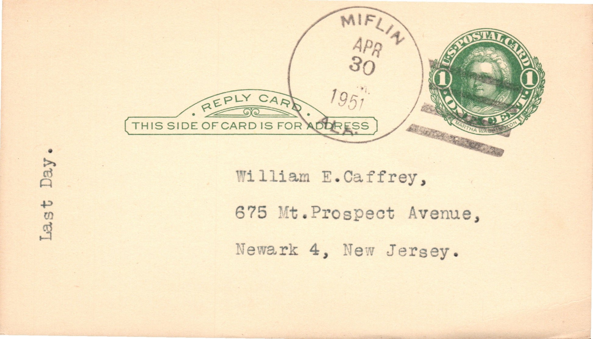 Miflin (1907-1951) 1951 4-bar on LD Postal Card