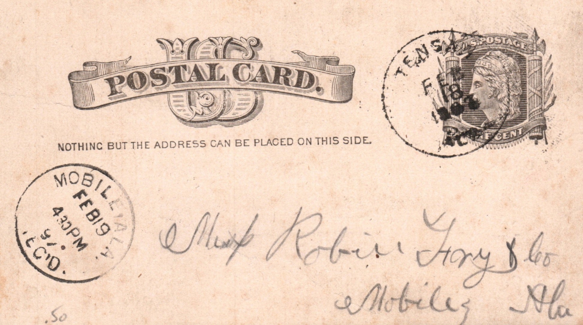 Tensaw poor 1897 cds on Postal Card, also Mobile Rec’d