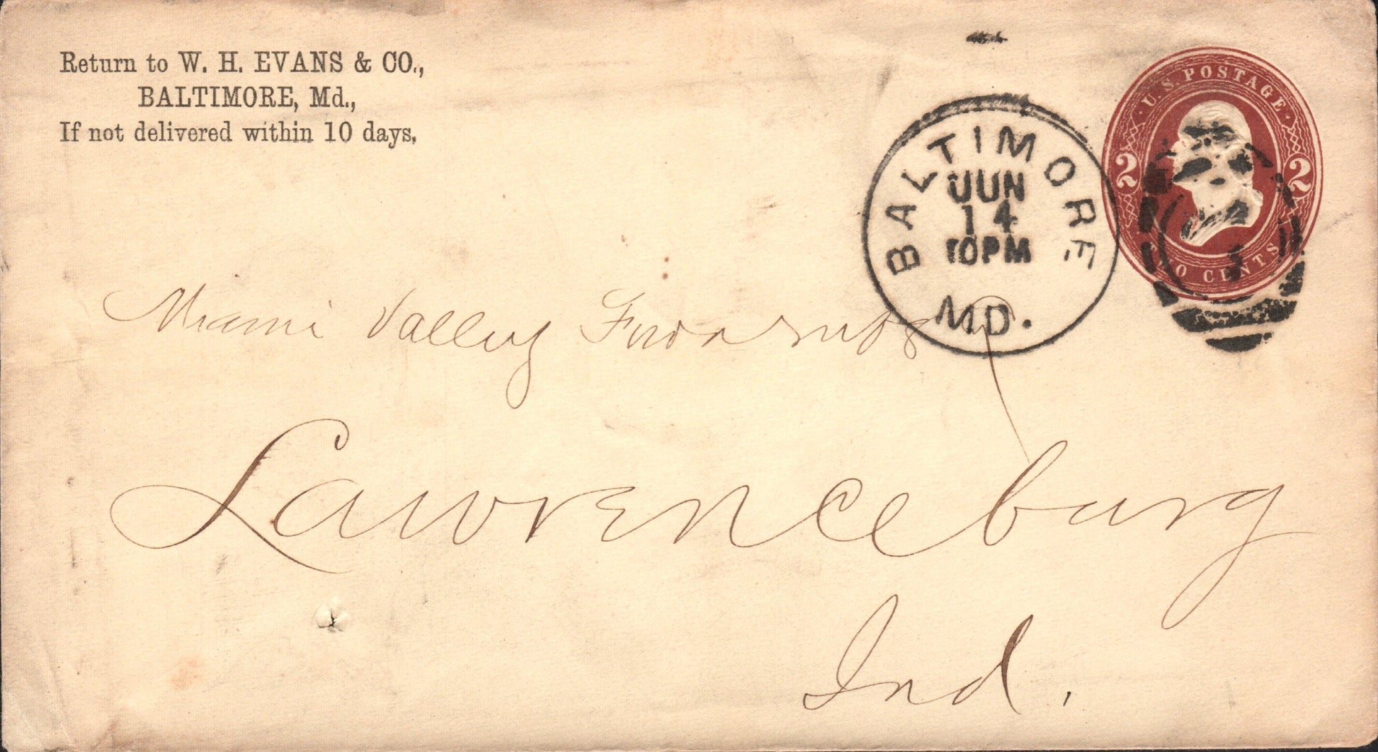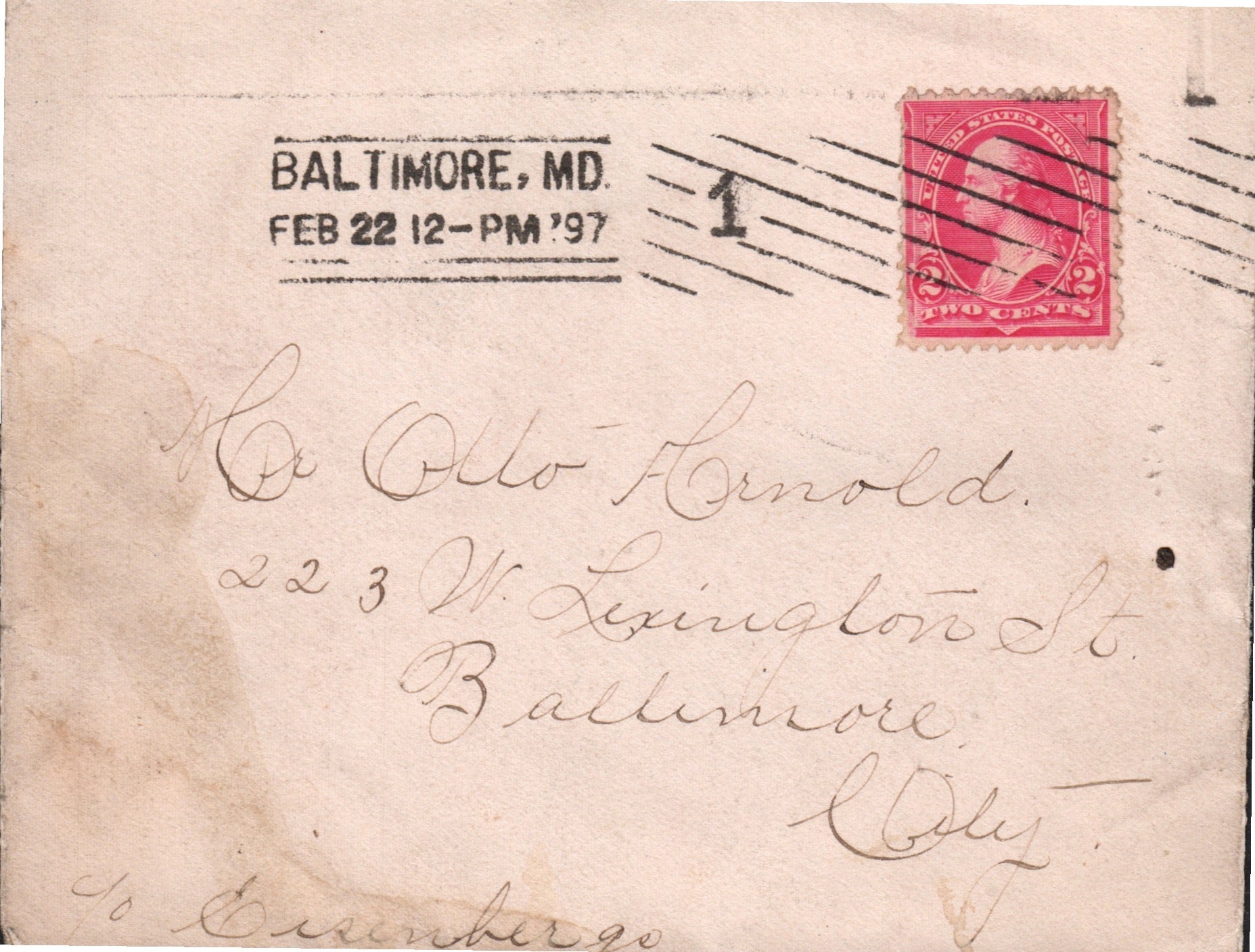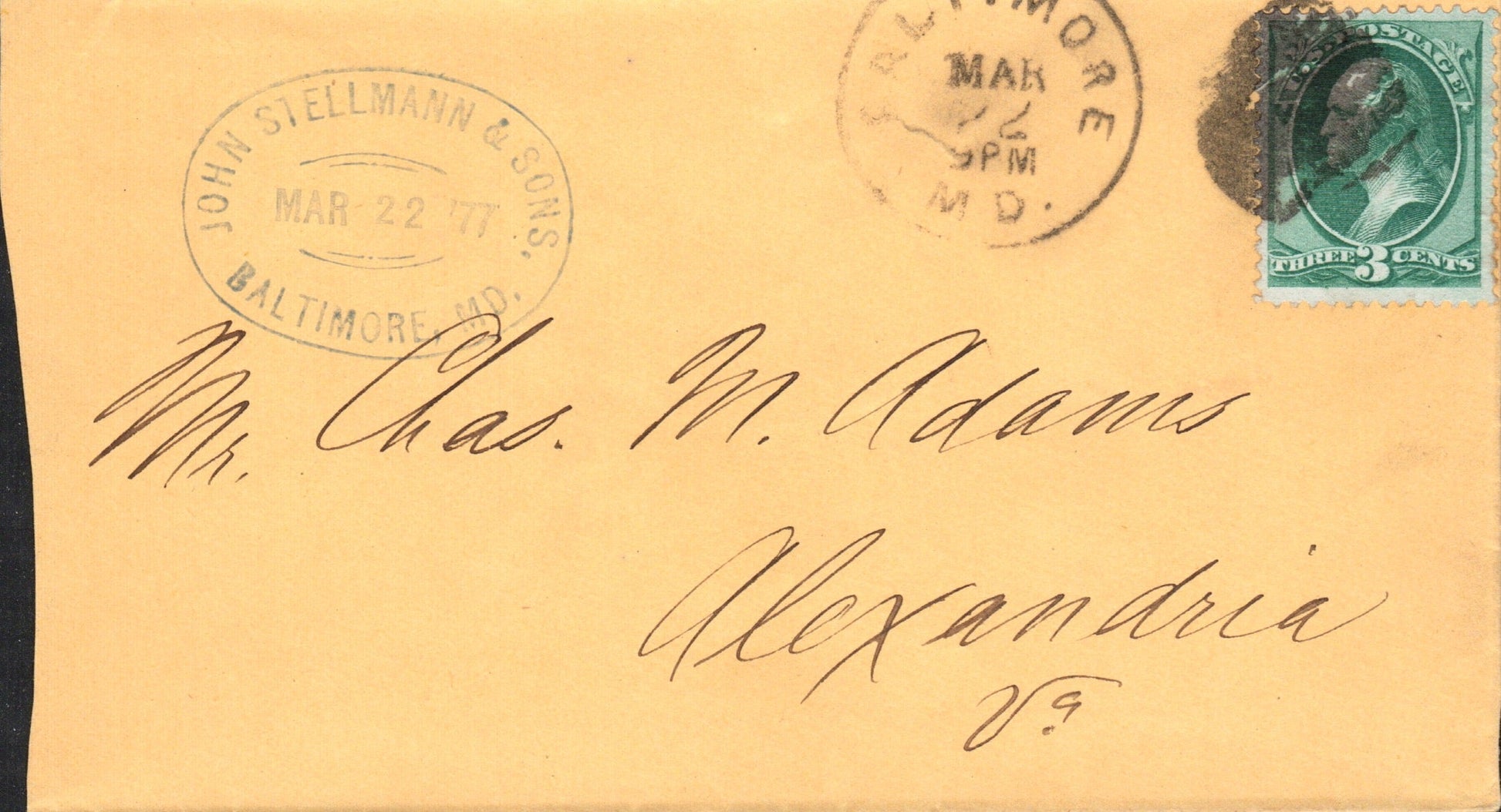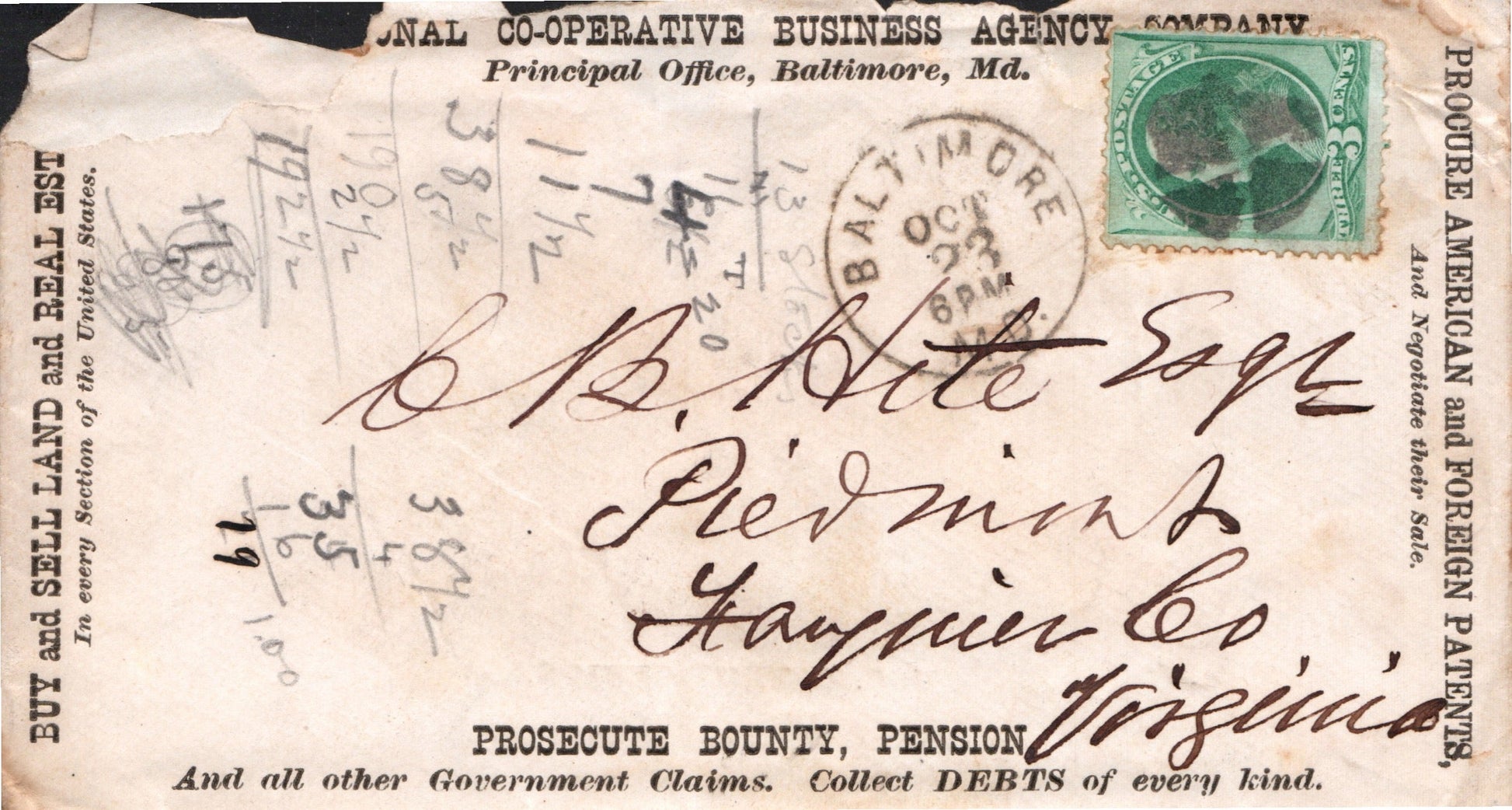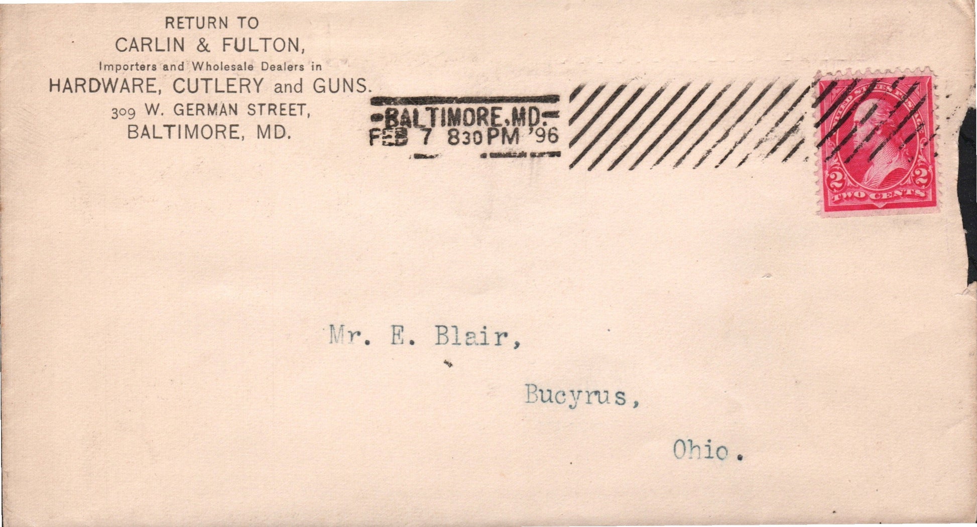 Baltimore c.1860s double circle and target killer on cover, military address; c.1870 cds on ratty cover, advertising on all margins and a picture of the U.S. Patent Office on the back; 1870s cds on all-over advertising cover, Baker Bros, Window Glass, - but front only; 1877 cds on cover, “John Stellman & Sons” corner; c.1880 duplex on small cover; 1885 duplex “C” on Postal Card, American Legion meeting information; 1880s duplex on cover, “W.H. Evans & Co.” corner; 1887 duplex “12” on cover; 1887 duplex “2” on cover, advertising for “Evans & Burnett’s Business College”; 1893 duple on Postal Card; 1896 machine cancel on cover, “Carlin & Fulton... Hardware, Cutlery and Guns” corner; 1896 machine cancel on Postal Card; 1897 duplex “1” on Postal Card; 1897 ,machine cancel on cover; 1899 machine cancel on toned cover, “N.T. Redman, Commission Merchant” corner and illustration of store; 1911 machine cancel on Postal Card “2C”, ad for”Kingan’s Meats”; 1912 machine cancel (4C) on Postal Card, ad for “J.J. Haines & Co., Wooden and Willow Ware and Floor Coverings”; 1918 machine slogan “Buy Now U.S. Government Bonds 3rd Liberty Loan” on post card; 1921 machine cancel on cover, “Wehr & Edwards Wholesale Lumber” corner; 1923 machine slogan “Better Homes Exposition” on post card [soldiers]; 1932 machine cancel on cover, “Railway Express Agency” corner; unreadable 1932 duplex on cover, “Young Men’s Boh. Dem. Club.” corner; 1933 machine cancel on window cover, “Bellair House Publishing” corner; 1933 machine cancel on cover, “Joseph L. Ruth, City Council” corner; 1933 machine cancel on cover, 1933 machine cancel on cover, “Poole Engineering & Machine Co.” corner; 1935 machine cancel on window cover, “Wilcox & Ziegler Coal” corner; 1936 Savings Bonds slogan on cacheted cover, Baltimore Philatelic Society”; 1943 machine slogan “Buy War Savings Bonds and Stamps” on tiny window cover; 1952 machine FD of 3¢ Rail Transportation stamp on cover; 1964 machine FD of 1 ct. Washington stamp on cacheted cover; “Baltimore MD precancel on 1960s Christmas stamp; 1969 1A machine slogan for Asthma Week on cover; 1969 2B machine cancel on cover