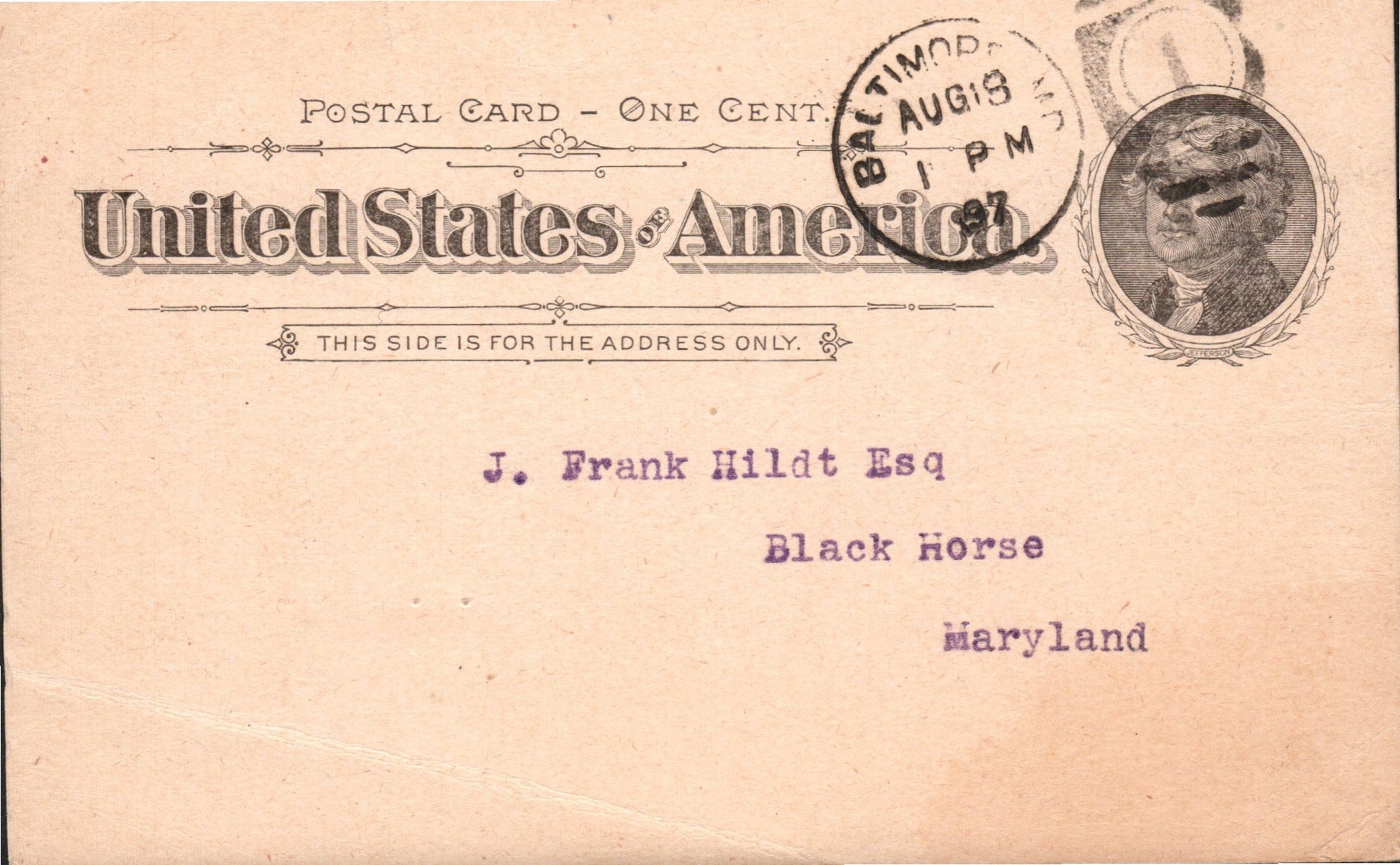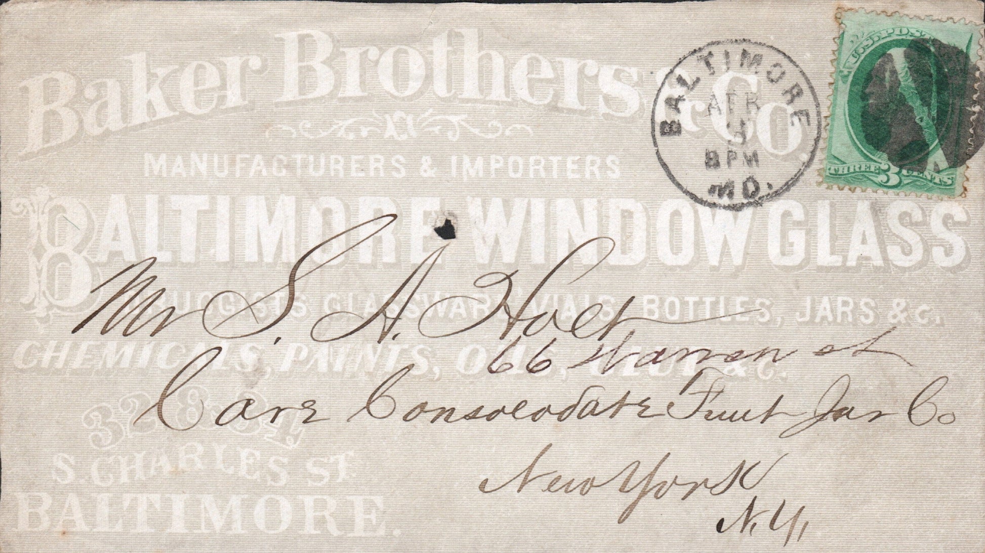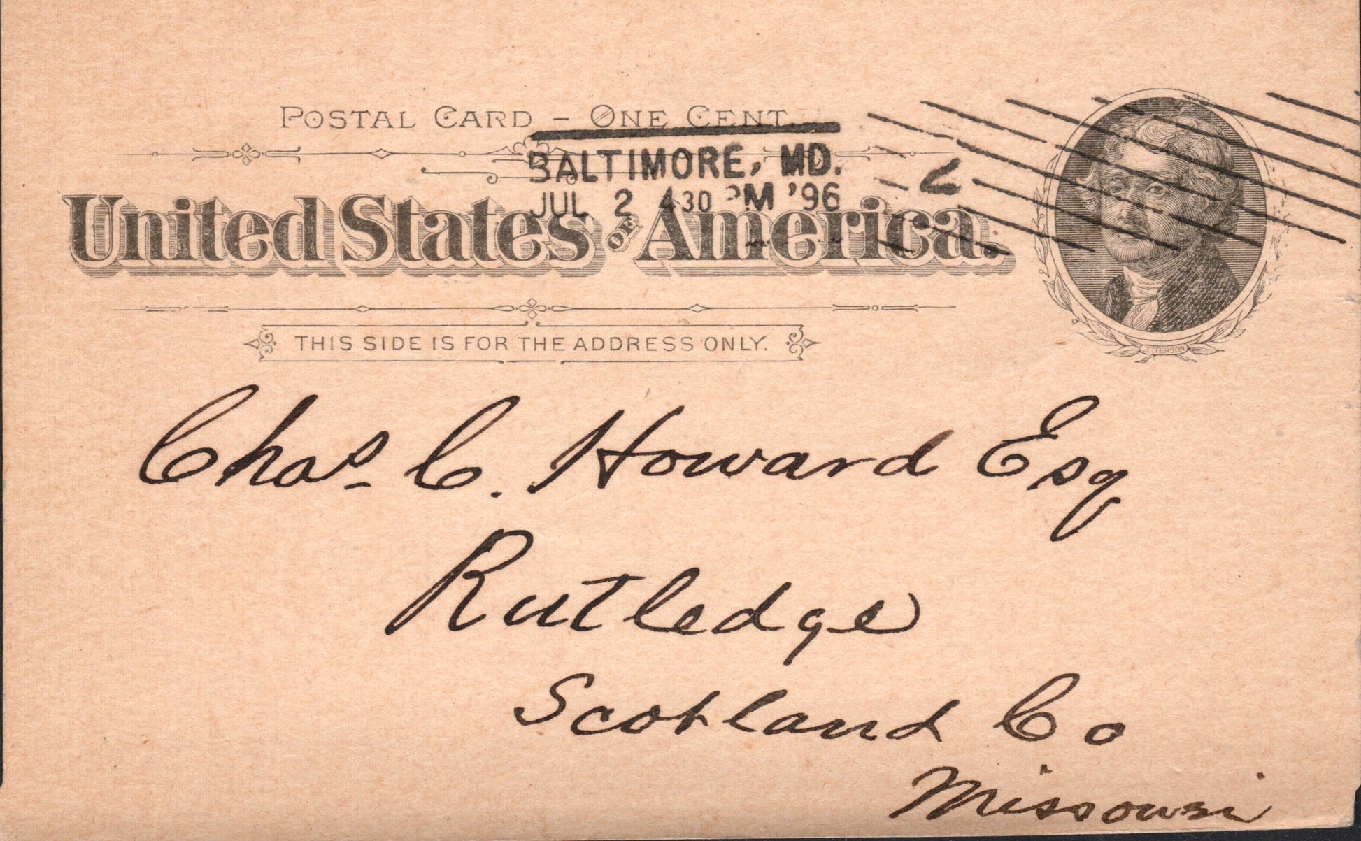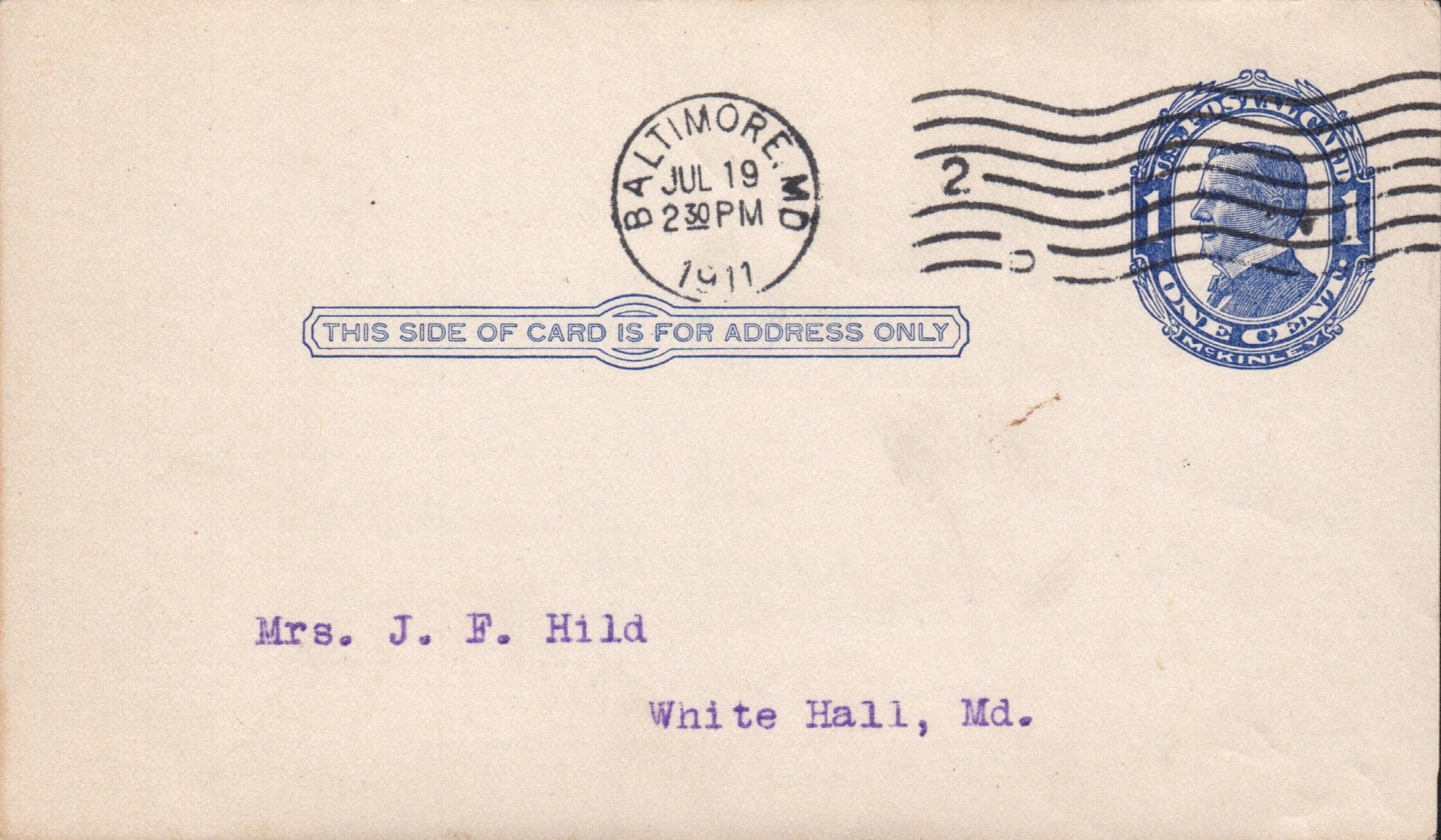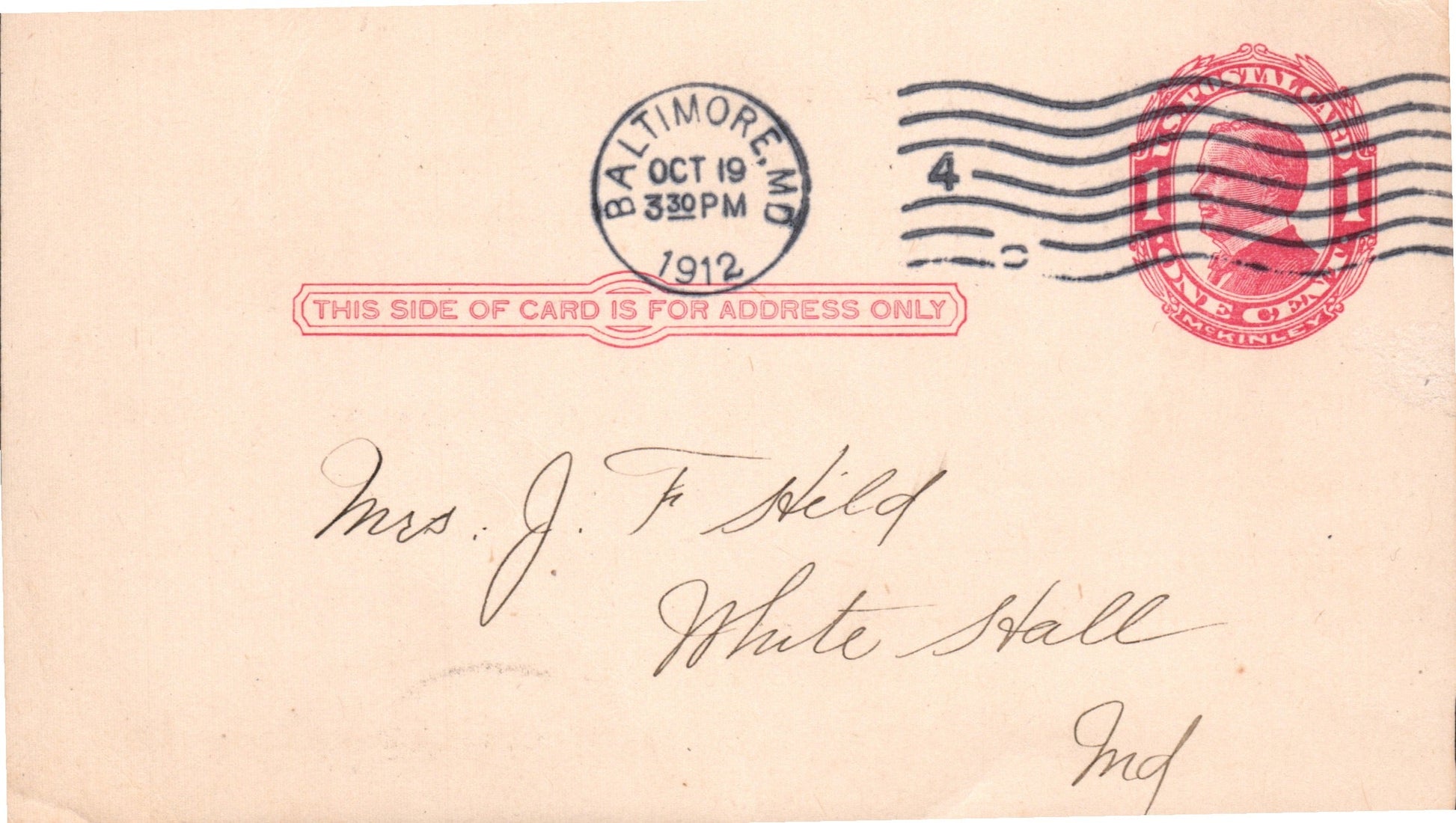 Baltimore c.1860s double circle and target killer on cover, military address; c.1870 cds on ratty cover, advertising on all margins and a picture of the U.S. Patent Office on the back; 1870s cds on all-over advertising cover, Baker Bros, Window Glass, - but front only; 1877 cds on cover, “John Stellman & Sons” corner; c.1880 duplex on small cover; 1885 duplex “C” on Postal Card, American Legion meeting information; 1880s duplex on cover, “W.H. Evans & Co.” corner; 1887 duplex “12” on cover; 1887 duplex “2” on cover, advertising for “Evans & Burnett’s Business College”; 1893 duple on Postal Card; 1896 machine cancel on cover, “Carlin & Fulton... Hardware, Cutlery and Guns” corner; 1896 machine cancel on Postal Card; 1897 duplex “1” on Postal Card; 1897 ,machine cancel on cover; 1899 machine cancel on toned cover, “N.T. Redman, Commission Merchant” corner and illustration of store; 1911 machine cancel on Postal Card “2C”, ad for”Kingan’s Meats”; 1912 machine cancel (4C) on Postal Card, ad for “J.J. Haines & Co., Wooden and Willow Ware and Floor Coverings”; 1918 machine slogan “Buy Now U.S. Government Bonds 3rd Liberty Loan” on post card; 1921 machine cancel on cover, “Wehr & Edwards Wholesale Lumber” corner; 1923 machine slogan “Better Homes Exposition” on post card [soldiers]; 1932 machine cancel on cover, “Railway Express Agency” corner; unreadable 1932 duplex on cover, “Young Men’s Boh. Dem. Club.” corner; 1933 machine cancel on window cover, “Bellair House Publishing” corner; 1933 machine cancel on cover, “Joseph L. Ruth, City Council” corner; 1933 machine cancel on cover, 1933 machine cancel on cover, “Poole Engineering & Machine Co.” corner; 1935 machine cancel on window cover, “Wilcox & Ziegler Coal” corner; 1936 Savings Bonds slogan on cacheted cover, Baltimore Philatelic Society”; 1943 machine slogan “Buy War Savings Bonds and Stamps” on tiny window cover; 1952 machine FD of 3¢ Rail Transportation stamp on cover; 1964 machine FD of 1 ct. Washington stamp on cacheted cover; “Baltimore MD precancel on 1960s Christmas stamp; 1969 1A machine slogan for Asthma Week on cover; 1969 2B machine cancel on cover